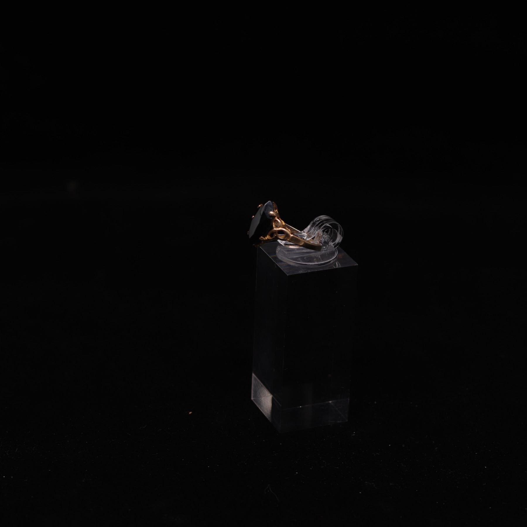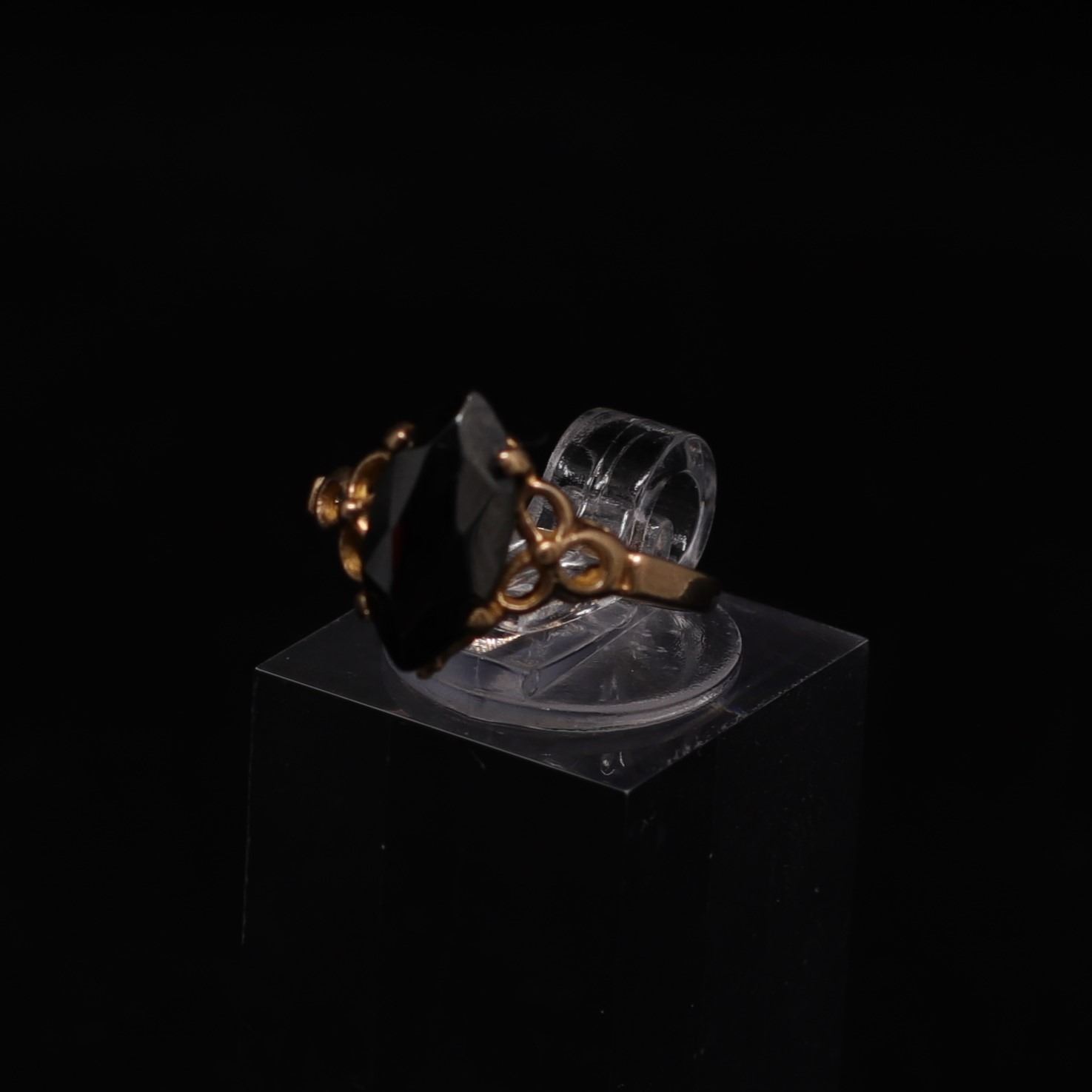 A vintage 10K yellow gold ring featuring a marquise-cut hematite gemstone. The stone is set in a raised prong setting with decorative gold bead accents along the shoulders. Hematite, known for its metallic luster and deep steel-gray tone, was a popular choice for men’s and women’s rings throughout the mid-20th century. This example combines elegant craftsmanship with a bold, dark stone that reflects light with a subtle mirror-like effect.