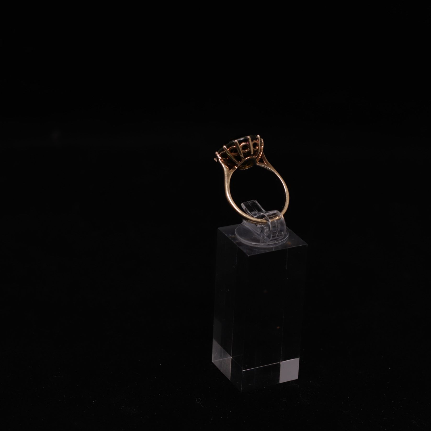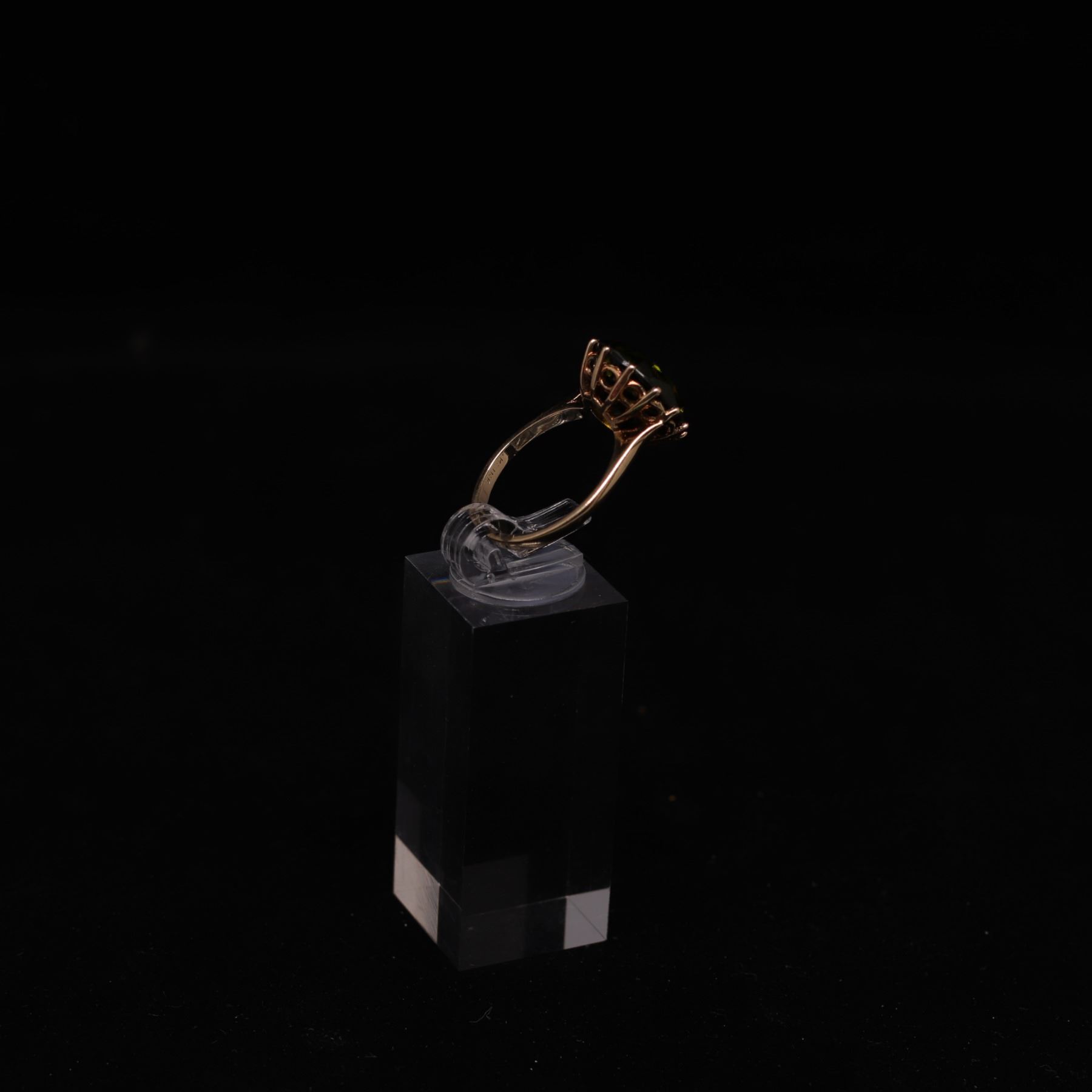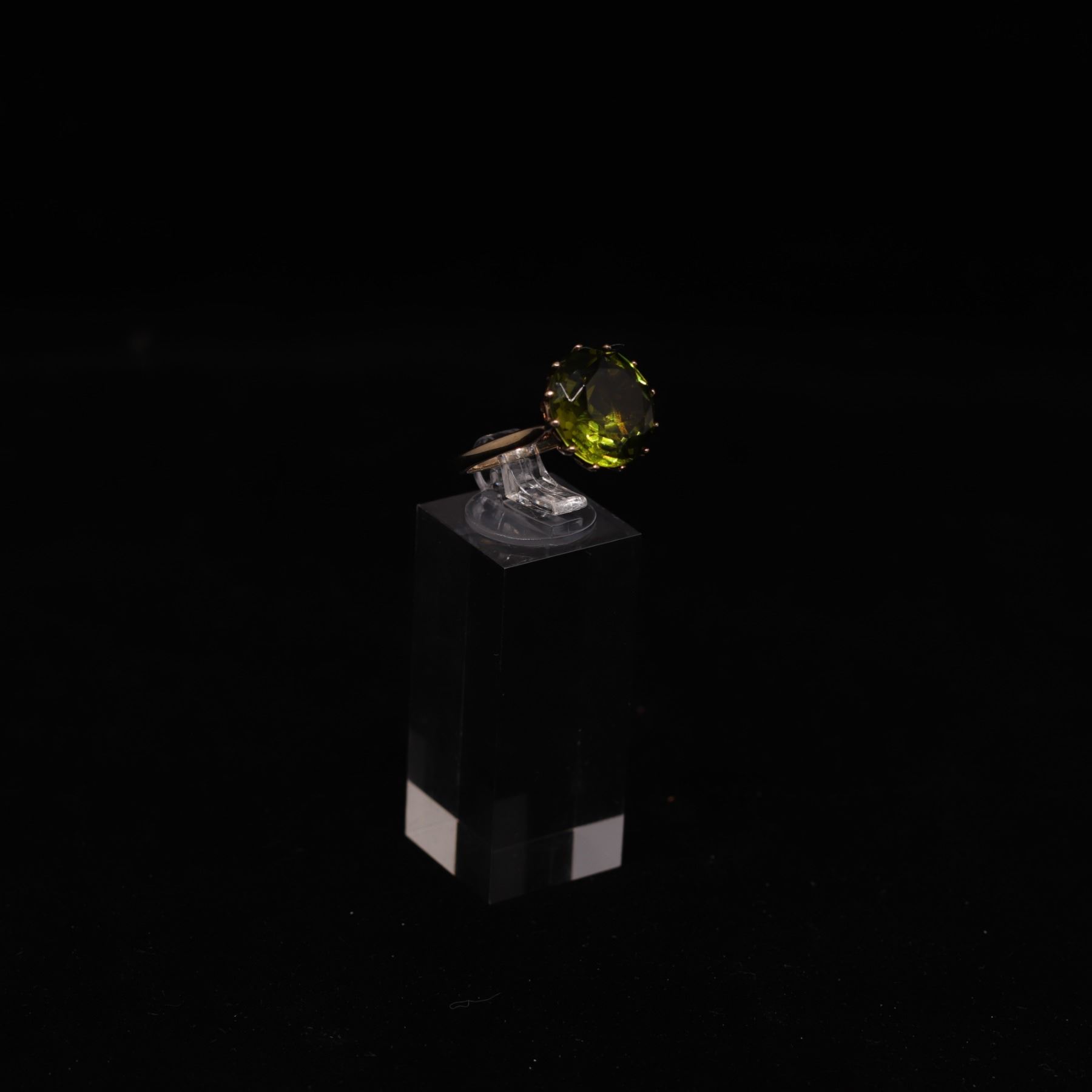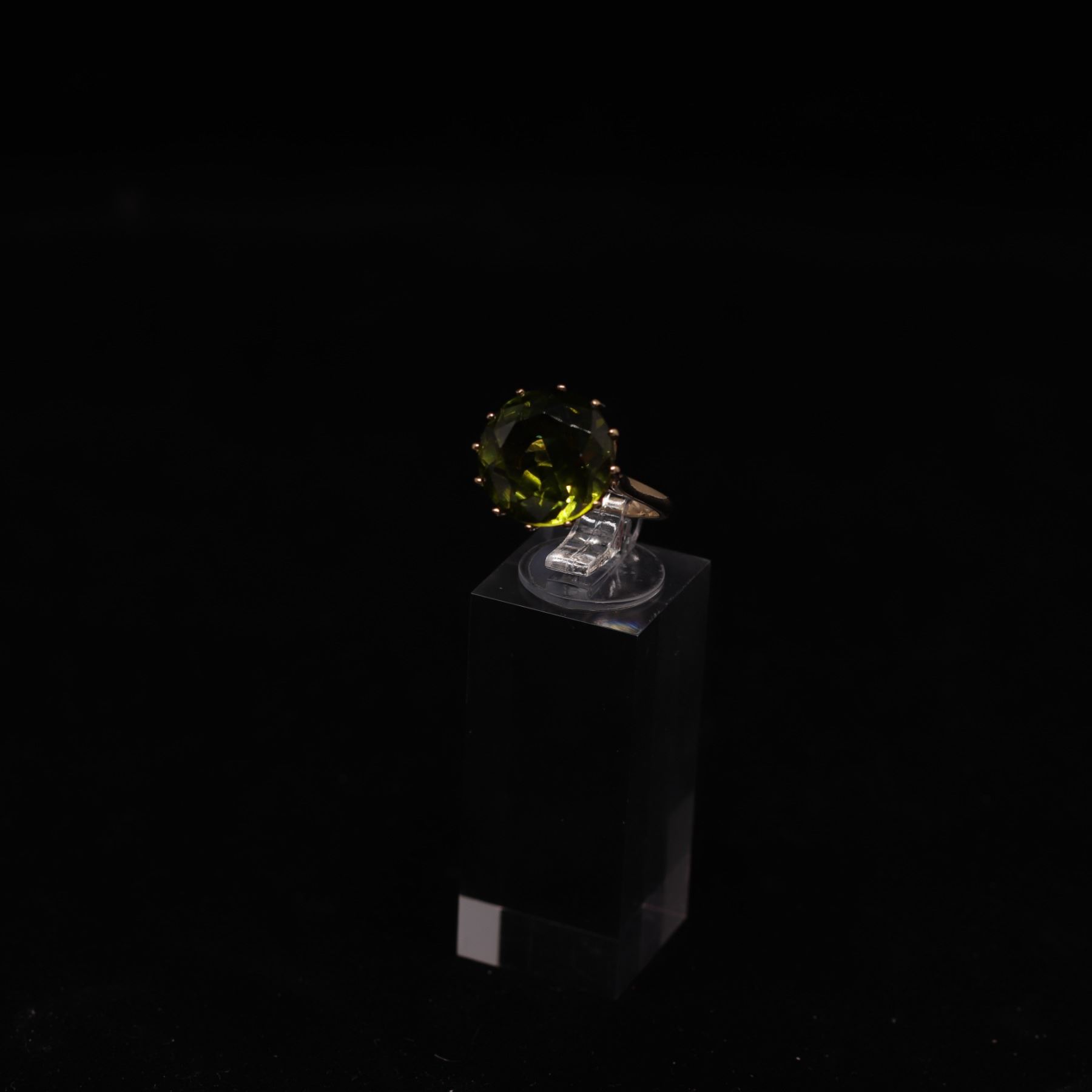 A striking vintage 10K yellow gold ring stamped 10K L. Kline, with an additional interior stamp featuring a diamond hallmark. The ring features a large, oval-cut green gemstone of tested natural origin. Based on its distinct yellow-green hue and brilliance, the stone is consistent with peridot (precious variety of olivine), a gemstone prized for its vibrant summer-green color and long use in fine jewellery. The gem is securely set in a tall, multi-prong claw setting, allowing light to pass through and enhance brilliance. In Alberta (and specifically Edmonton) there was a long-running family jewelry business, H.B. Kline & Co. founded in 1904 on Jasper Avenue. After H.B. Kline’s death in 1933, his son Louis (“L.”) Kline continued the store for decades. The firm and its history are documented by the Jewish Archives & Historical Society of Edmonton & Northern Alberta and by press coverage when Fort Edmonton Park recreated the historic H.B. Kline Jewelers storefront.