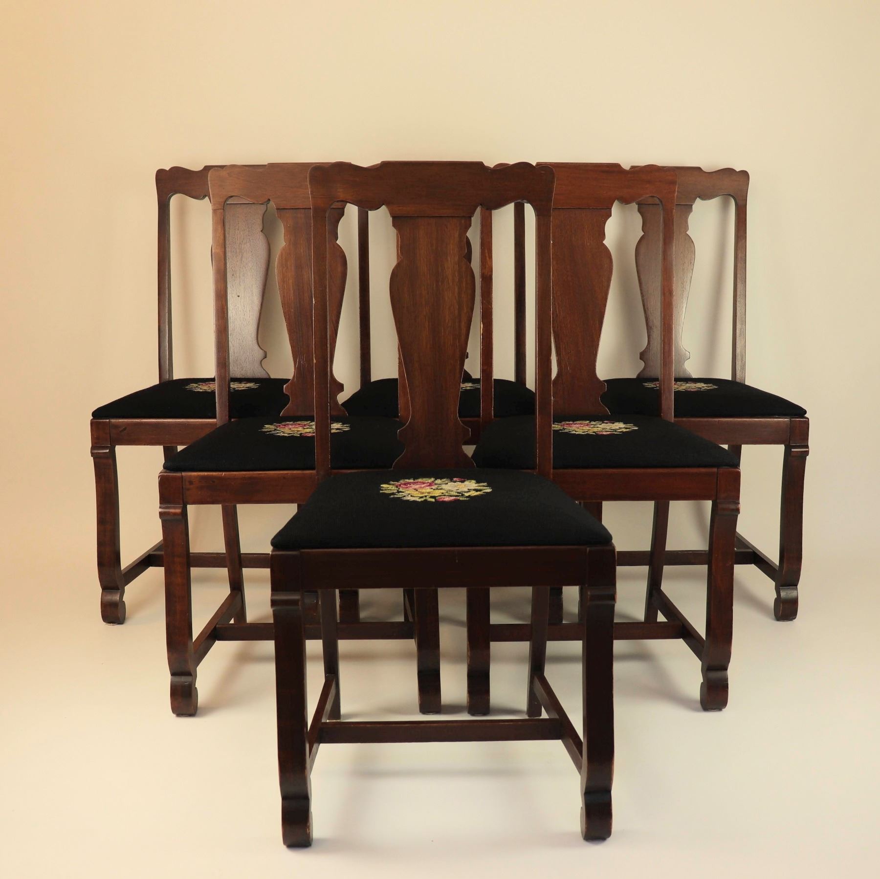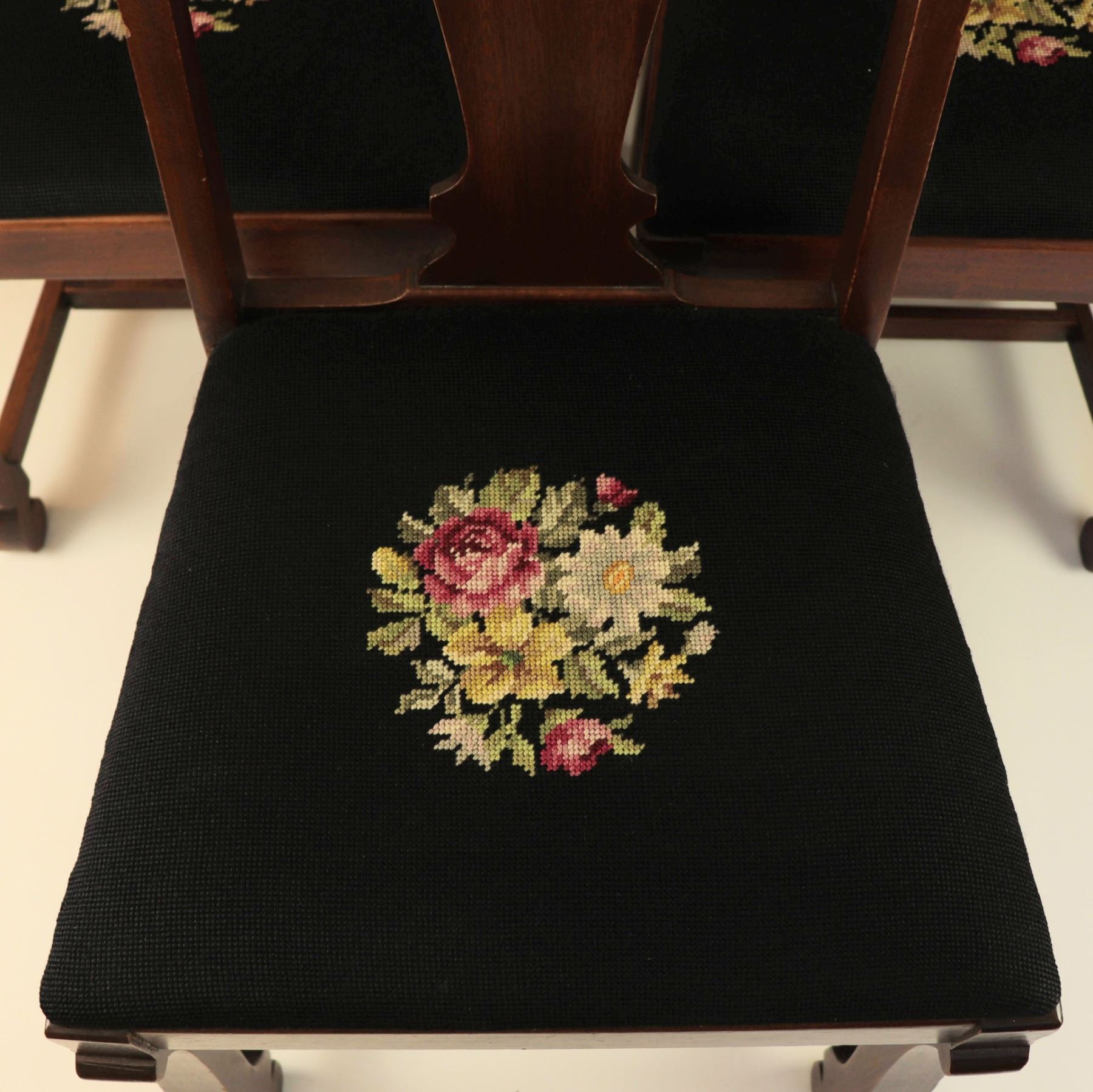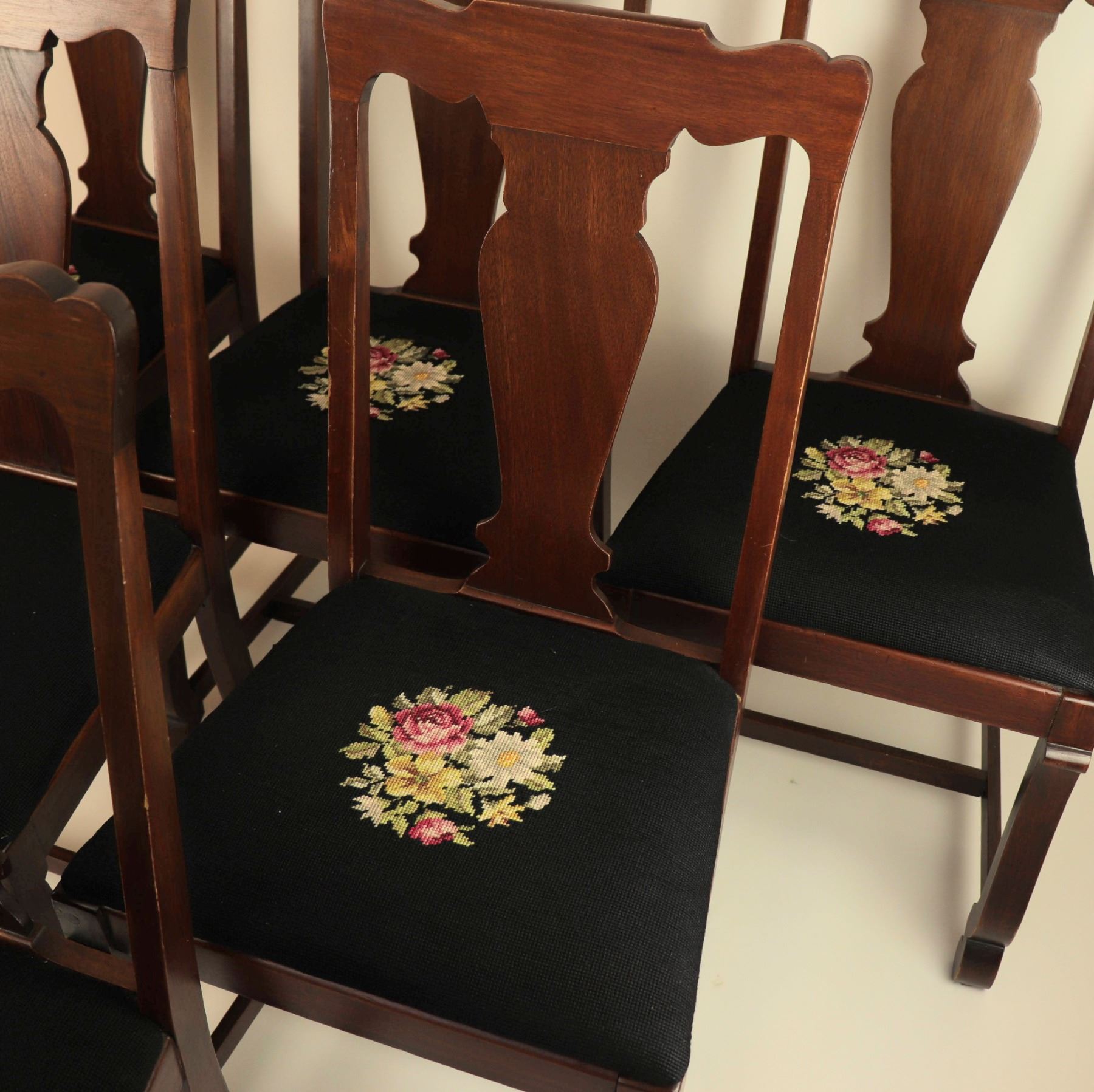 Set of 6 dining room chair, interpretation of Empire style. All 6 chairs are in very good condition and sturdy with hand embroidered needle point seats. Matches lot # 55 and 56