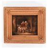 Attributed to A. Leggett (British school, 19th century), oil on panel depicting an intimate cottage interior with three figures gathered around a candlelit table, rendered in warm browns and reds in the Victorian narrative tradition. Signed A. Leggett and presented in an ornate gilt-composition frame. Surface with age-appropriate craquelure and minor abrasions; frame with rubbing, small chips and losses to ornament.