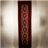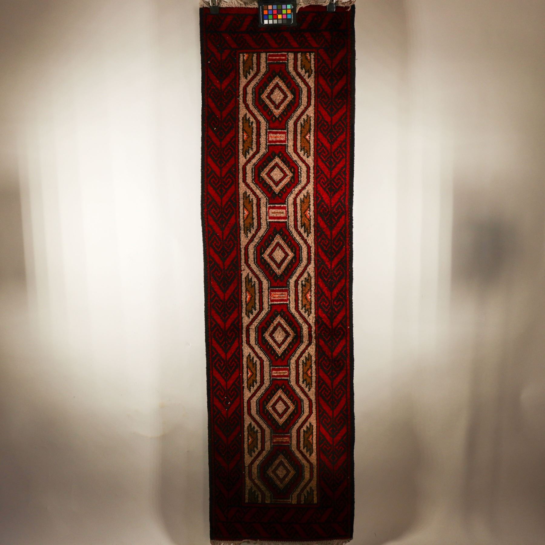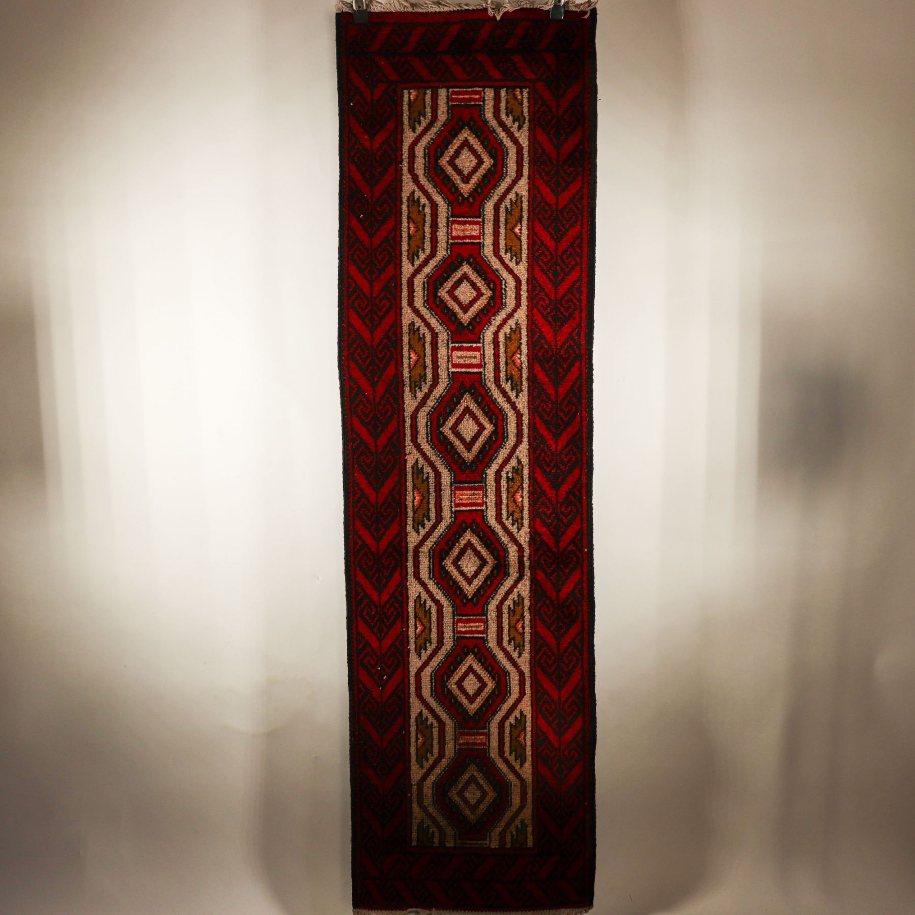 Afghan or Central Asian tribal hand-knotted wool runner, late 20th century, the narrow ivory central panel woven with a column of linked octagonal and diamond medallions in red, camel, green and black, flanked by angular hooked motifs and enclosed by red borders of repeating geometric devices, finished with fringed ends. Strong, saturated palette and graphic tribal design, suitable as a hallway or accent runner. Approx. 21 in. x 72 in. Overall good condition with even pile, fringes lightly frayed, minor edge wear and typical small irregularities of handwoven production; no major repairs or losses visible.