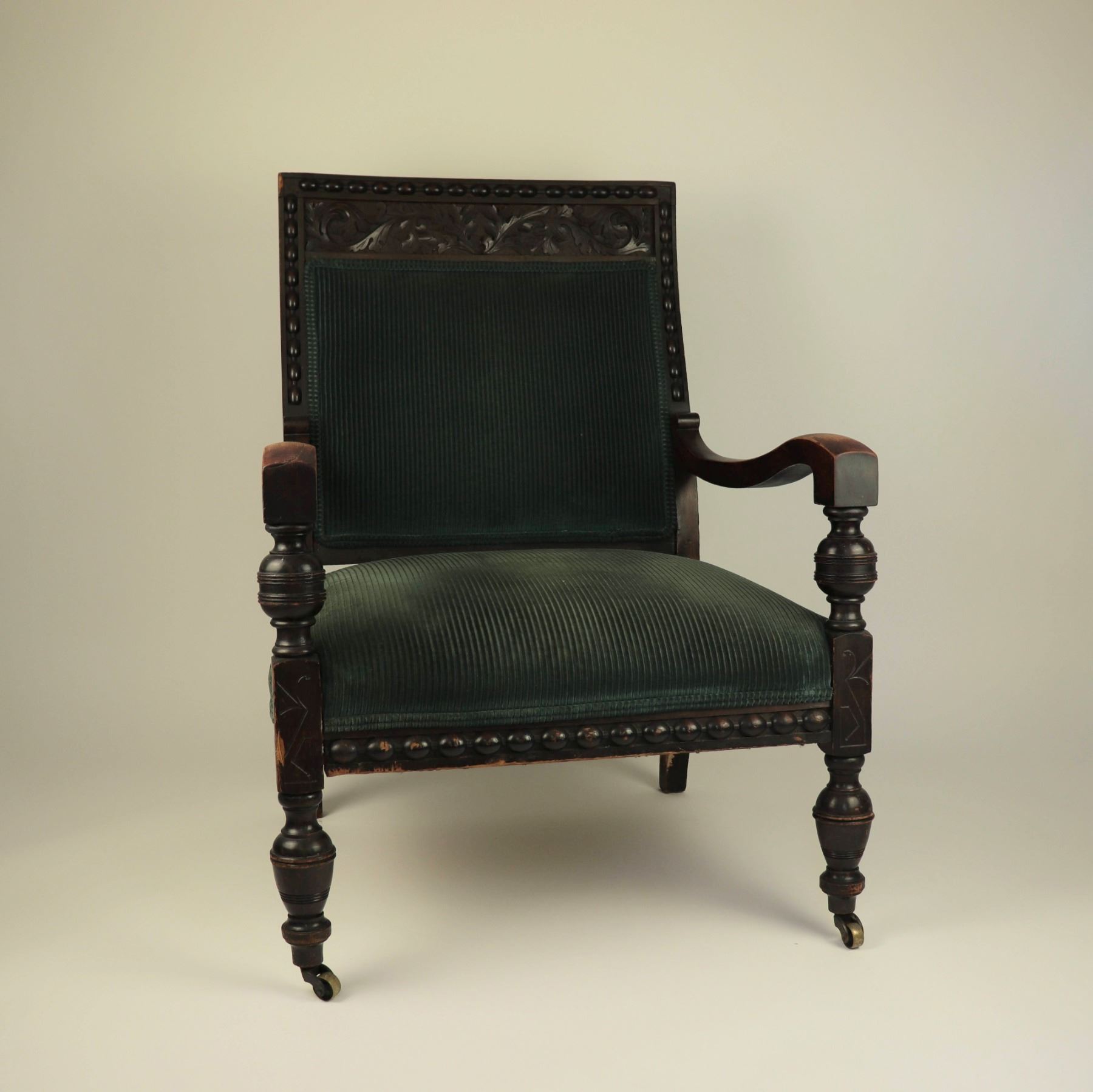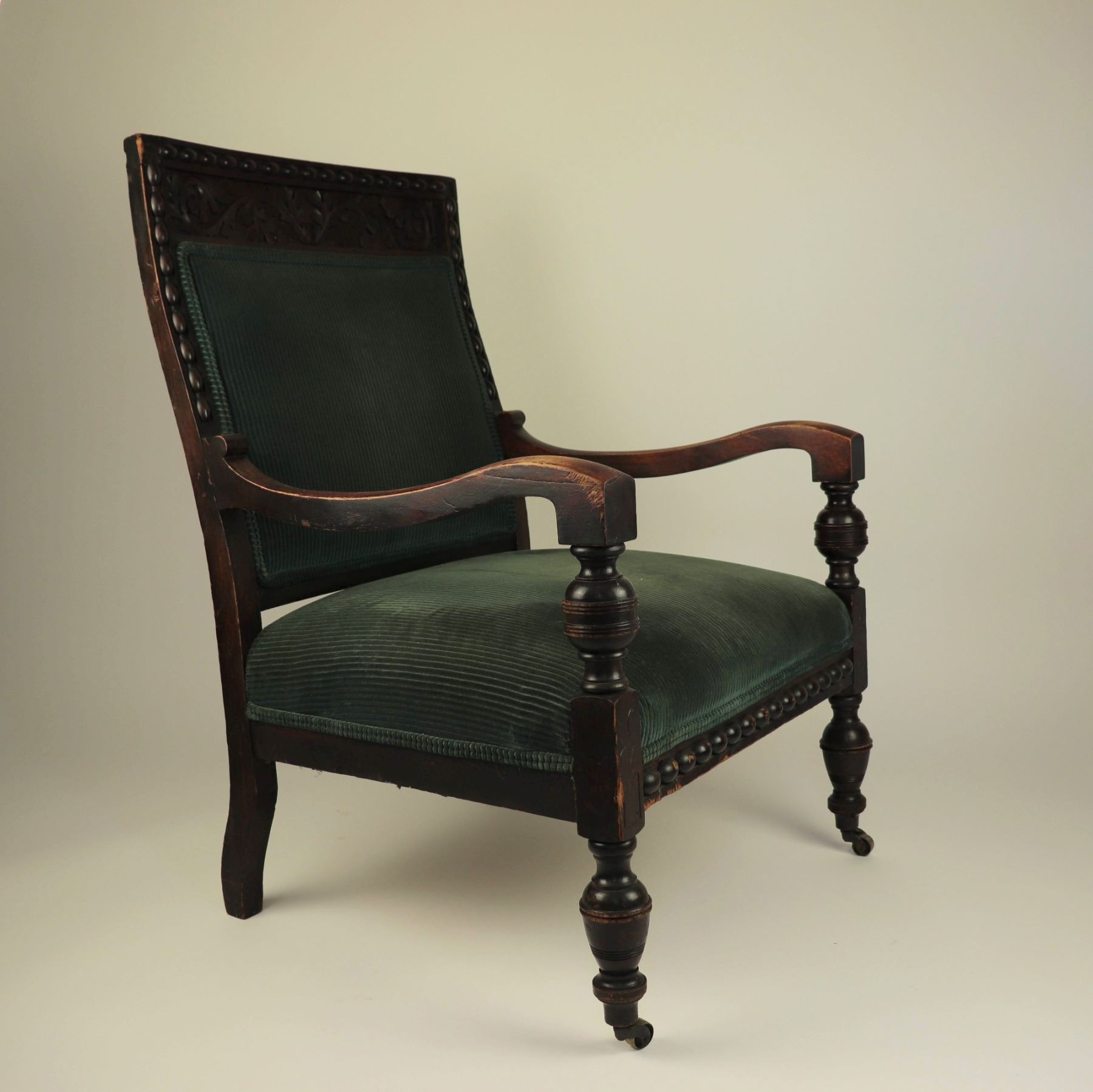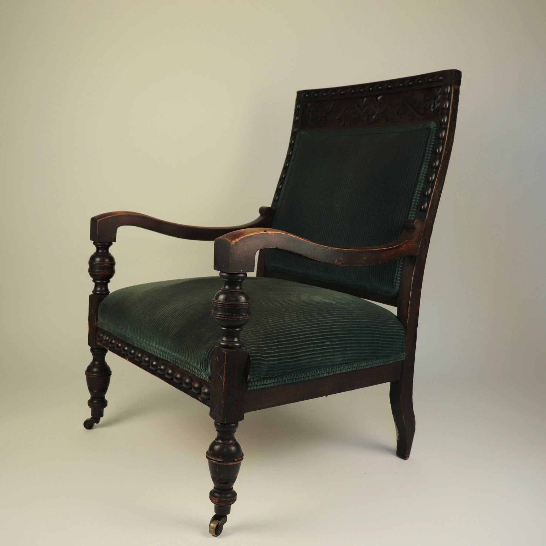 Victorian armchair on brass casters. Good original condition, some wear to the finish. Upholstery in good condition.