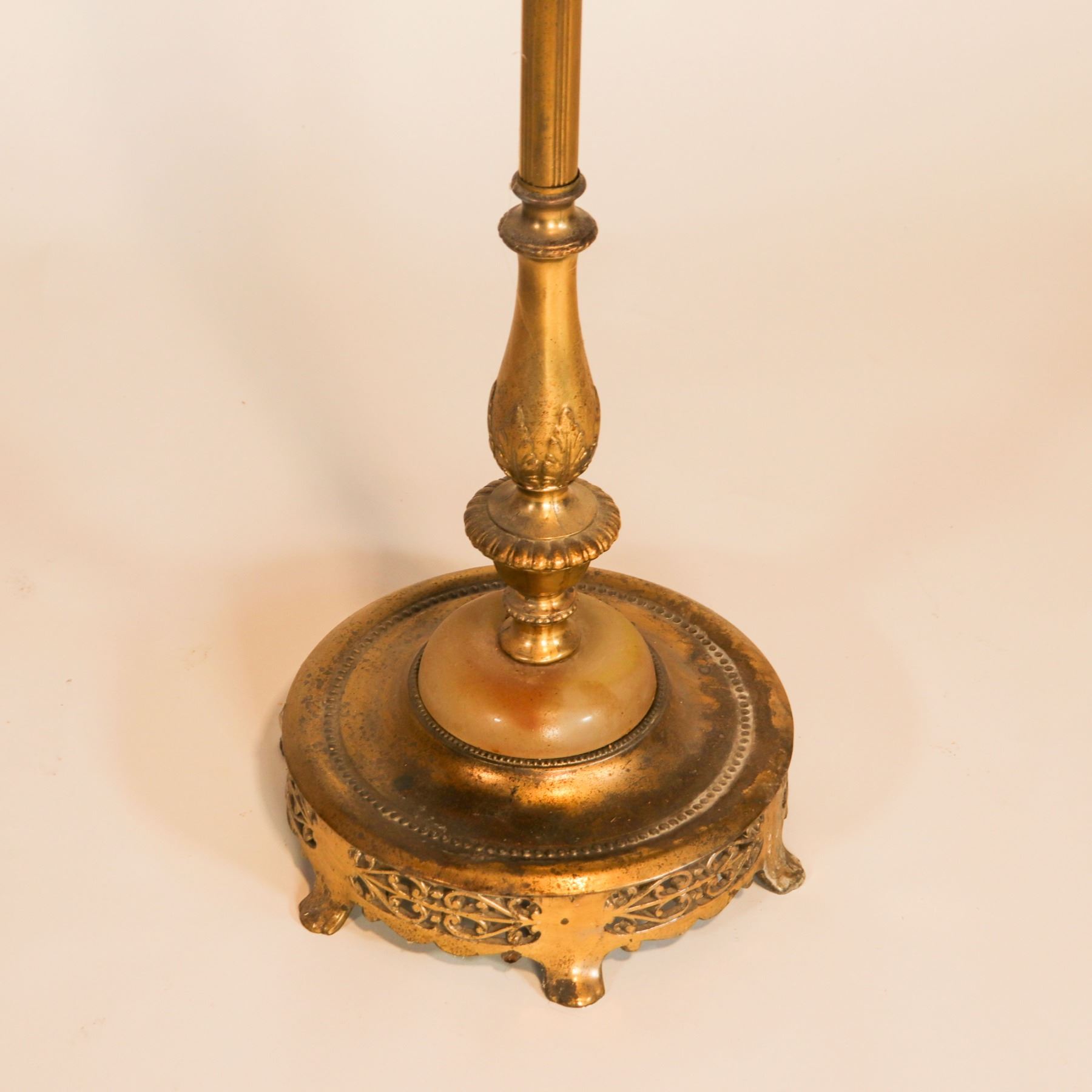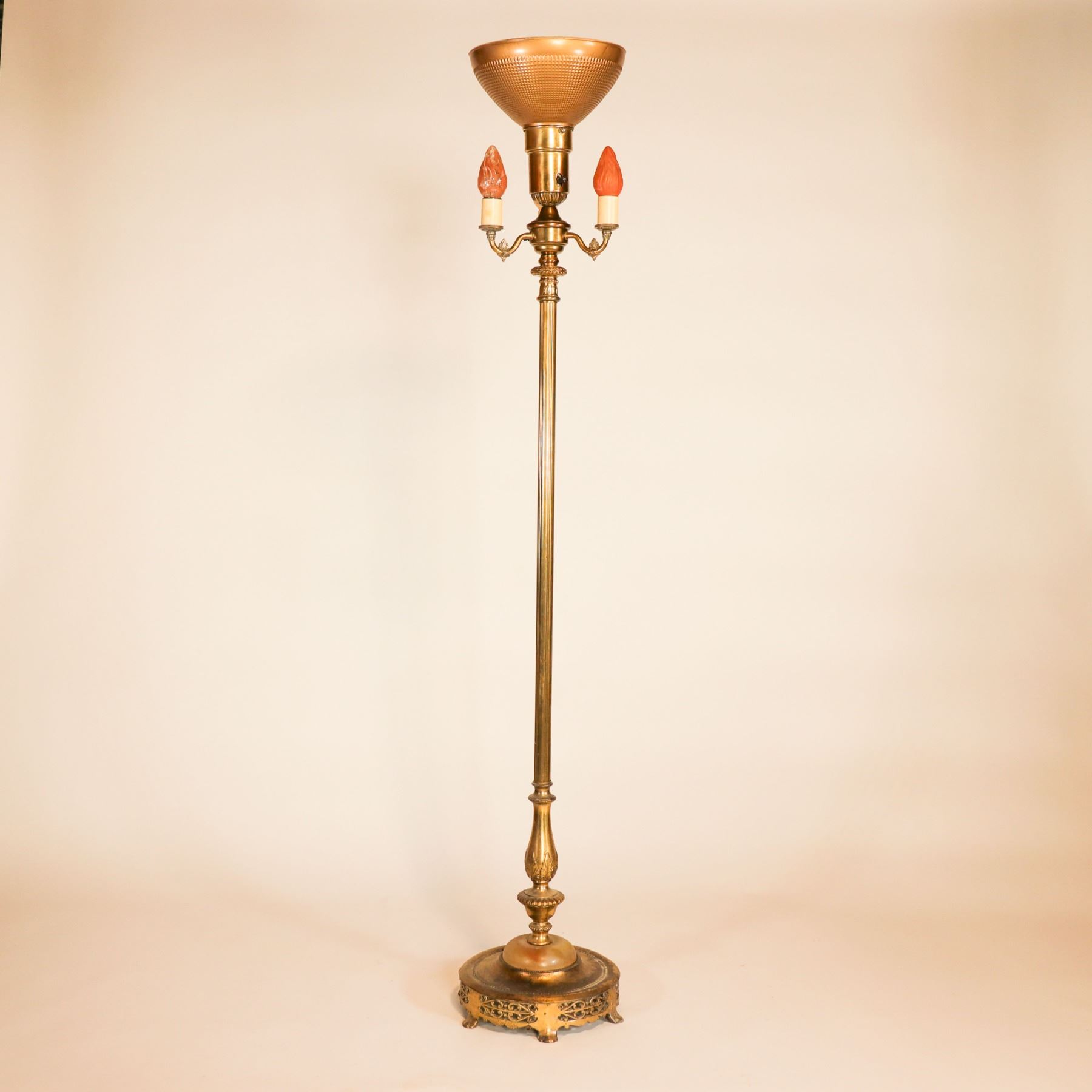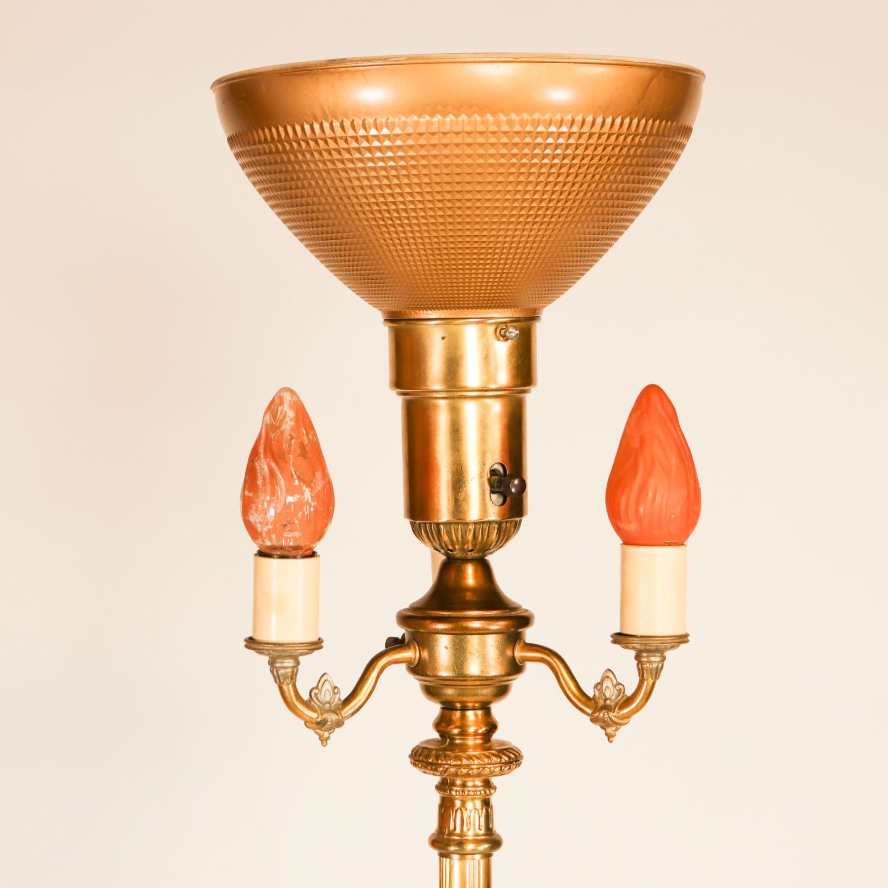 Tall Art Deco brass torchère floor lamp, the standard rising to a central uplight with wide, inverted-bowl reflector shade having textured geometric banding, flanked by a pair of scrolled side arms terminating in candle-form sockets fitted with orange glass flame shades. Turned and molded shaft over a baluster element and circular plinth, all raised on a pierced and scrolled square-on-point base with bracket feet. Likely brass-plated metal with original warm golden finish and matching reflector shade, American, circa 1930, in the Art Deco taste. Sold as found, in need of complete rewiring prior to use.