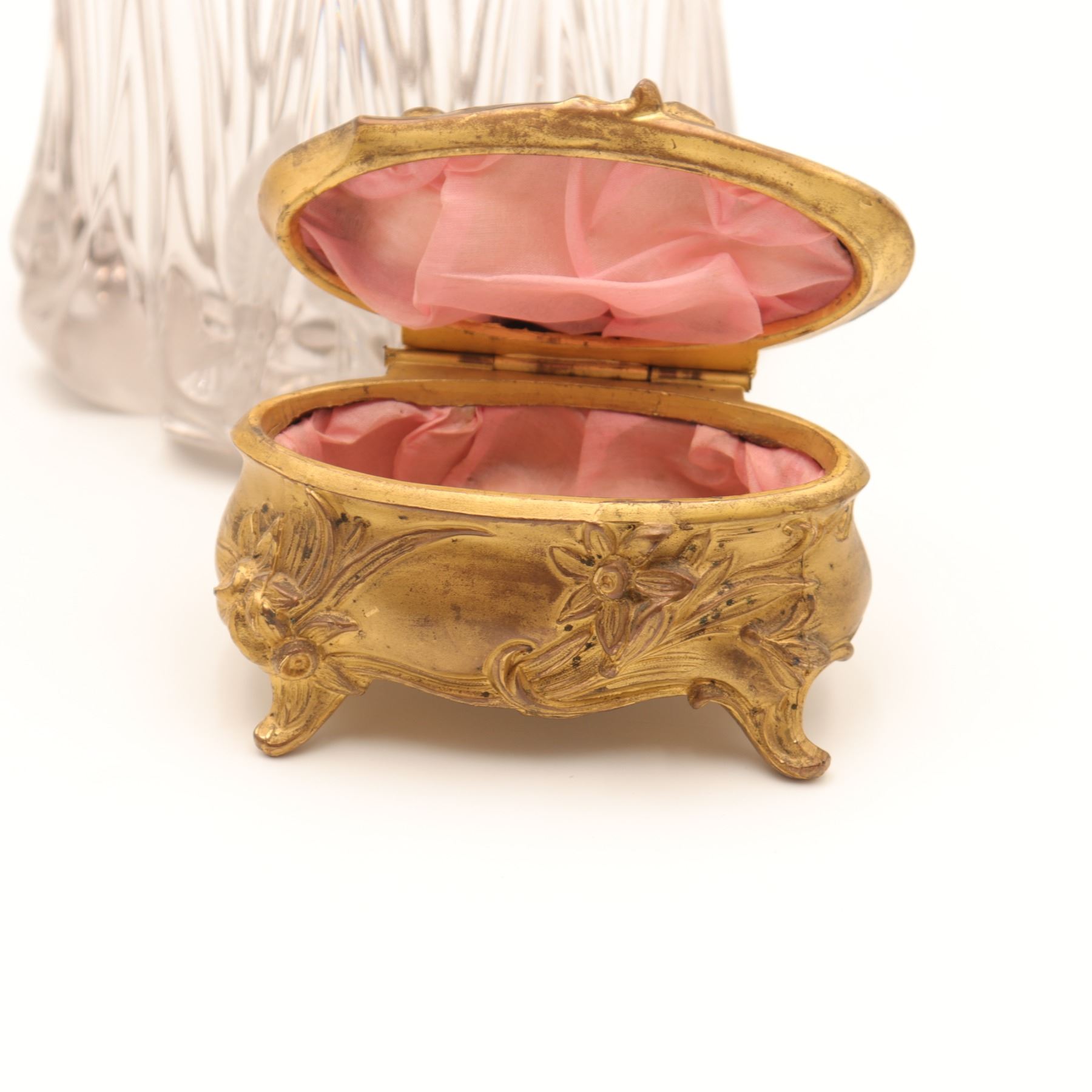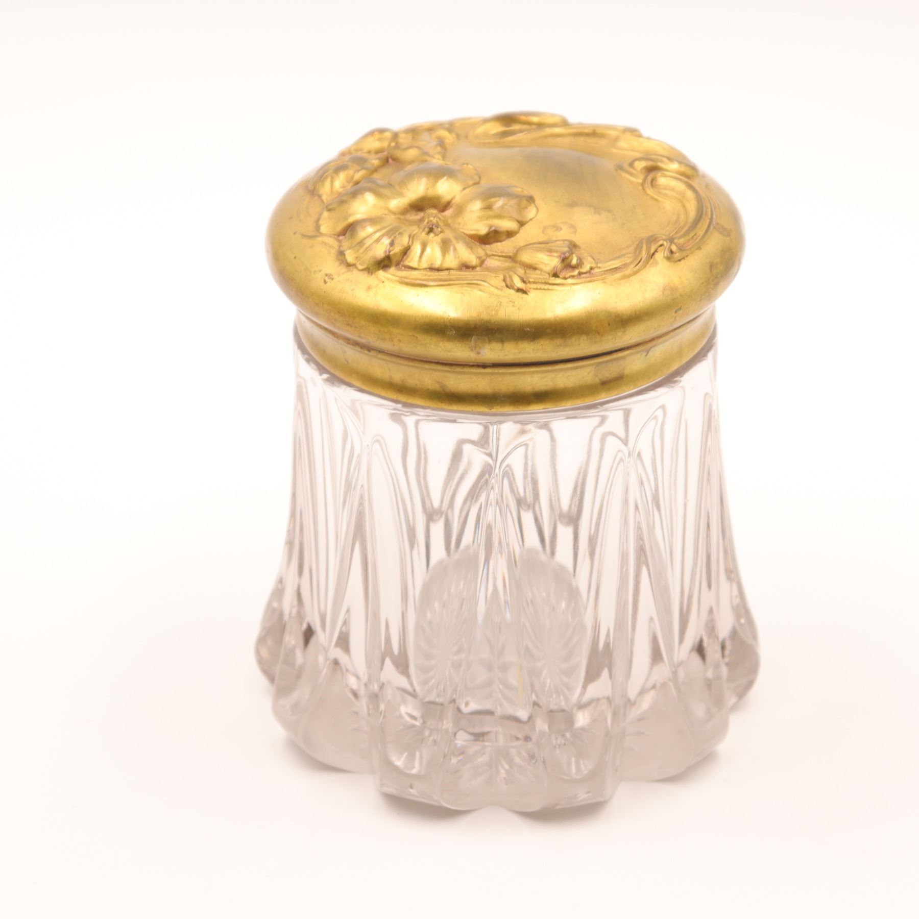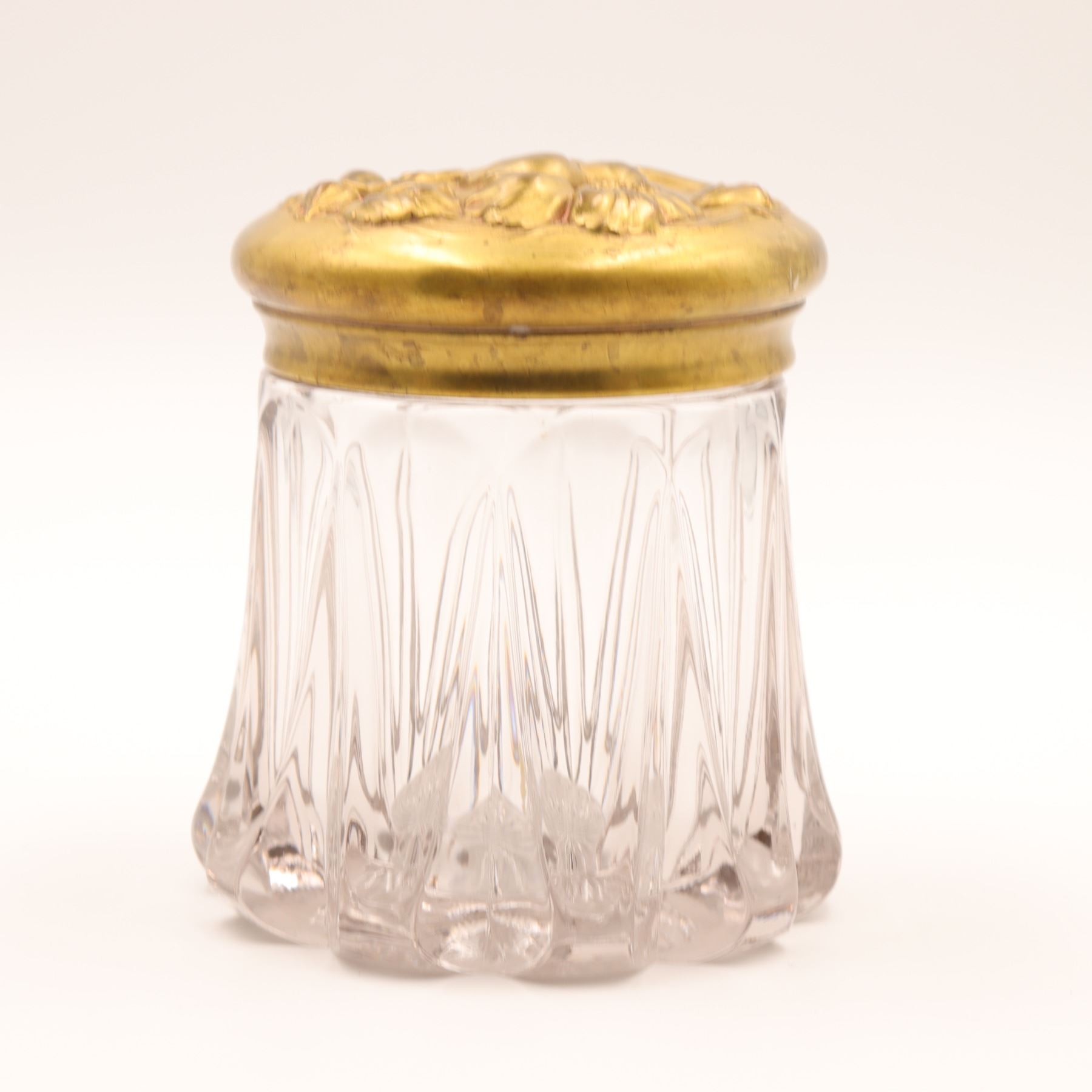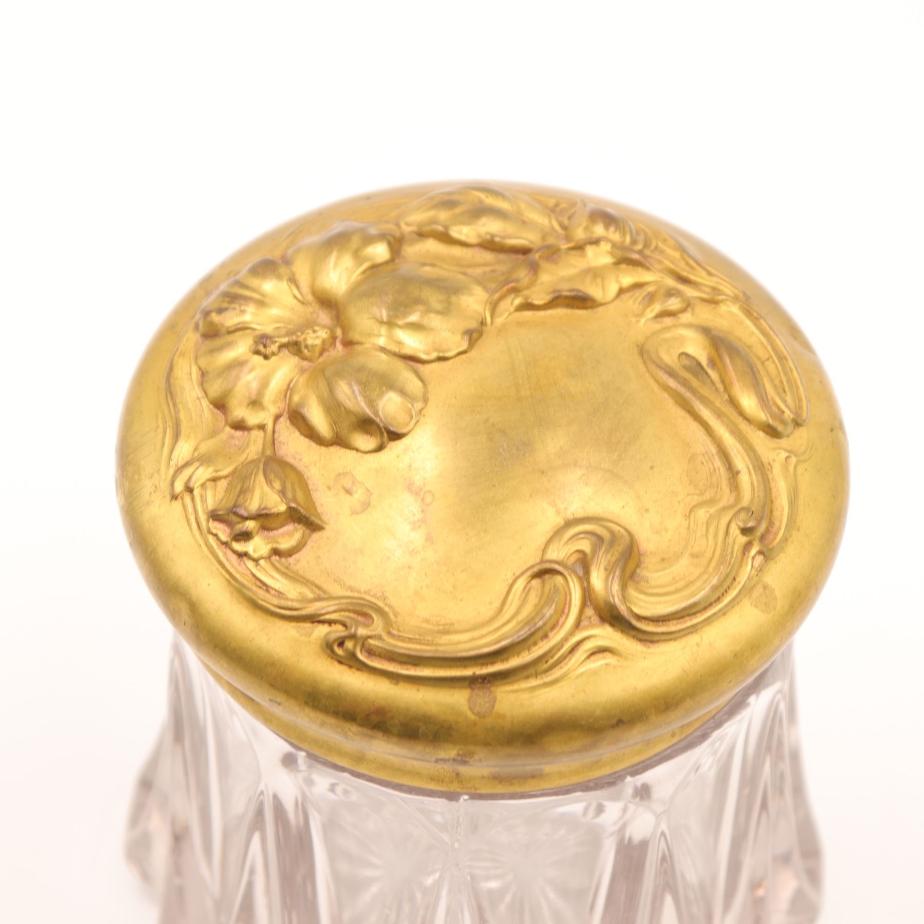 Group of two Art Nouveau gilt-metal vanity pieces, early 20th century, comprising a clear pressed glass dresser jar with repoussé floral gilt lid and a small gilt jewellery or trinket box with scrolling floral decoration and pink fabric lining. Jar in very good condition with no chips or cracks and only minor base wear; both metal components with light rubbing, tarnish and small marks from use.