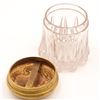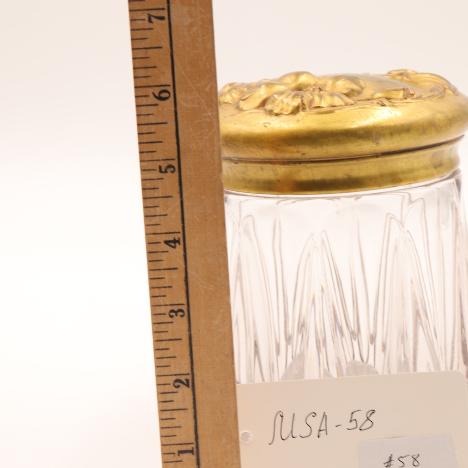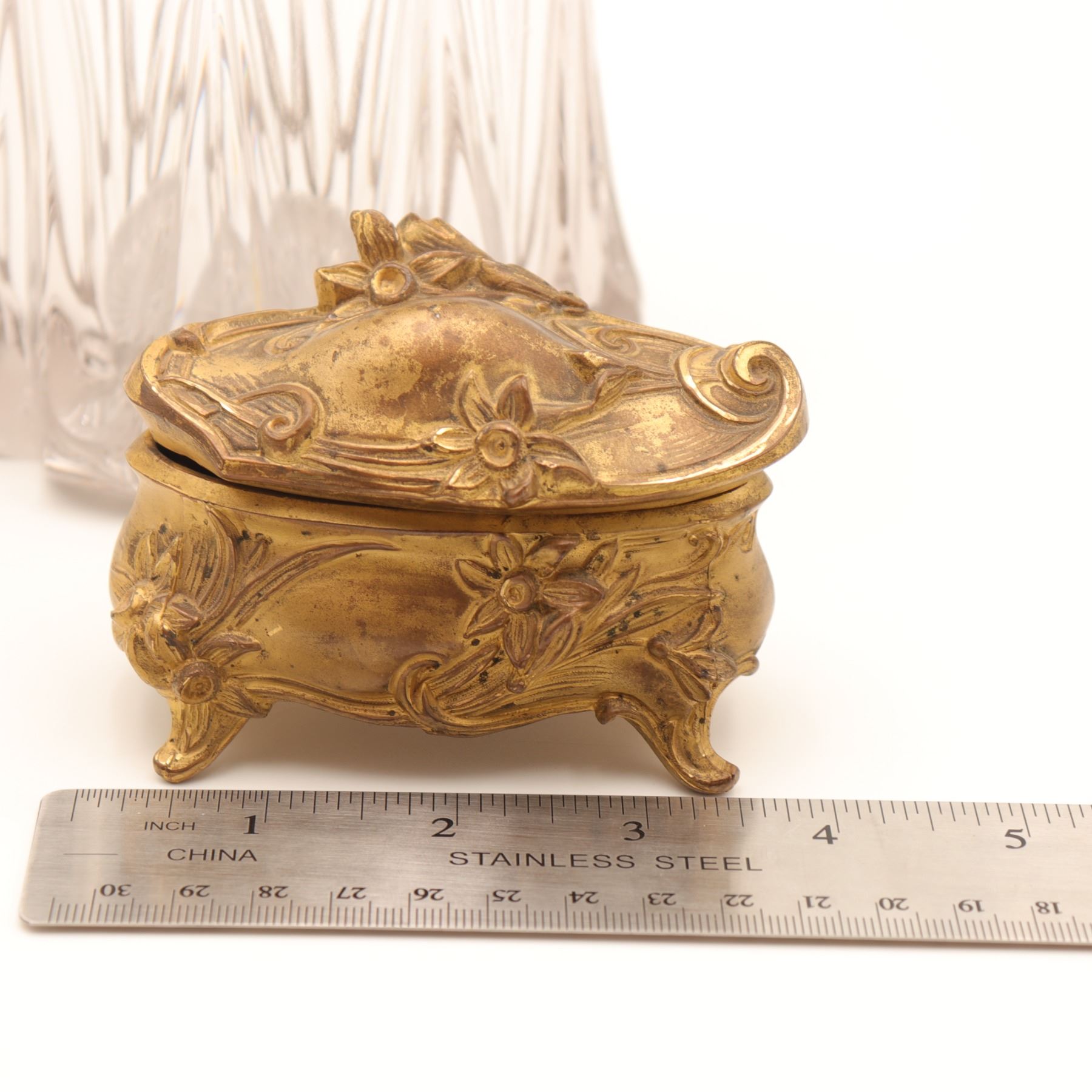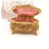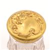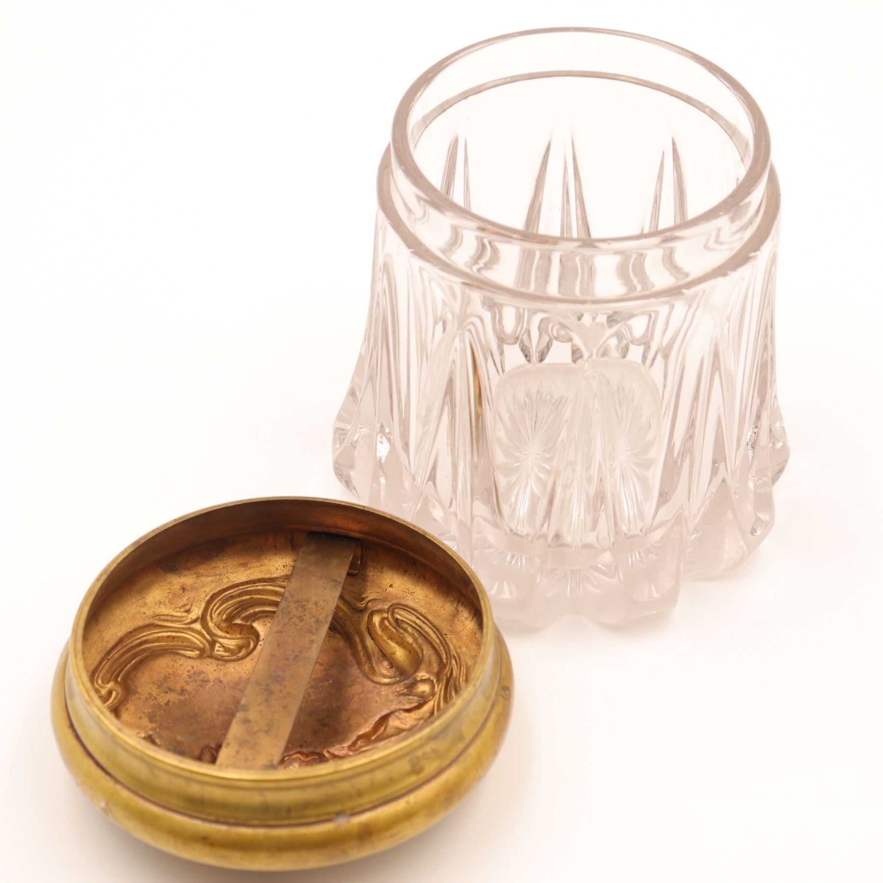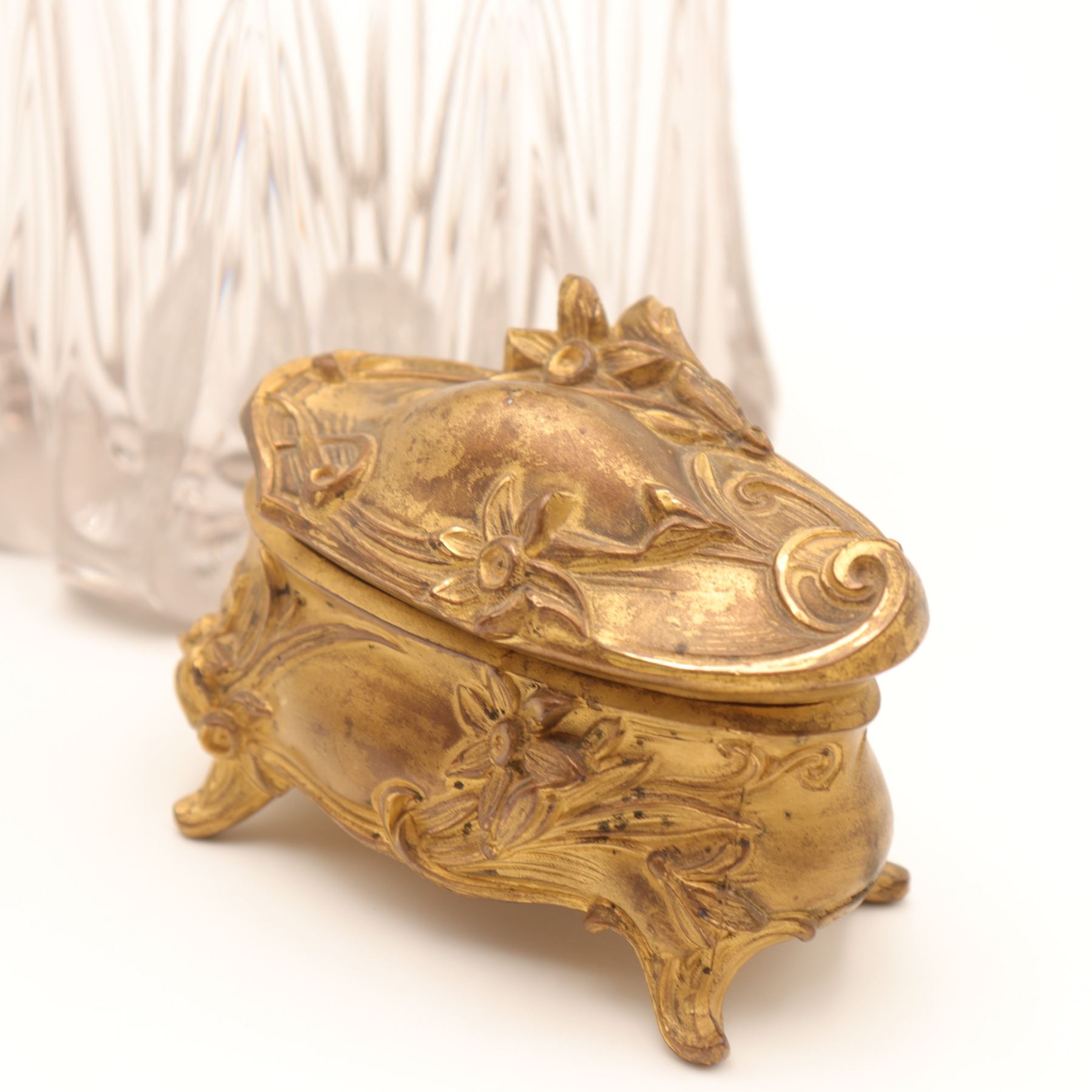 Group of two Art Nouveau gilt-metal vanity pieces, early 20th century, comprising a clear pressed glass dresser jar with repoussé floral gilt lid and a small gilt jewellery or trinket box with scrolling floral decoration and pink fabric lining. Jar in very good condition with no chips or cracks and only minor base wear; both metal components with light rubbing, tarnish and small marks from use.