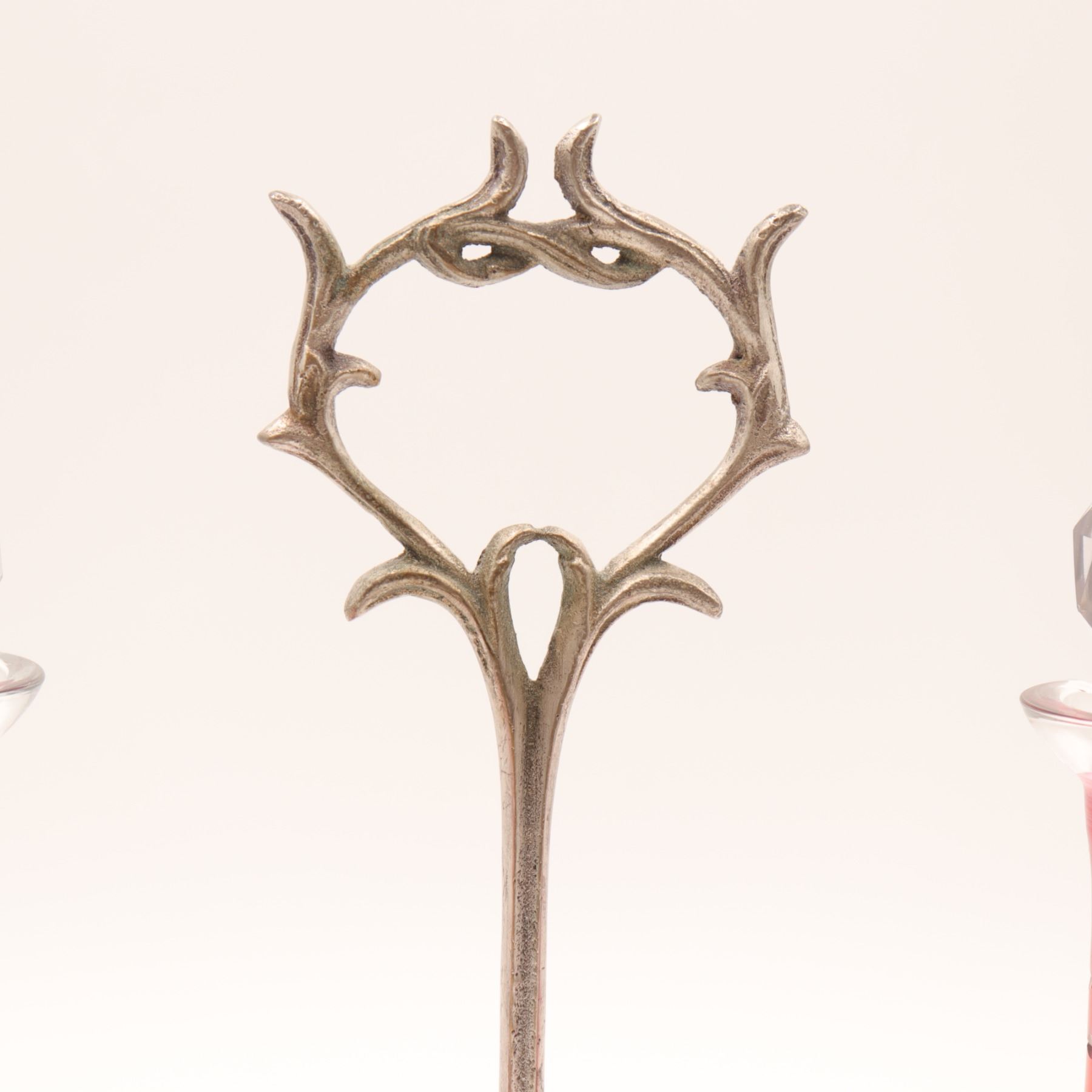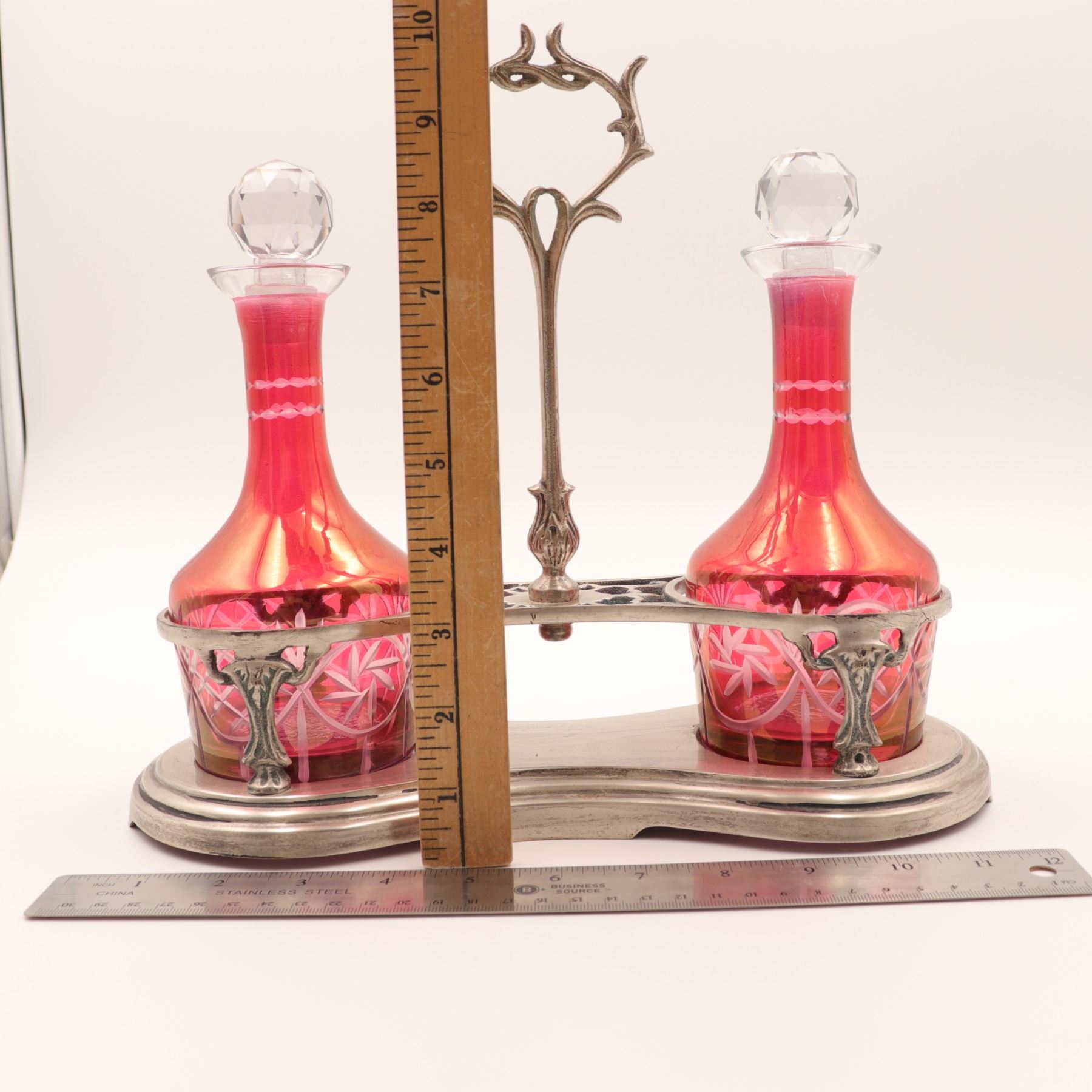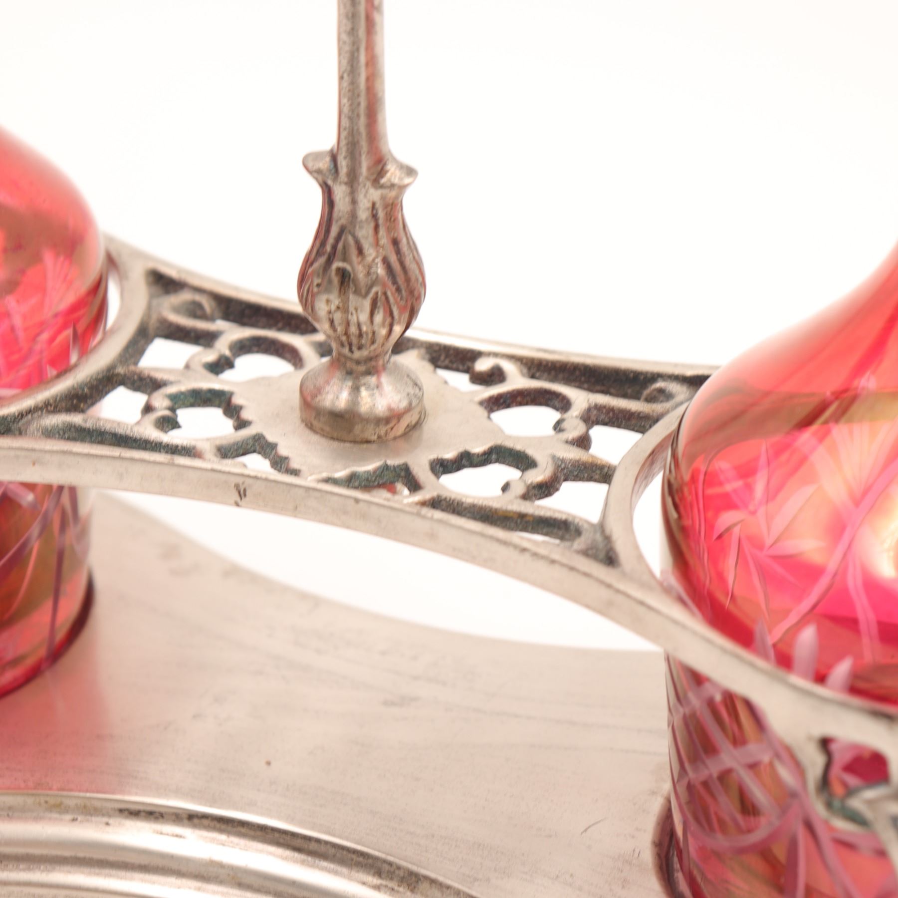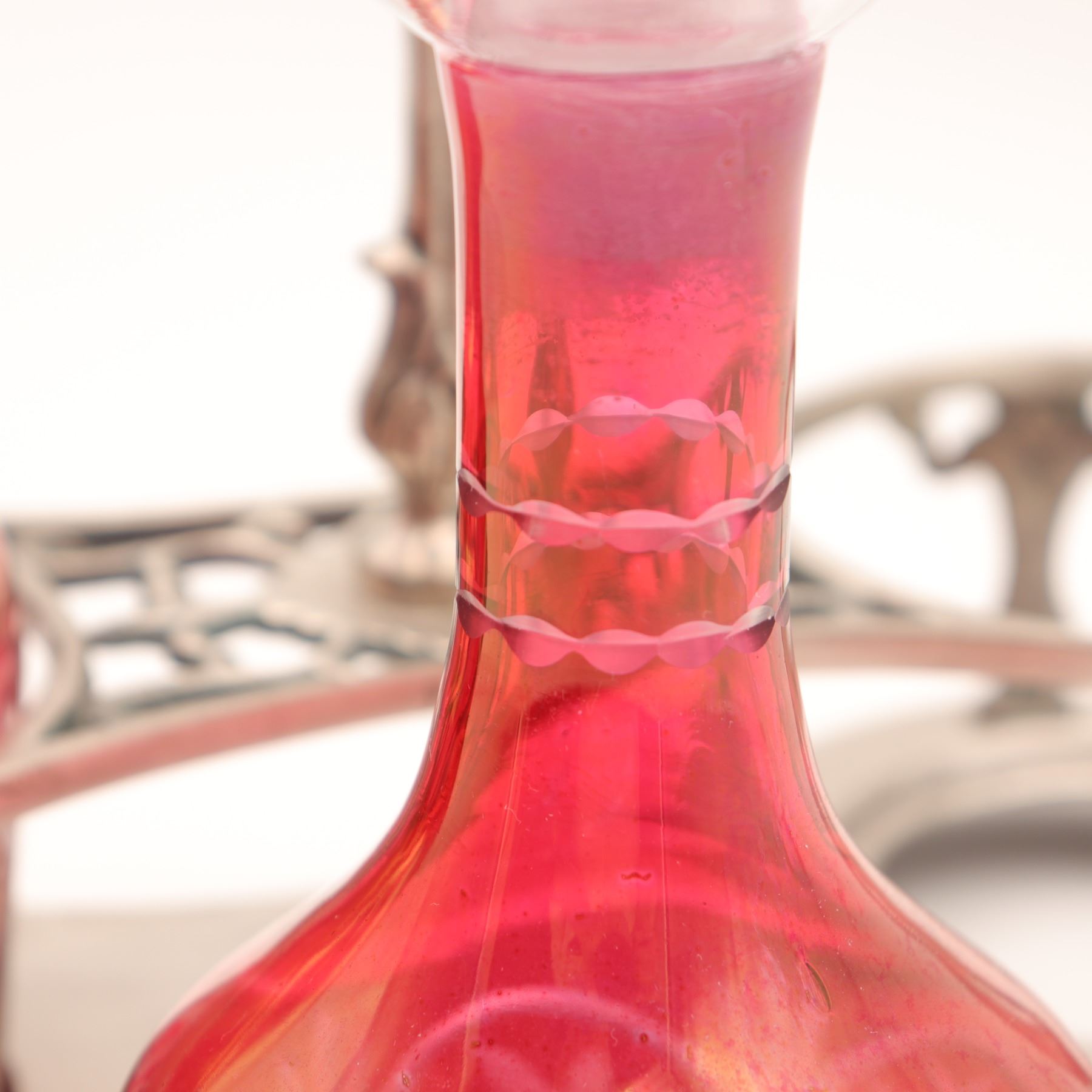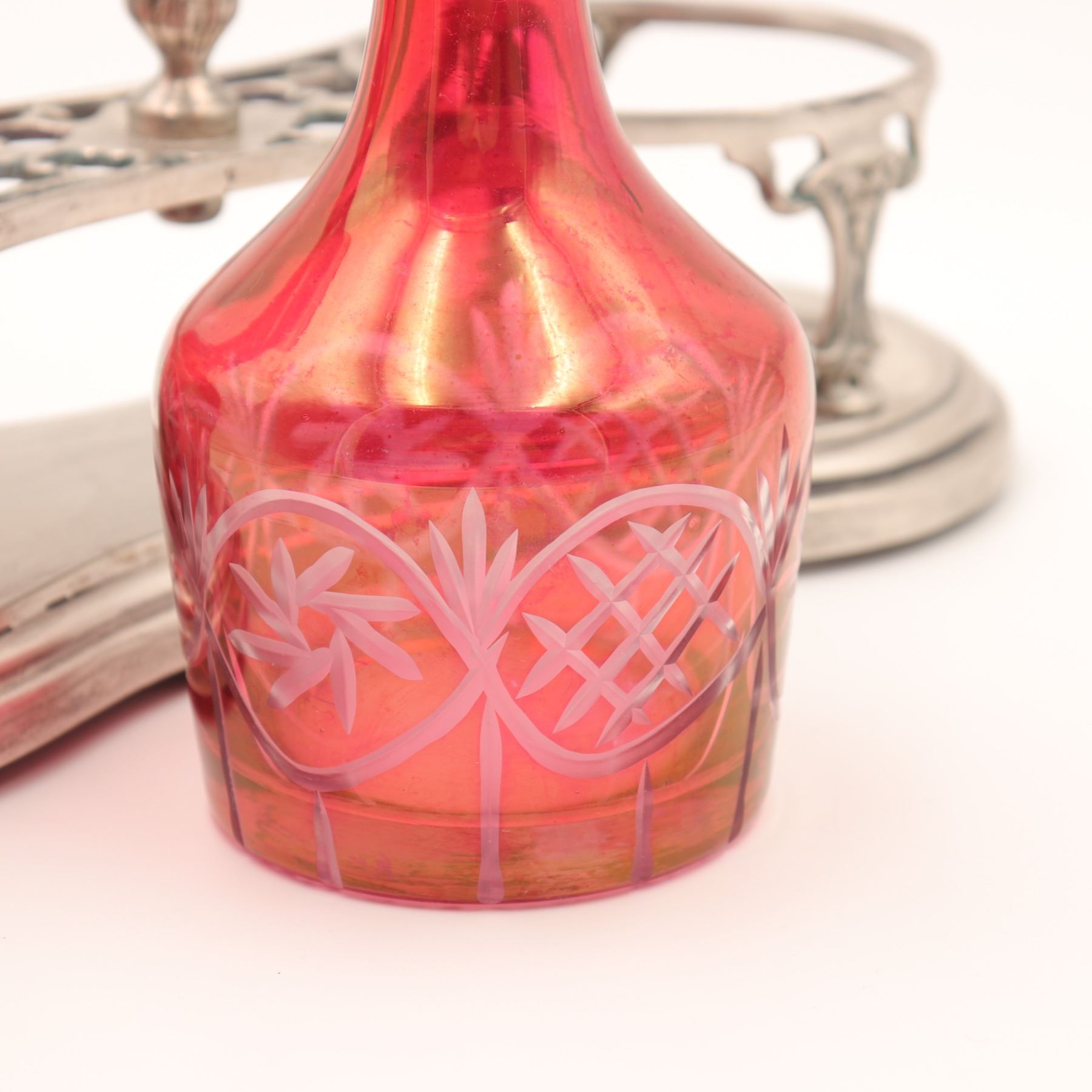 Art Nouveau double cruet set with iridescent cranberry glass bottles and silver-plated stand, probably Central European/Bohemian, circa 1900; two hand-blown bulbous cruets in cranberry glass with golden iridescence, wheel-engraved with looped foliate and lattice bands and triple-ring detail to the necks, each with faceted clear glass stopper, resting in a pierced and cast silver-coloured metal stand of scrolling Jugendstil design on shaped base; approx. 23 cm (9 in.) high to stopper and 25 cm (10 in.) wide overall; overall very good antique condition with light surface wear and patina to metal, minor rubbing to iridescence, and a small, almost invisible chip to the rim of one bottle not affecting use.