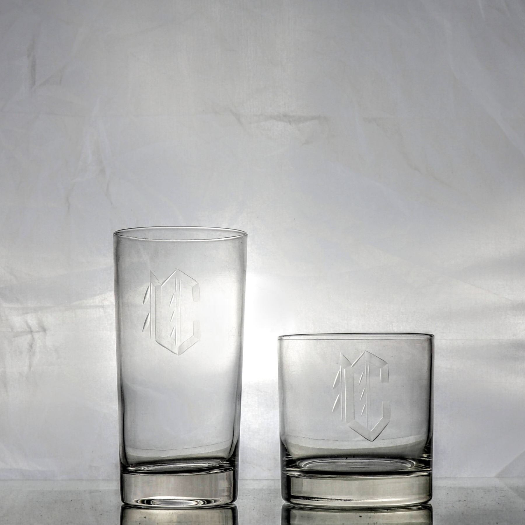 Water glasses (x8) & whisky glasses (x5) with "C" monogram; stemmed Irish glasses (x7)