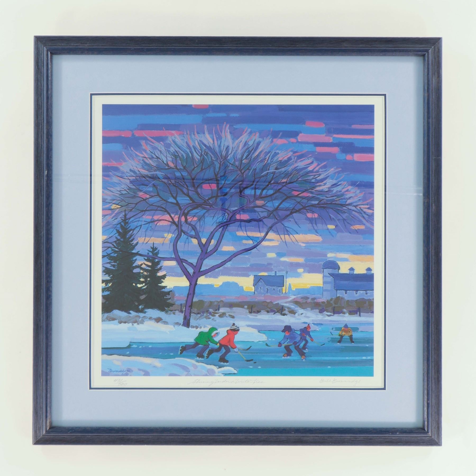 Medium: colour lithograph on paper; pencil‑signed by the artist; numbered 431/500. Image ~40 × 40 cm; framed ~61 × 61 cm. Profile: Brownridge (b. 1932) is the celebrated Canadian painter/author of prairie hockey scenes; widely collected.