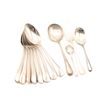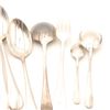 Birks “Regency Plate” silver-plated flatware service, mid-20th century, comprising approximately eleven dinner forks, ten table/oval soup spoons, a sauce or gravy ladle, a serving fork, a cream ladle and a small sugar or condiment spoon, each with plain rounded handle terminals in the minimalist “Regency Plate” pattern and stamped BIRKS REGENCY PLATE to the stems, together with the original Birks turquoise felt storage roll. Approx. 25 pieces.