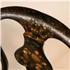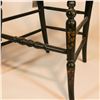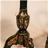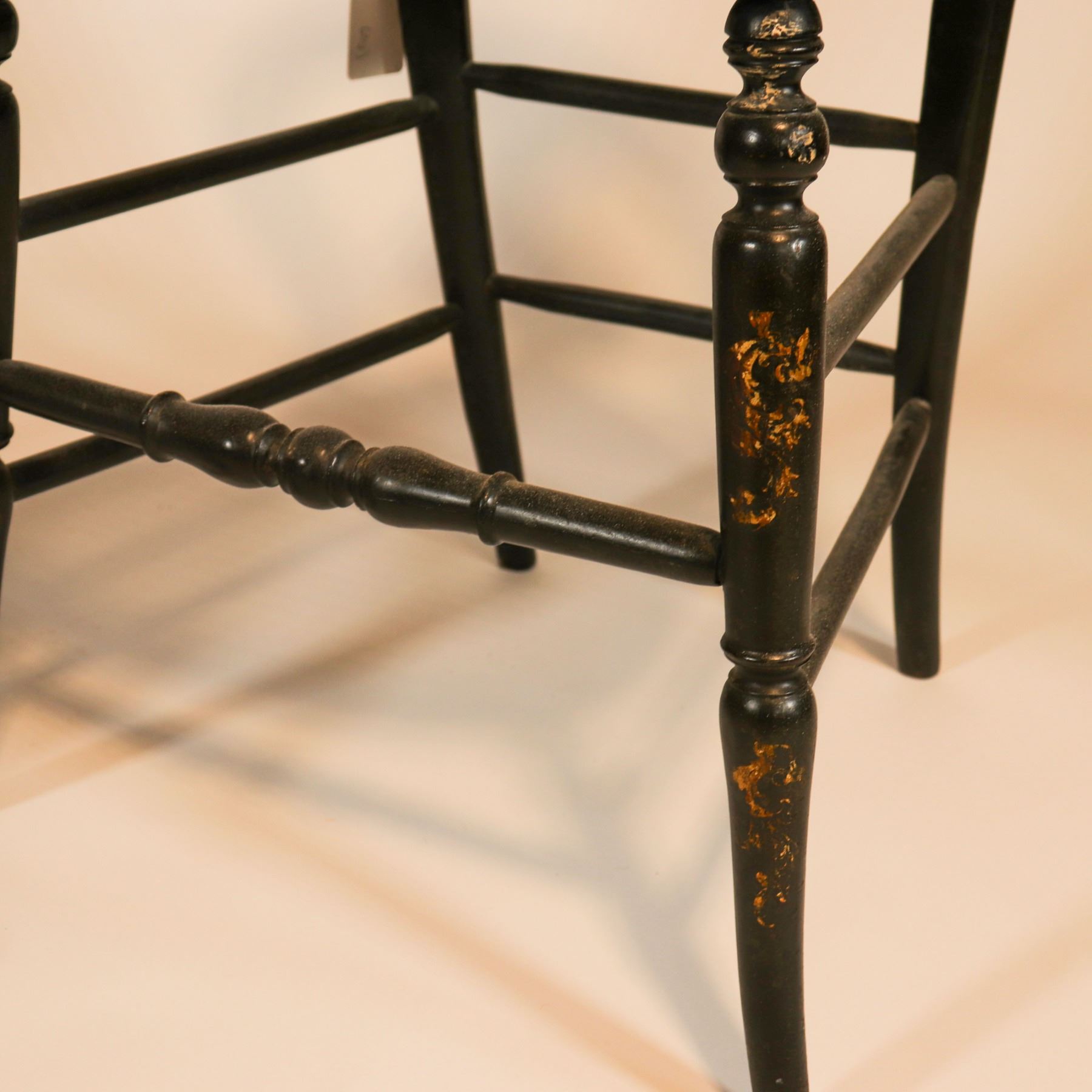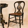 Assembled pair comprising a Victorian japanned work / occasional table and matching side chair, each in black lacquer with gilt and mother-of-pearl decoration. The serpentine rectangular work table with hinged lid and interior compartment (not shown), the exterior decorated with scrolling gilt foliate borders and scattered floral sprays, raised on a turned and faceted baluster standard with lobed, panelled base, each panel richly inlaid with abalone and nacre blossoms, on three exaggerated cabriole legs with further gilt and mother-of-pearl ornament. Together with a balloon-back side chair, the shaped splat painted with a still life of fruit heightened with mother-of-pearl, over a caned seat and ring-turned front legs united by stretchers. British, mid-19th century, in the Regency Revival / Victorian japanned taste. Sold together as one lot. Table 16x13x29H, Chair 32H