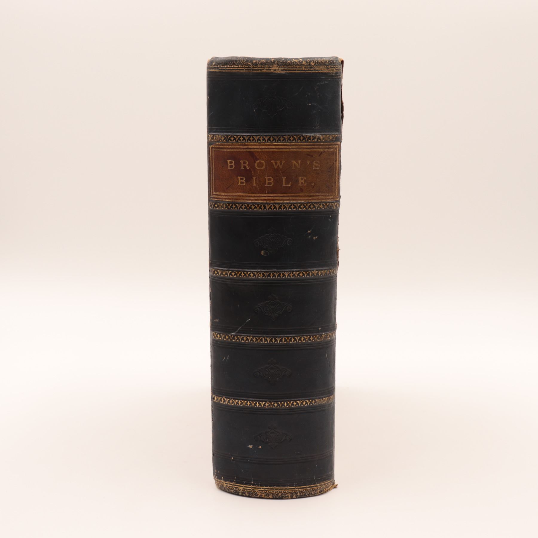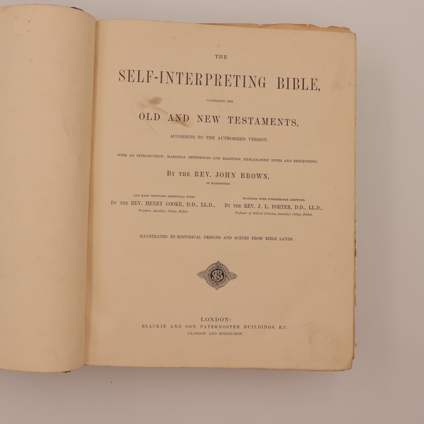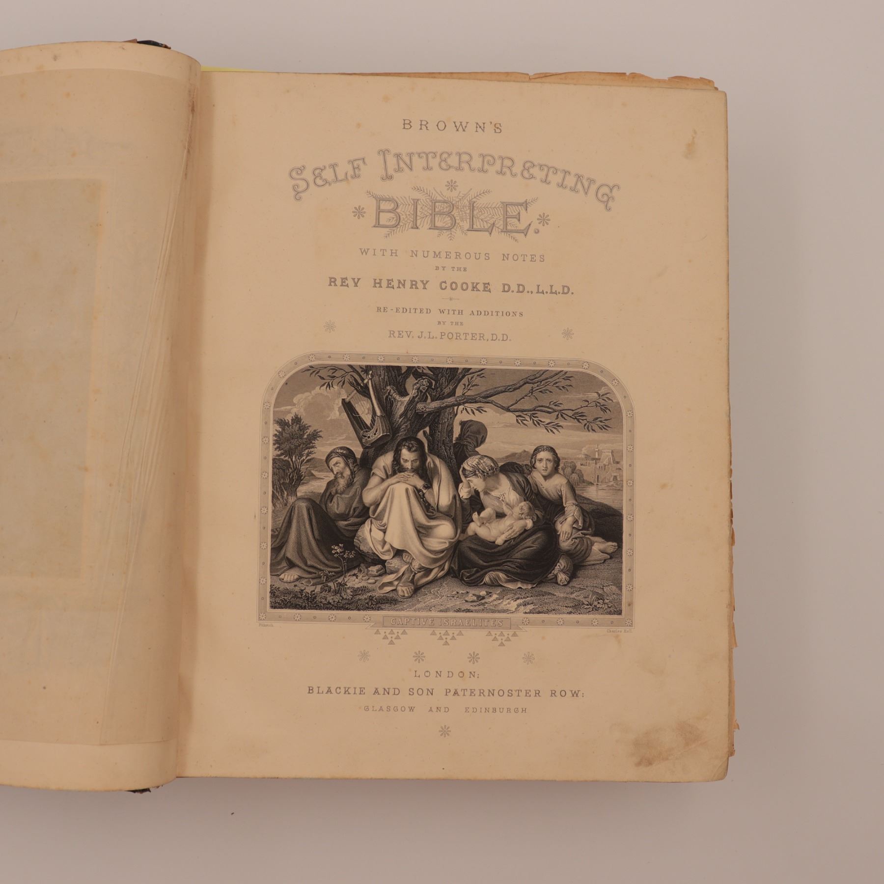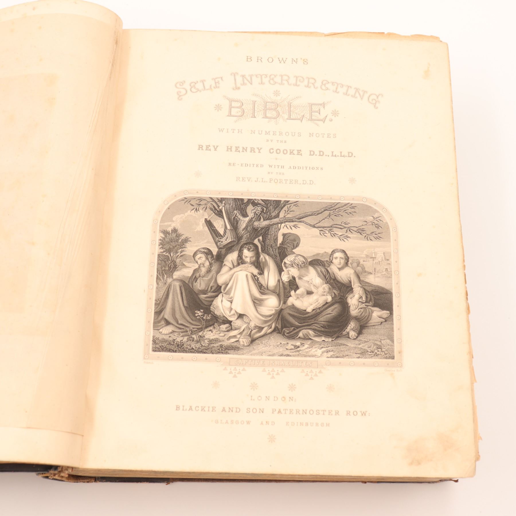 Blackie & Son edition of Rev. John Brown’s celebrated annotated Bible, revised with notes by Rev. Henry Cooke and additions by Rev. J. L. Porter. Large folio with numerous steel-engraved plates (“Abraham Offering up Isaac,” “The Judgement of Solomon,” etc.), marbled edges, and raised-band spine. Approx. 21–22 x 14–15 x 4–5 in.