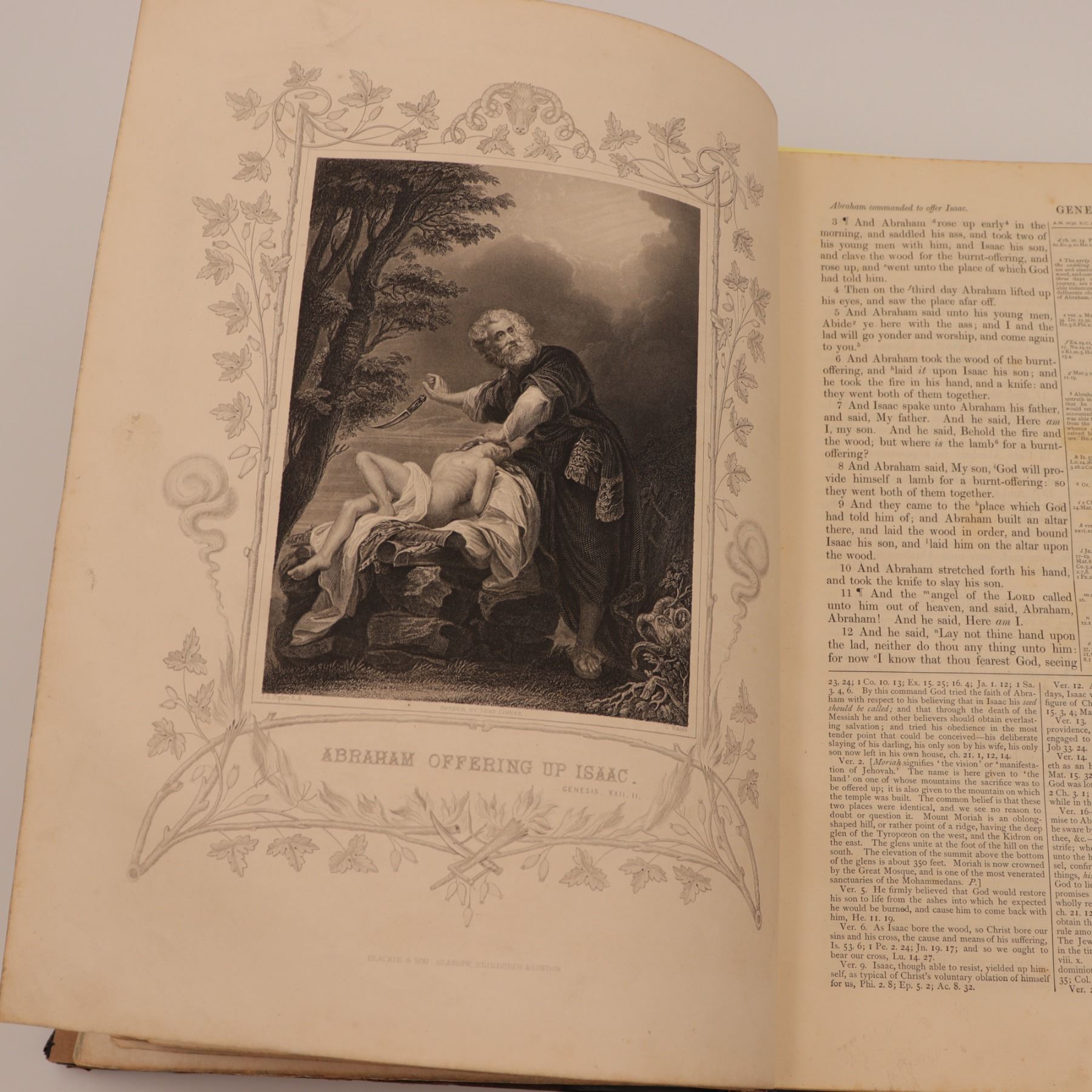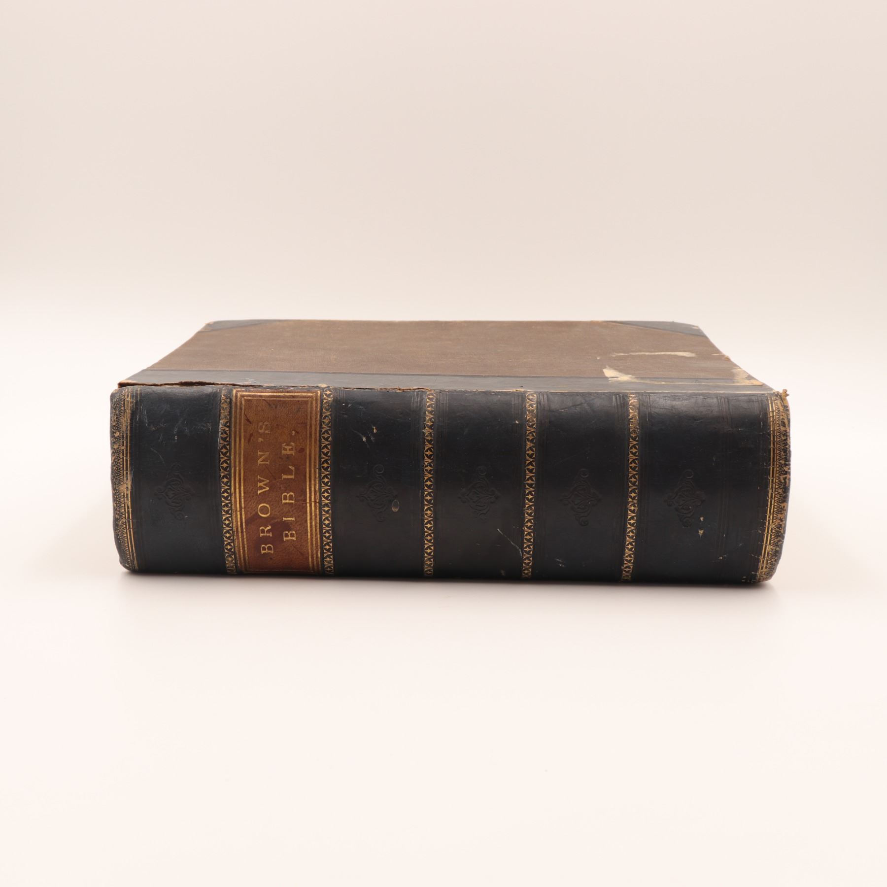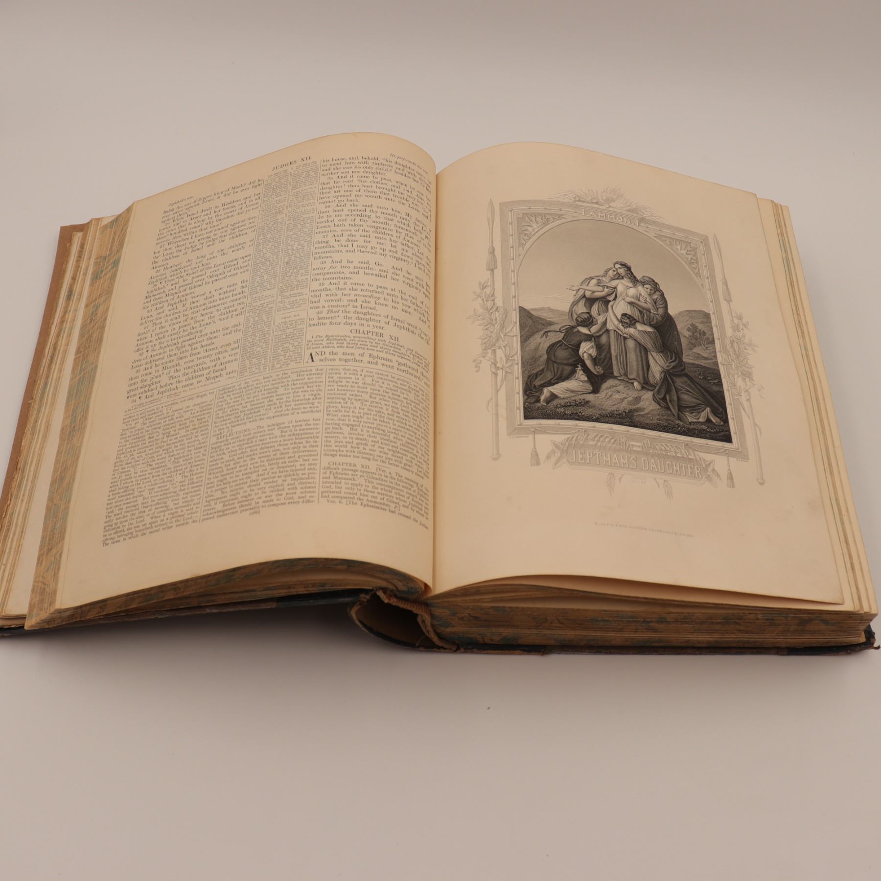 Blackie & Son edition of Rev. John Brown’s celebrated annotated Bible, revised with notes by Rev. Henry Cooke and additions by Rev. J. L. Porter. Large folio with numerous steel-engraved plates (“Abraham Offering up Isaac,” “The Judgement of Solomon,” etc.), marbled edges, and raised-band spine. Approx. 21–22 x 14–15 x 4–5 in.