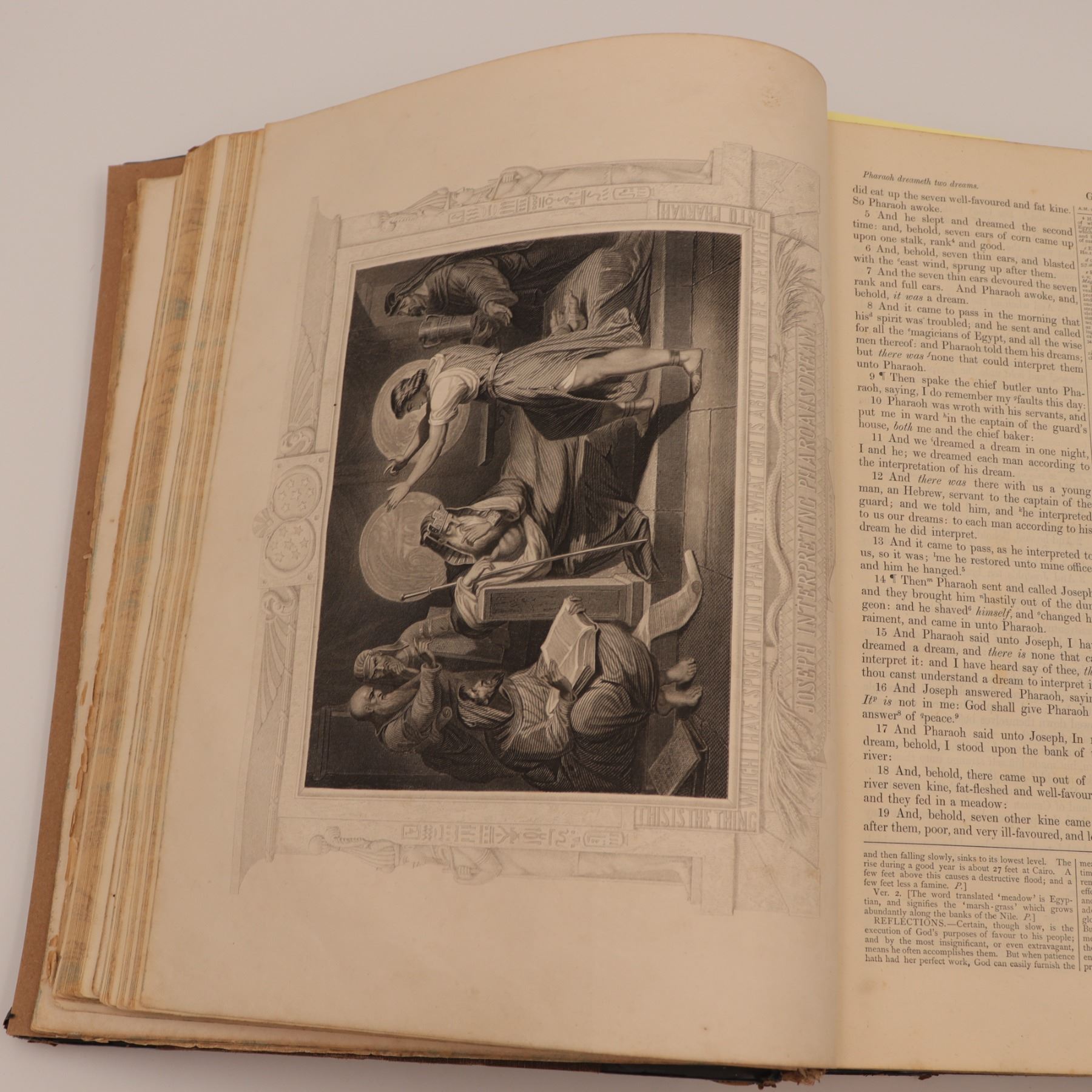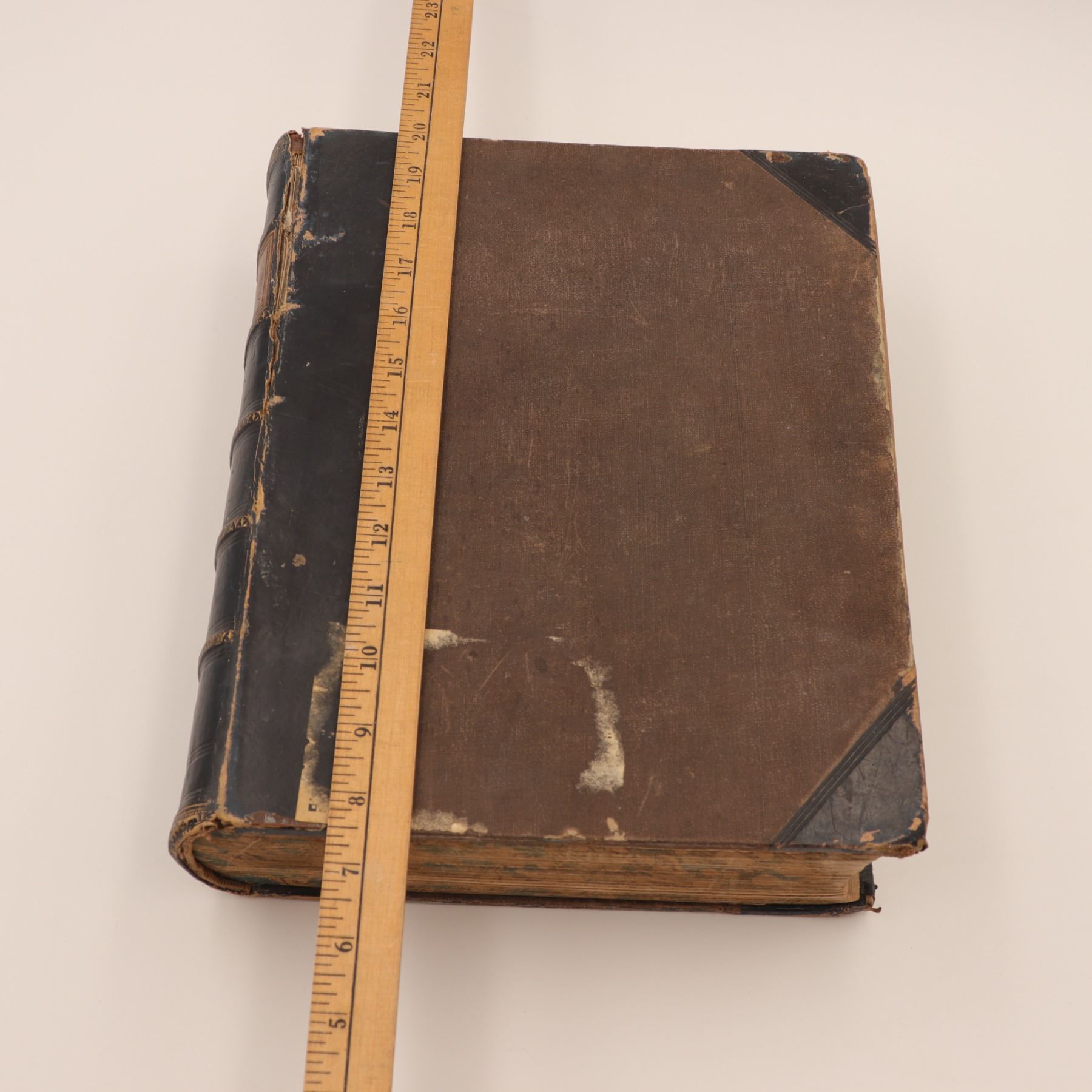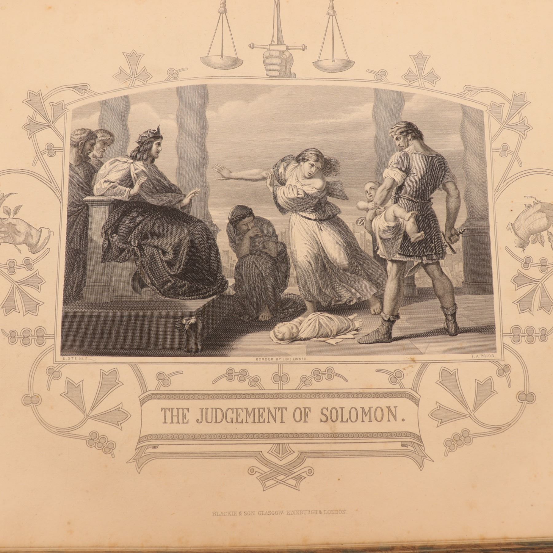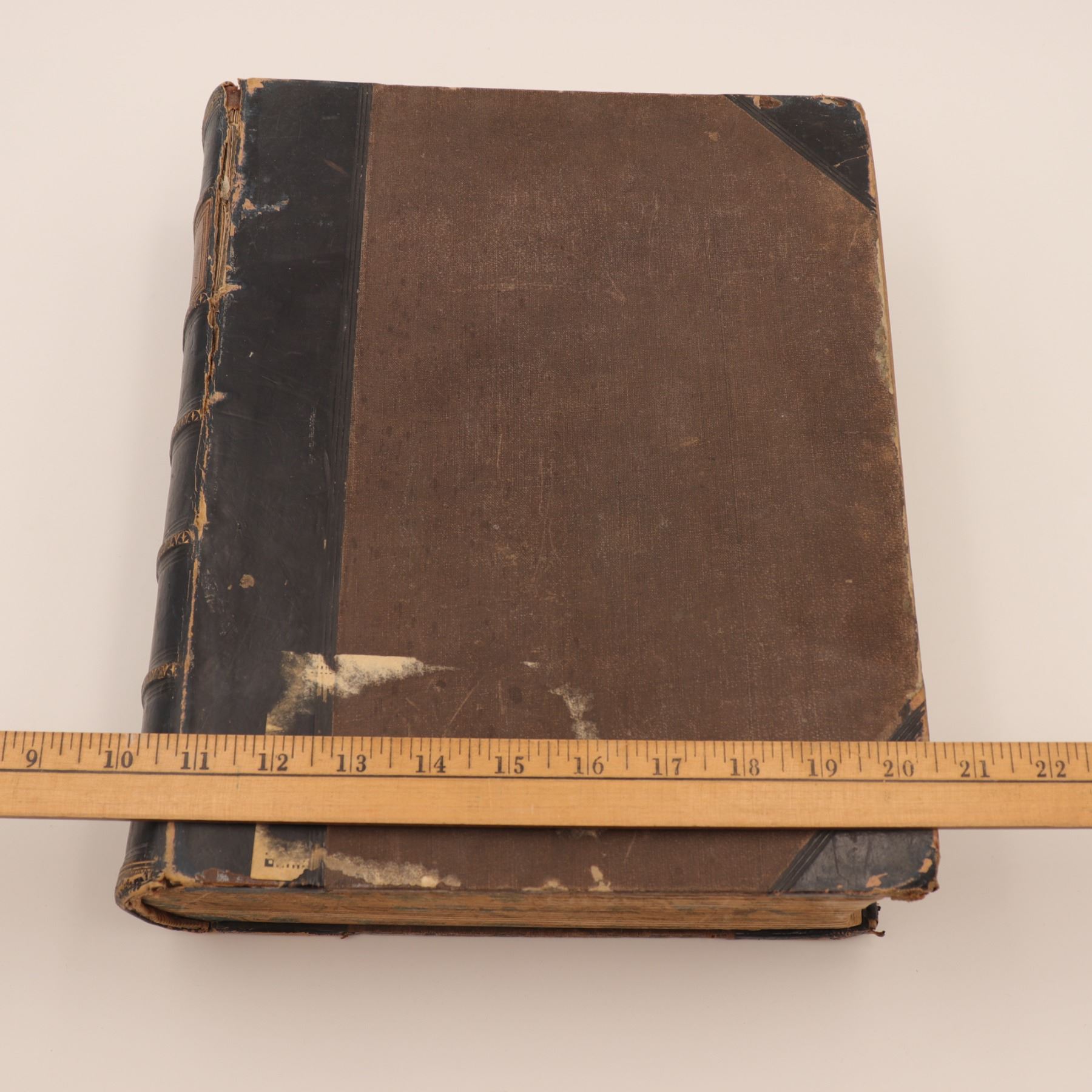 Blackie & Son edition of Rev. John Brown’s celebrated annotated Bible, revised with notes by Rev. Henry Cooke and additions by Rev. J. L. Porter. Large folio with numerous steel-engraved plates (“Abraham Offering up Isaac,” “The Judgement of Solomon,” etc.), marbled edges, and raised-band spine. Approx. 21–22 x 14–15 x 4–5 in.