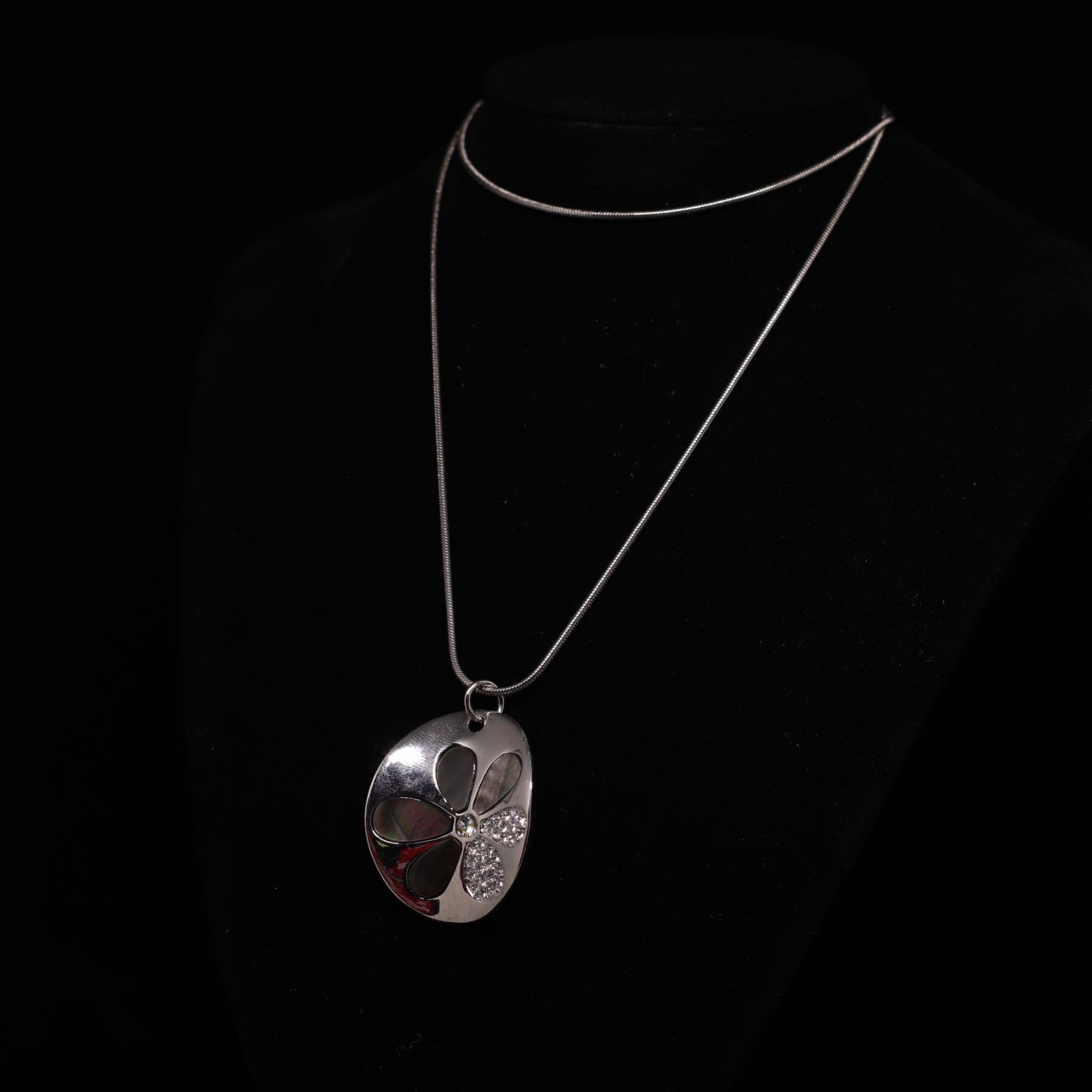 Pendant necklace signed Butler, featuring a silver-tone teardrop pendant with inlaid mother-of-pearl petals and pavé rhinestone detail. A stylish mid-2000s designer piece.