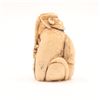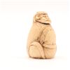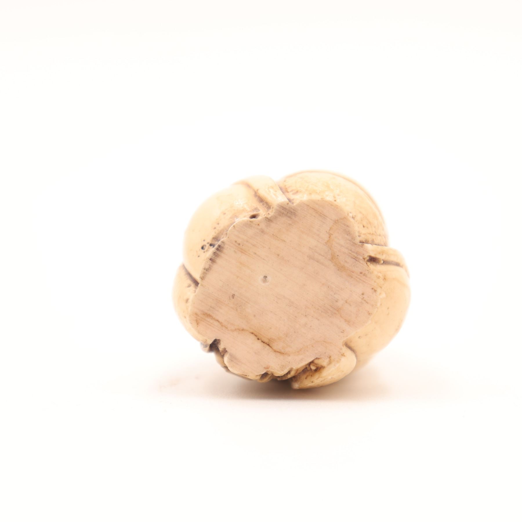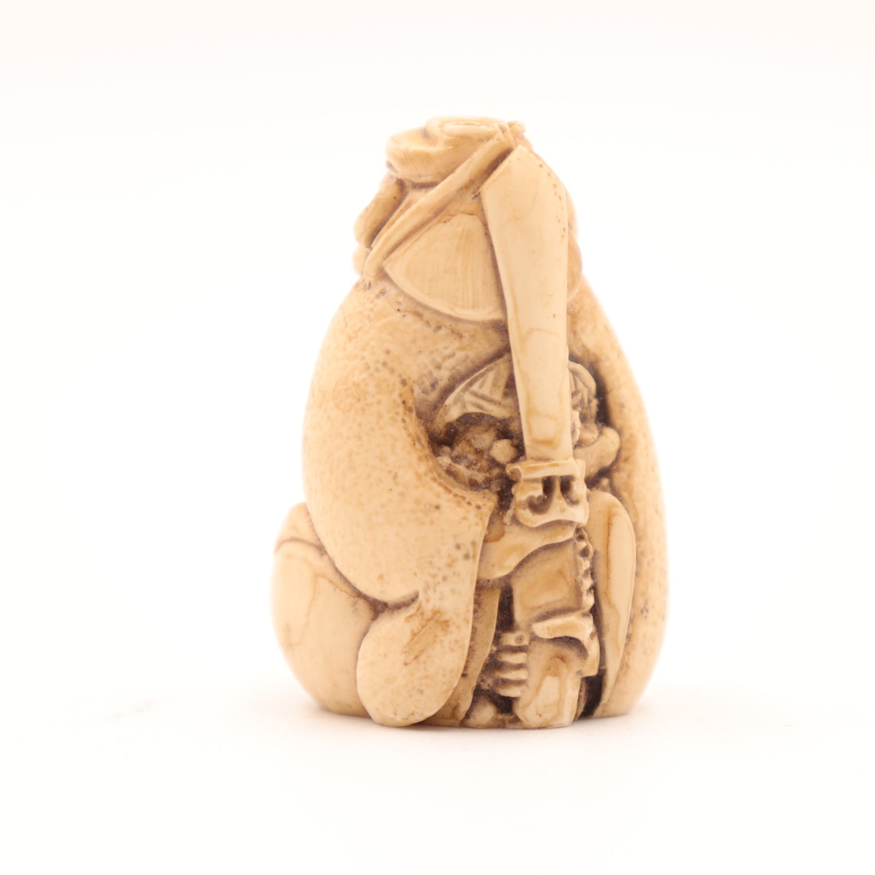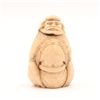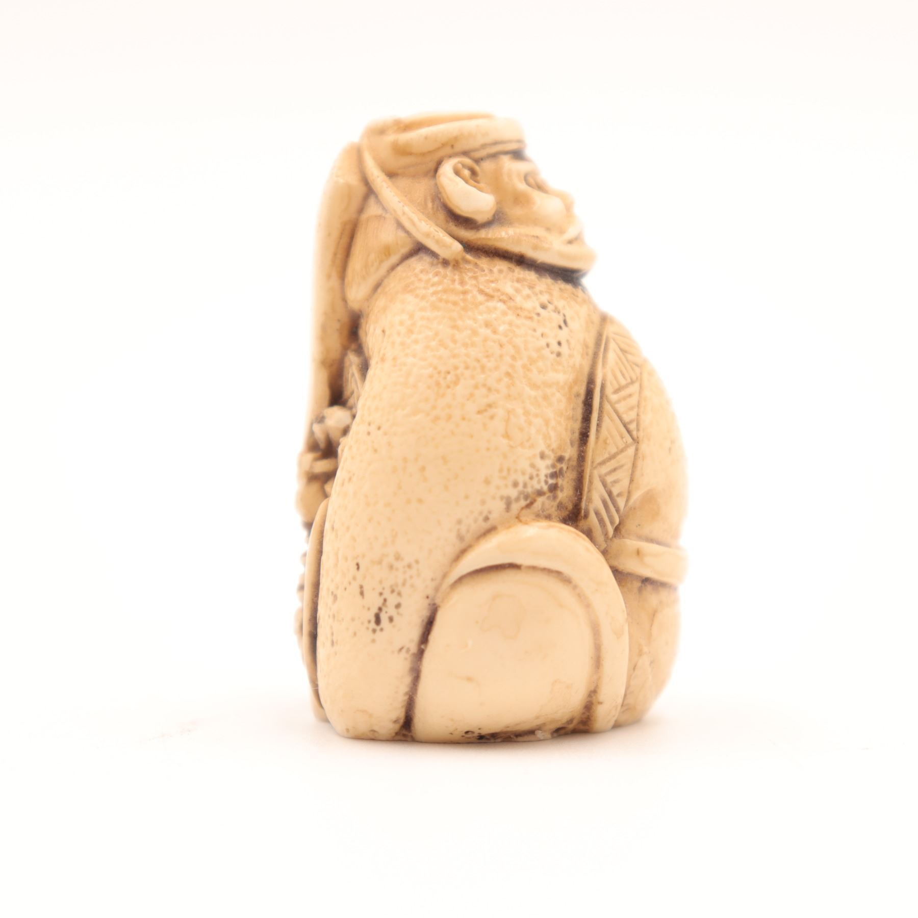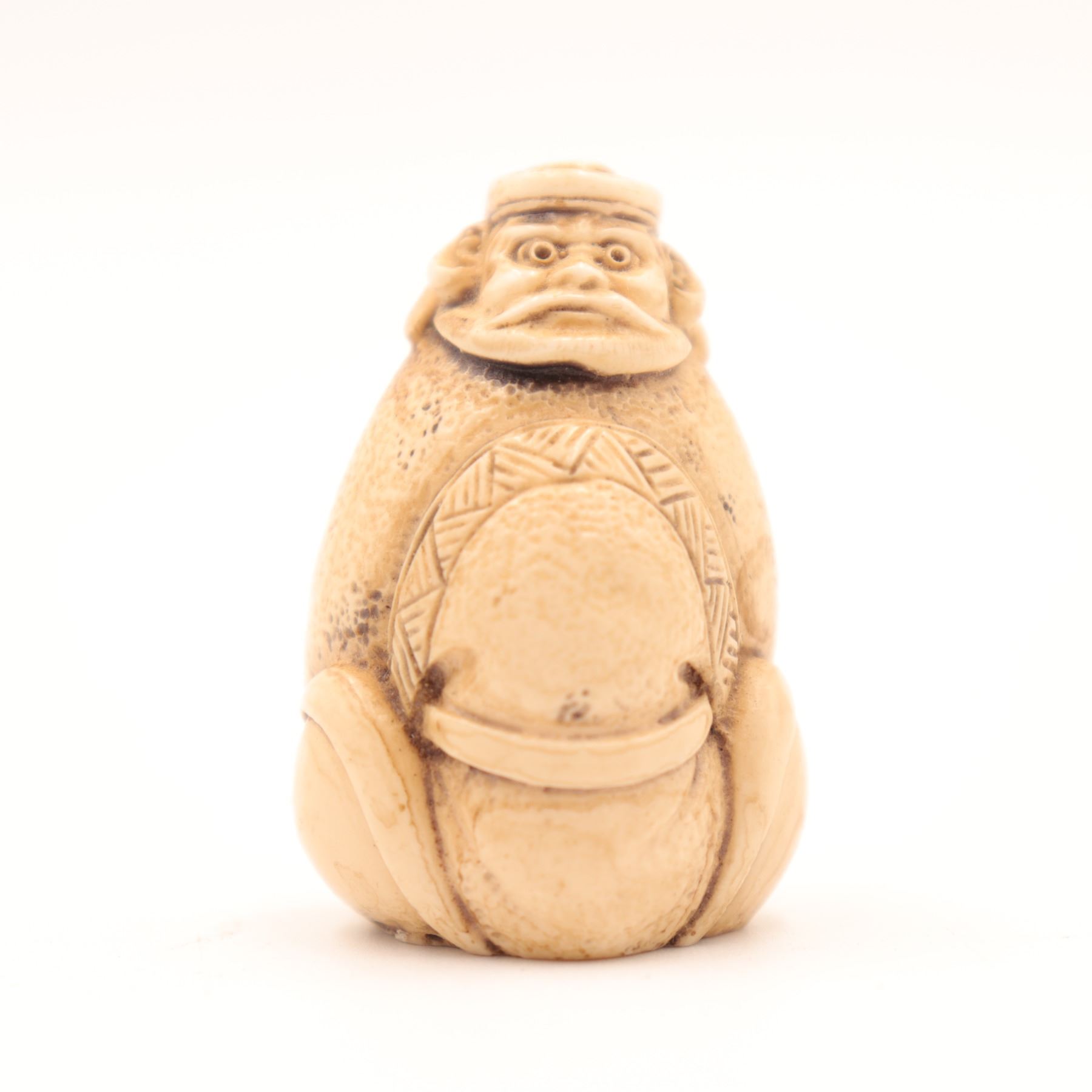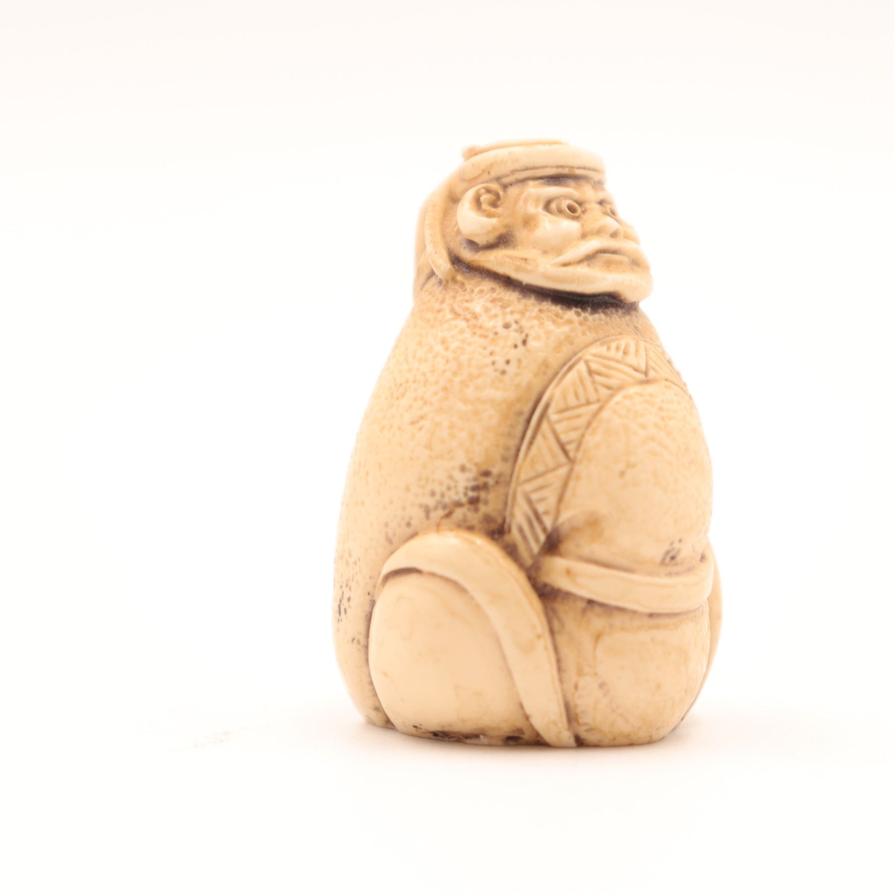 Carved netsuke-style figure of a seated man, probably Japanese or Japanese-style, early–mid 20th century, carved in the round from a light organic material and stained to accent the facial features and textured robe, the figure modelled with a rounded body and expressive face, underside with central himotoshi-type drilling. Height approx. 1 7/8 in. Surface wear, handling patina and age-related hairline lines to the material; no obvious losses or repairs noted.