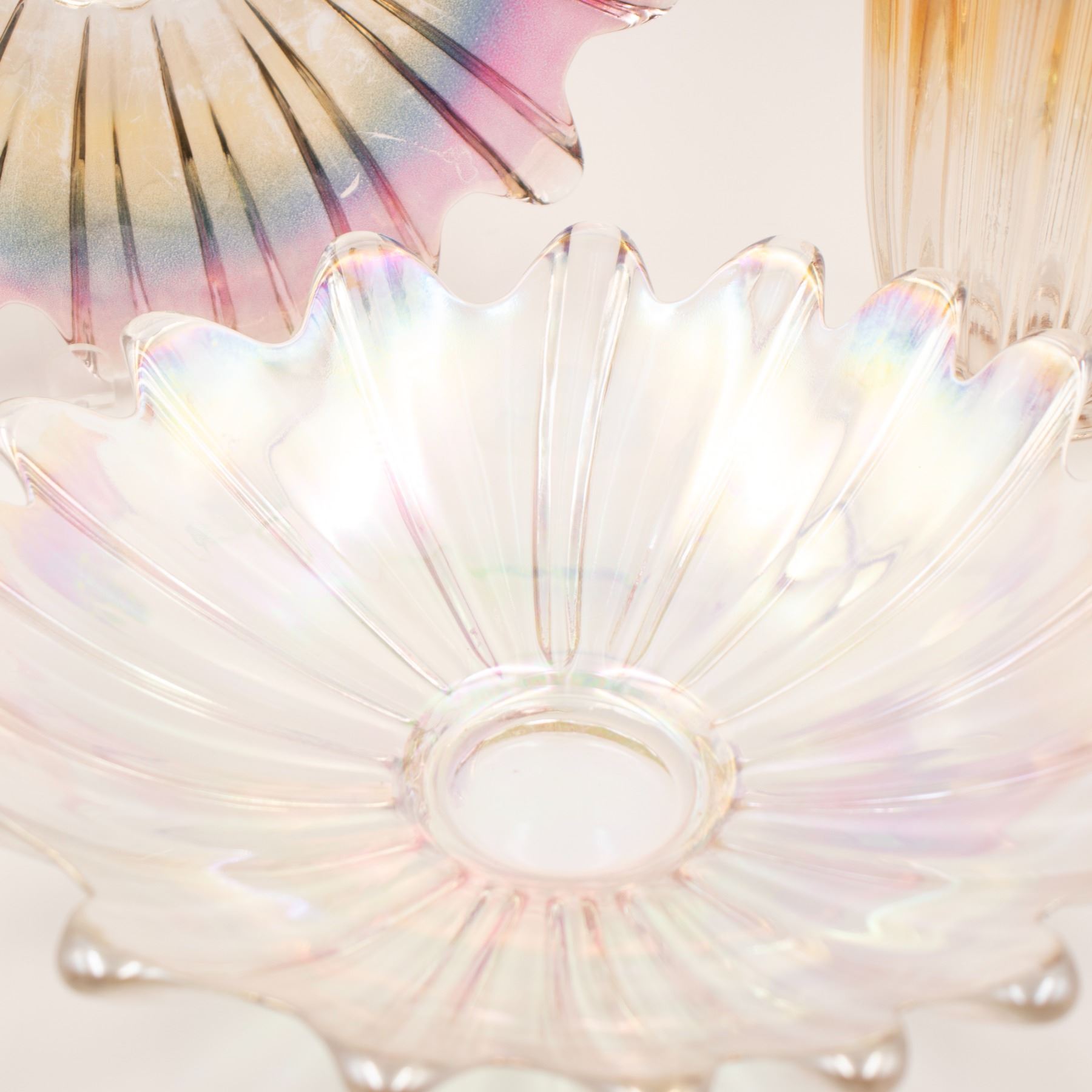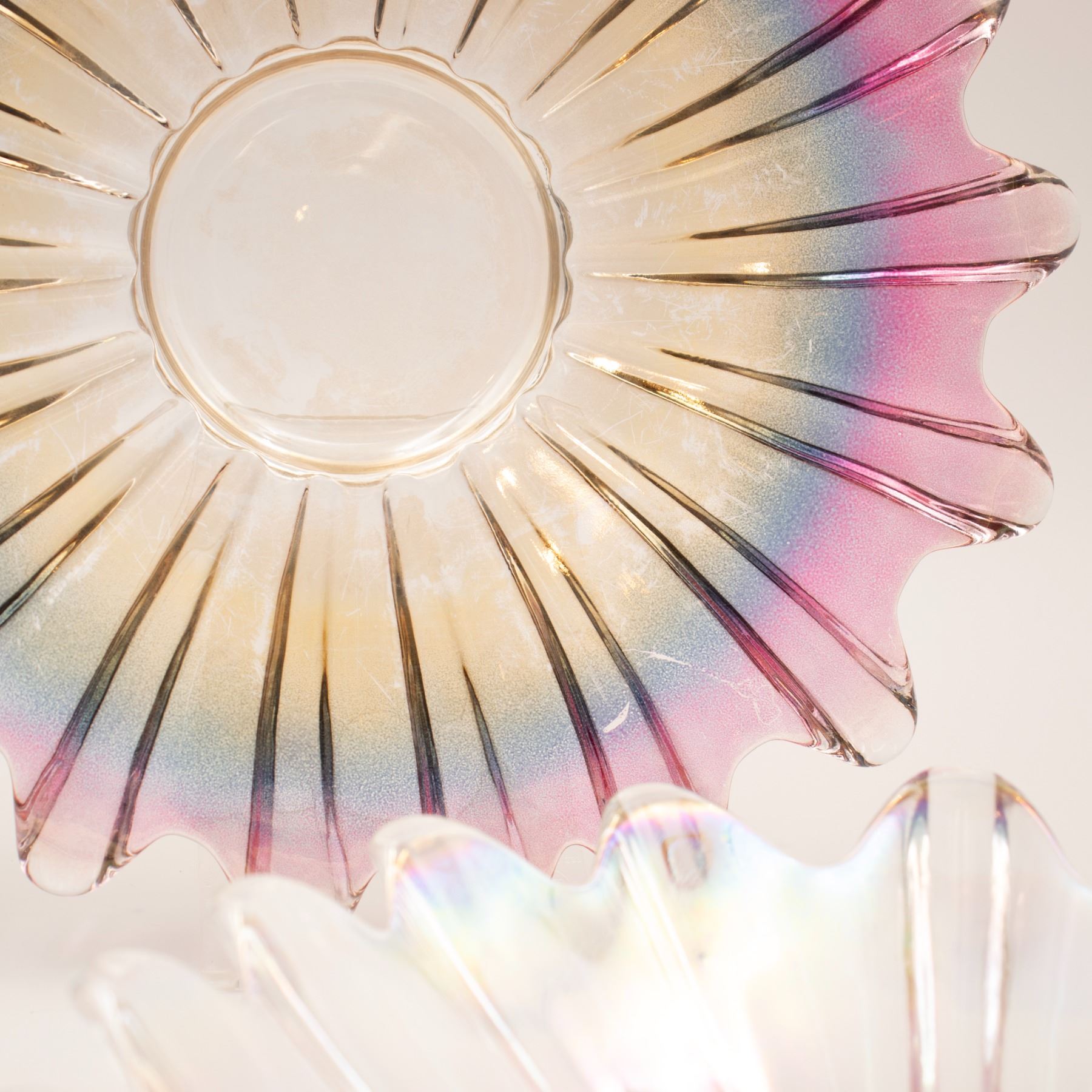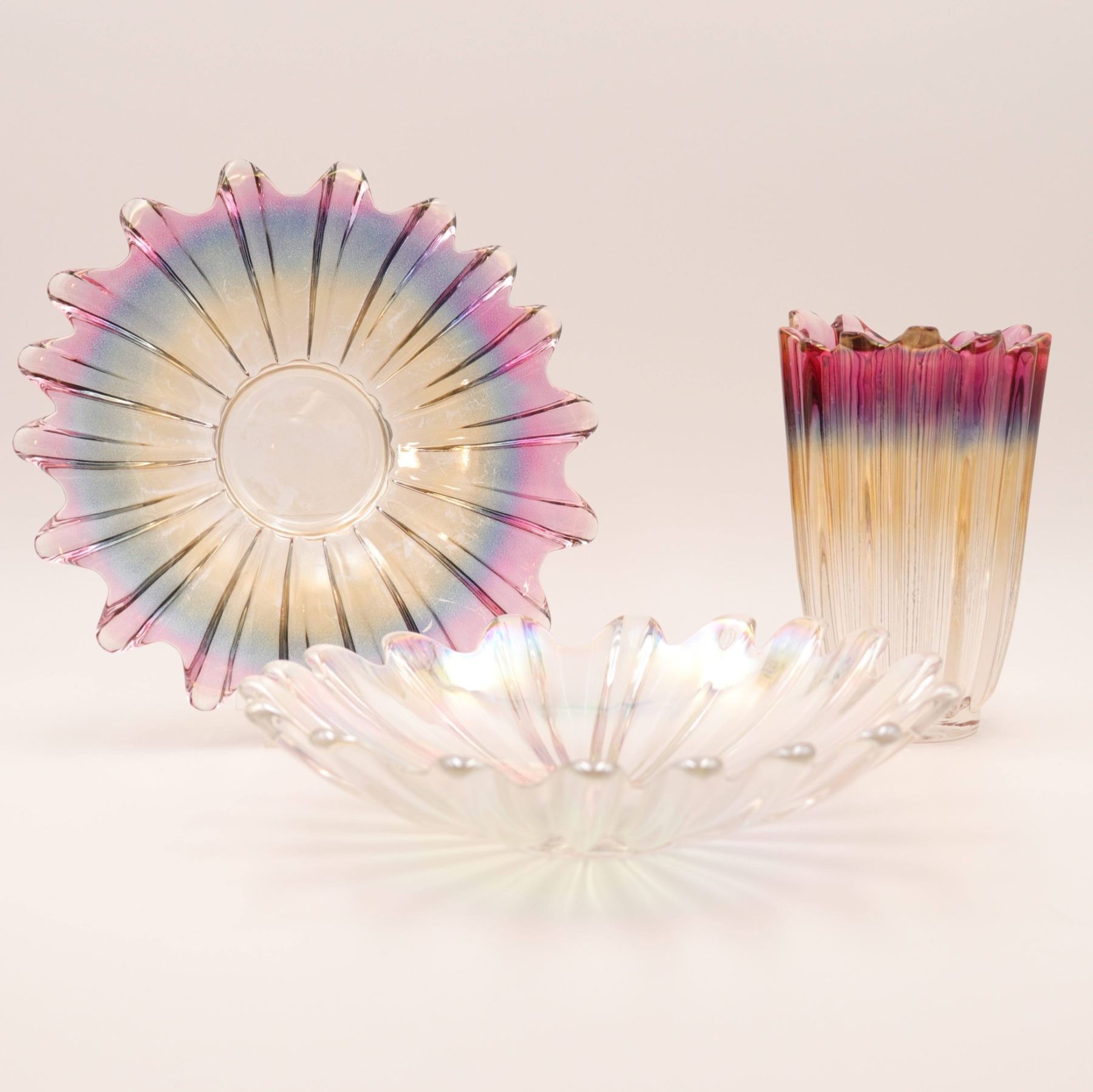 Beautiful Federal Glass Celestial Gem set, featuring one flower vase with a flared rim, one platter, and one large bowl. Renowned for their quality glassware, Federal Glass was a prominent manufacturer in the mid-20th century, known for their innovative designs and vibrant patterns that captured the essence of the era. The Celestial Gem pattern, with its starburst and moon glow motifs, reflects the bold aesthetic of the 1960s and 1970s, making it a favorite among interior designers. All pieces in this set are in good condition, showcasing only minor signs of wear. Perfect for display or functional use.