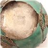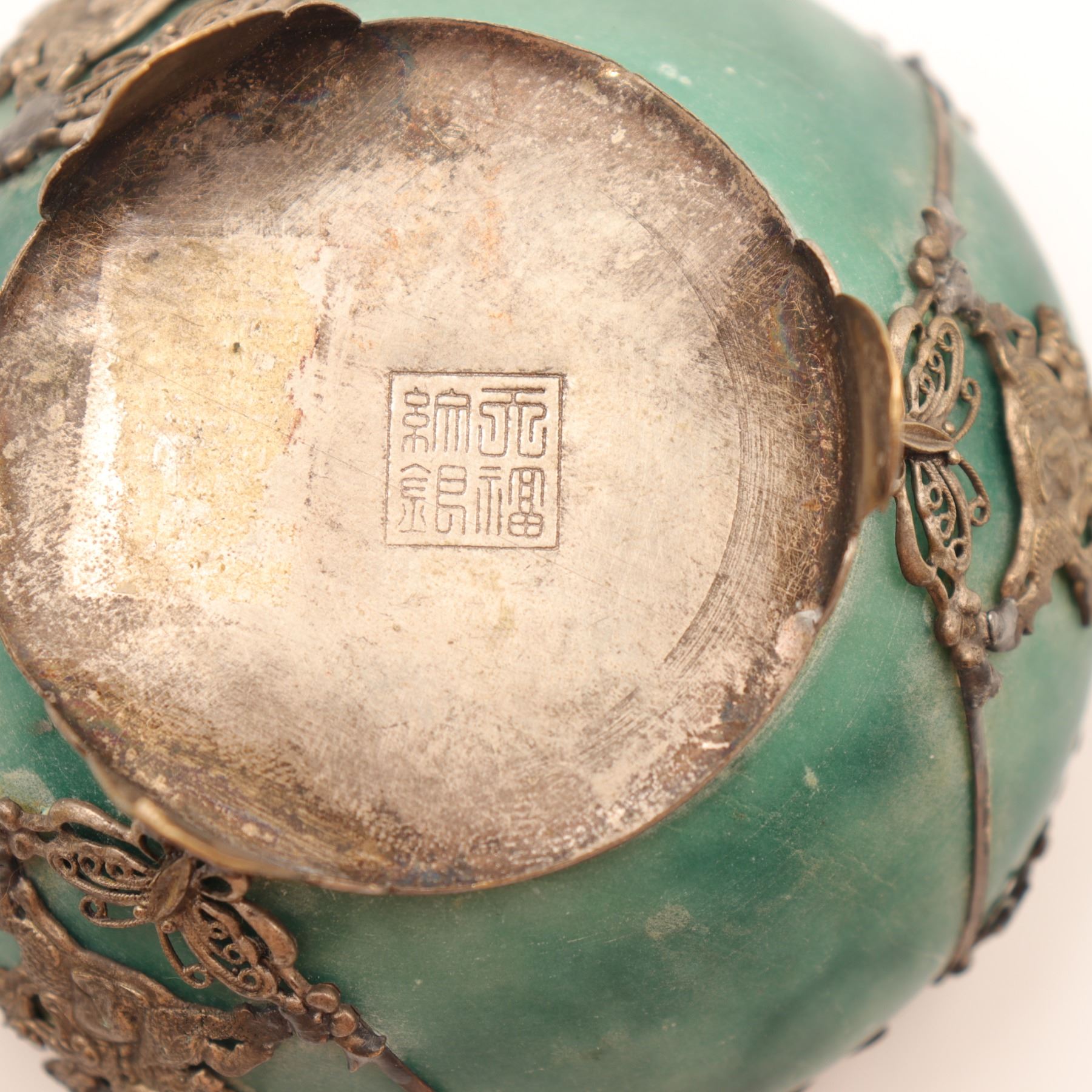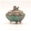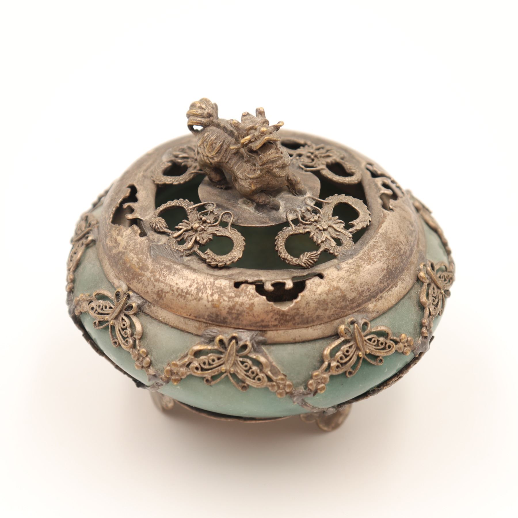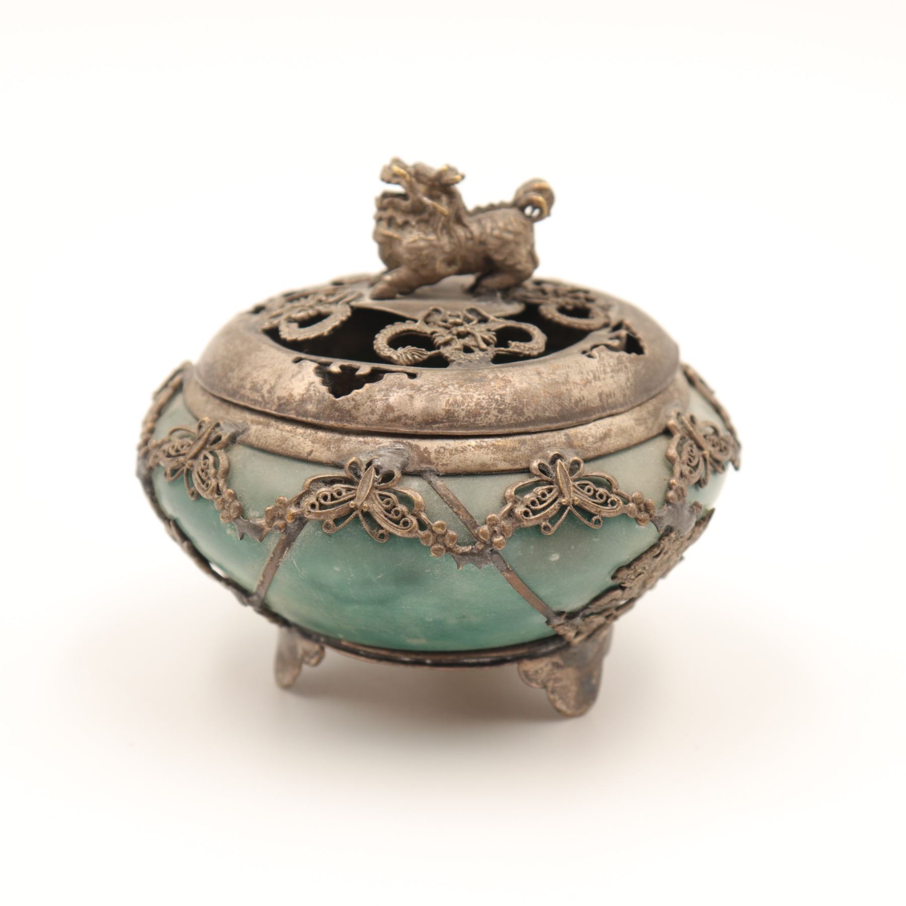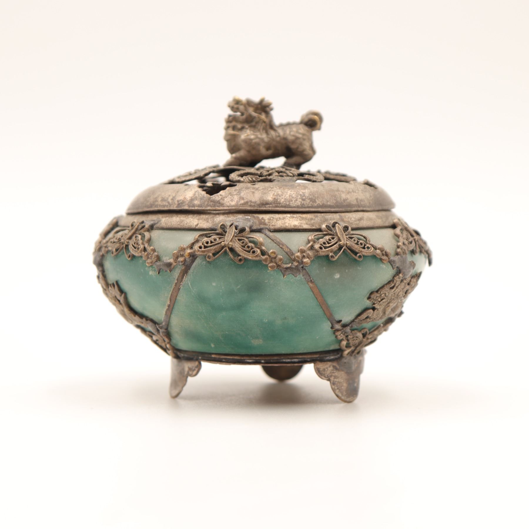 Finely carved from a single block of green hardstone, likely jadeite, hollowed and rounded to form a vessel on three feet. The body is overlaid with delicate applied silver filigree mounts worked with butterfly and floral motifs. The pierced silver cover is surmounted by a Foo dog finial. The base bears an auspicious four-character mark Fu Lu Shou Xi (“Happiness, Prosperity, Longevity, Joy”), commonly used in the Republic era to invoke blessings. Dimensions: approx. 8–9 cm diameter. Condition: Tarnish and surface wear to silver consistent with age; stone body intact with natural inclusions.