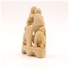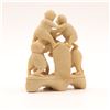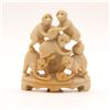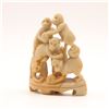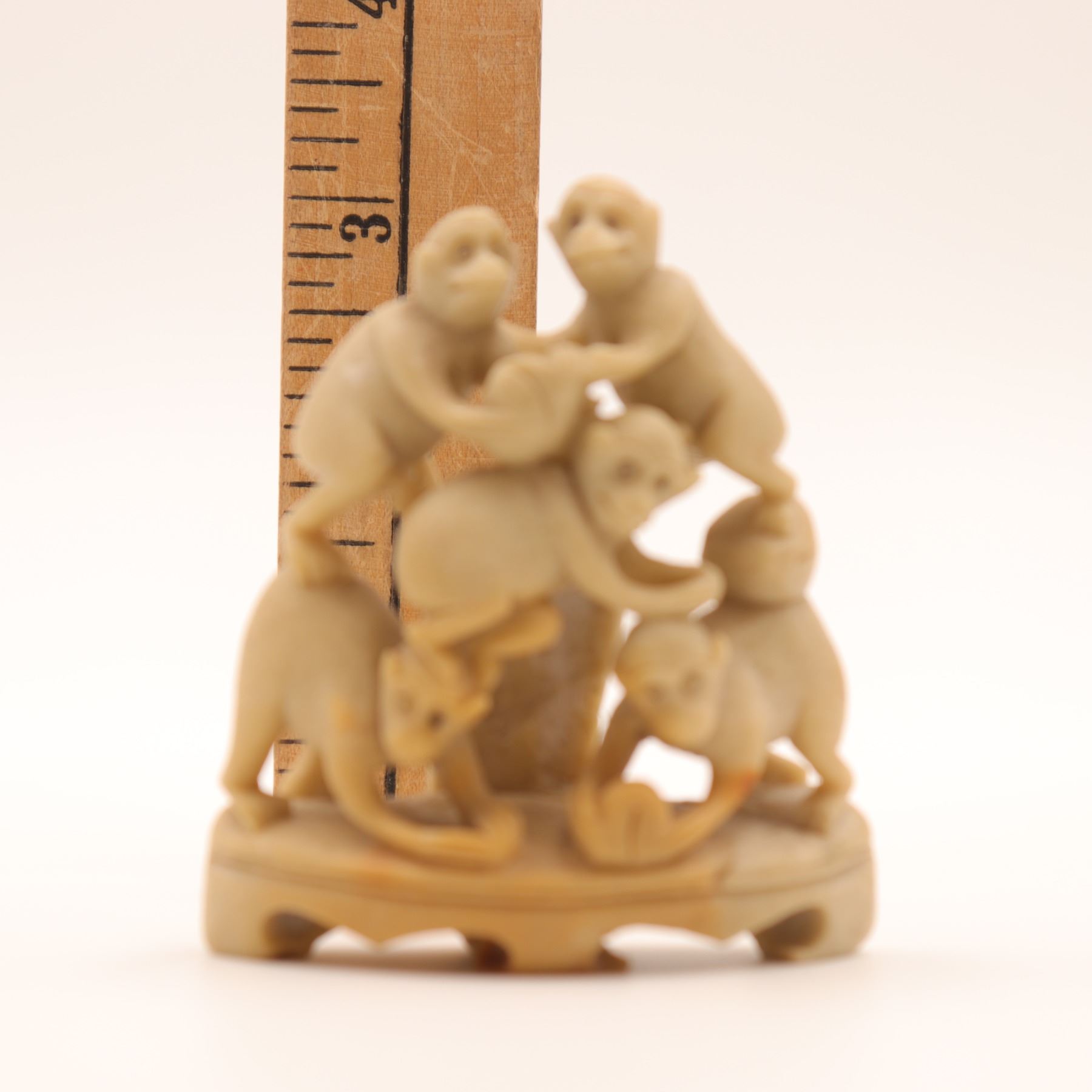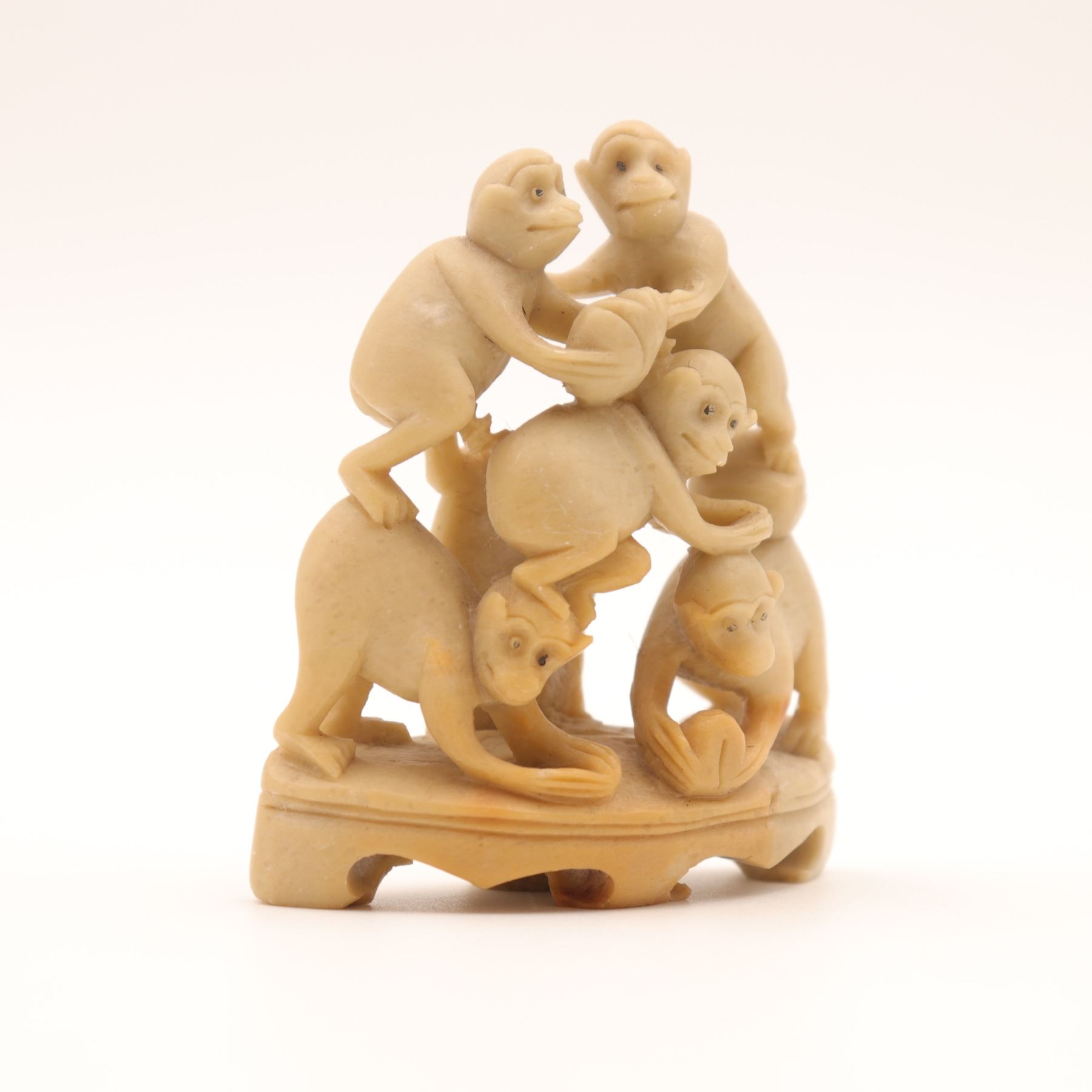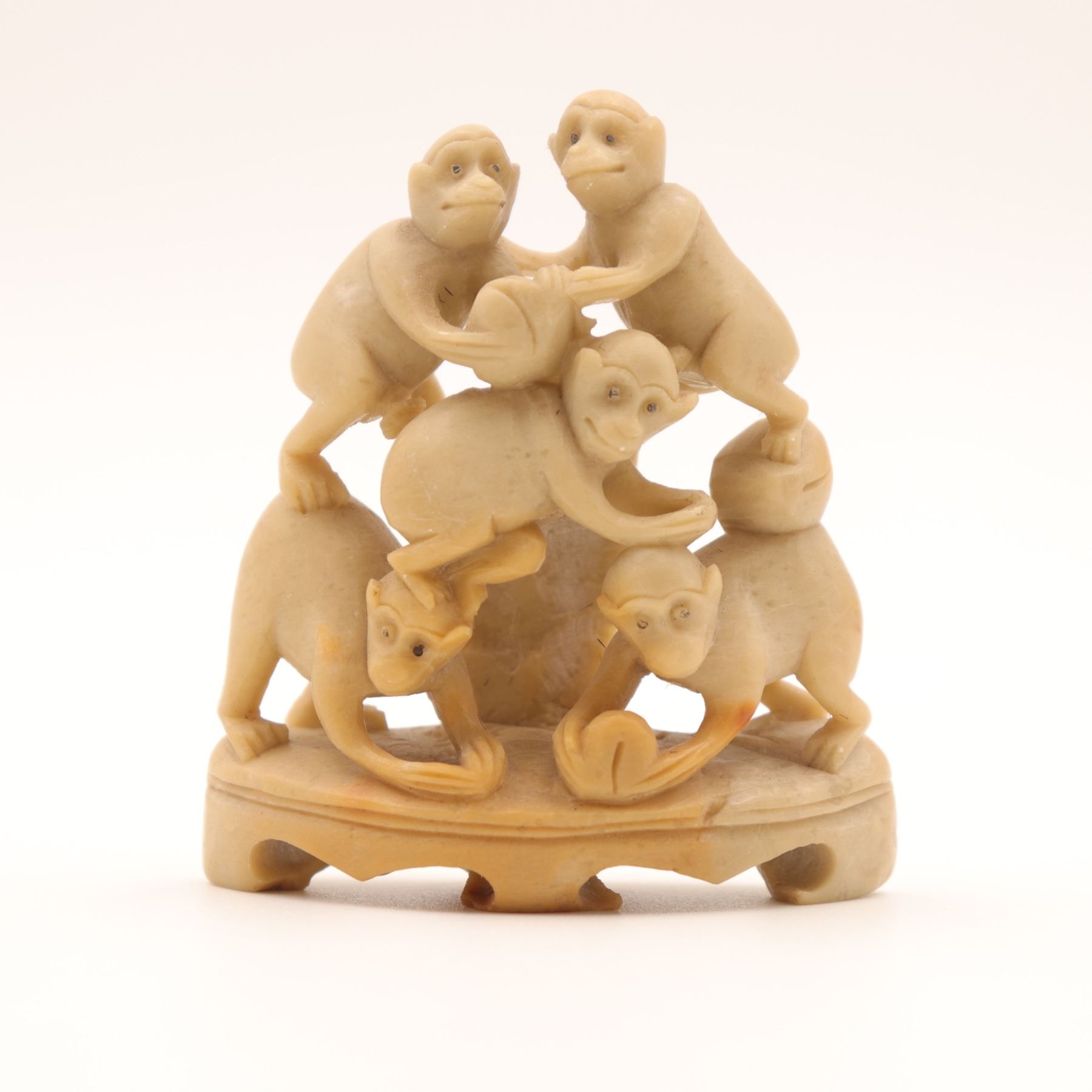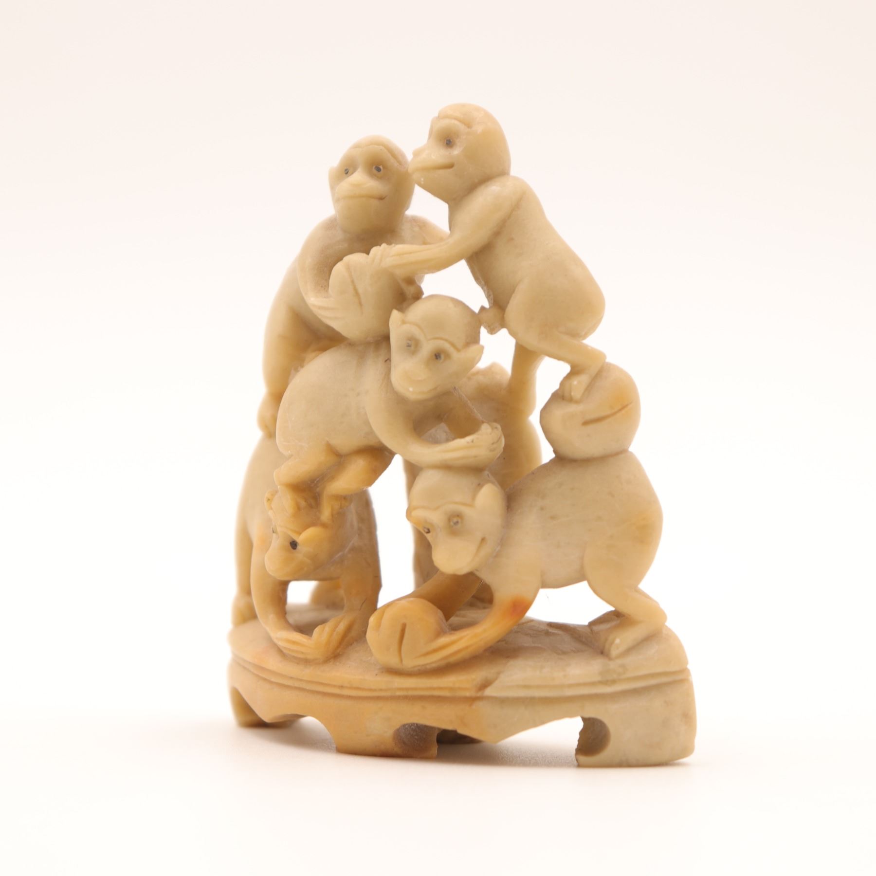 A charming Chinese carved soapstone figural group, depicting five monkeys climbing and playing atop an integral shaped base, the lower figure holding a small fruit or ball. Carved from a warm creamy-beige stone with natural veining and good detail to faces and limbs. A lively small scholar’s or desk ornament.
