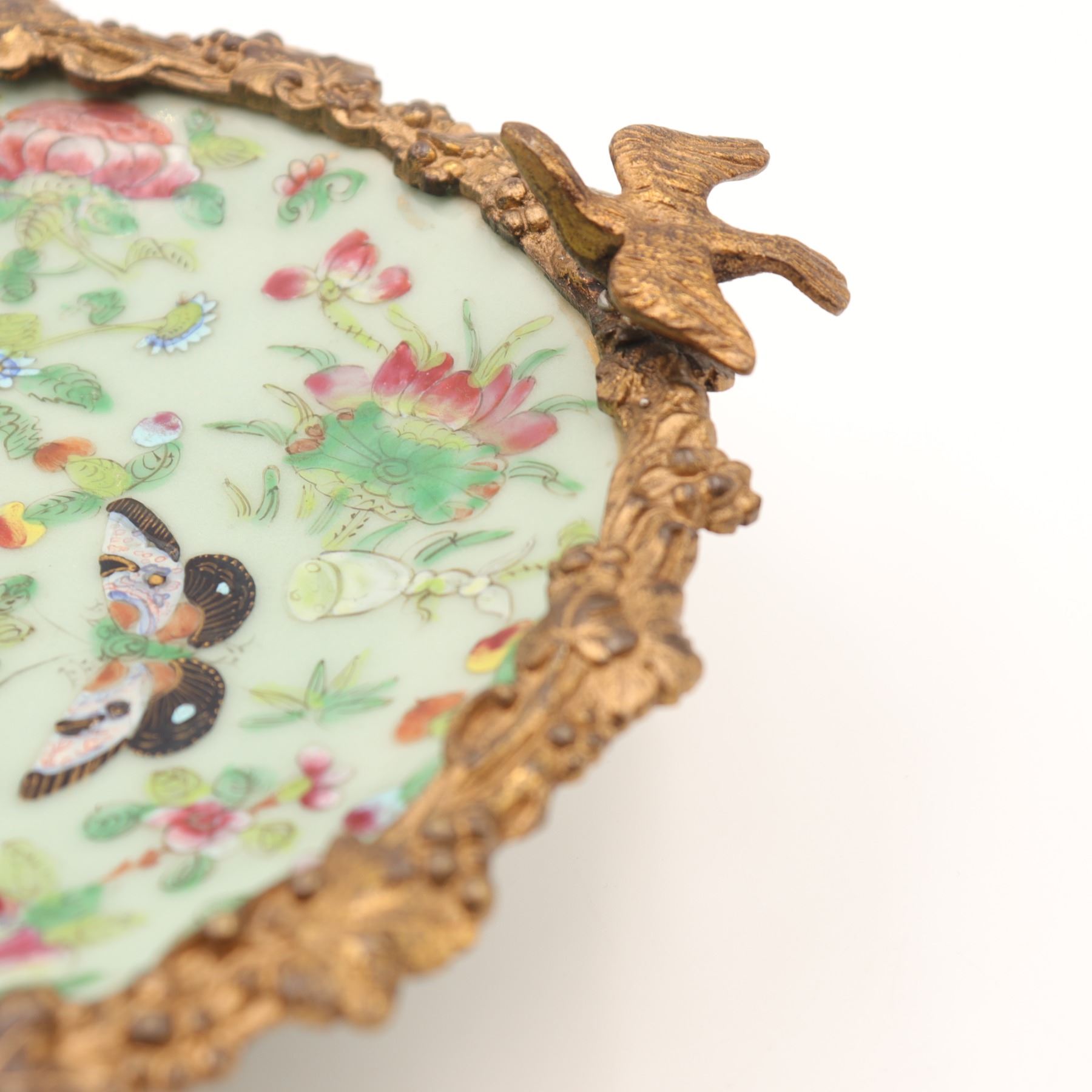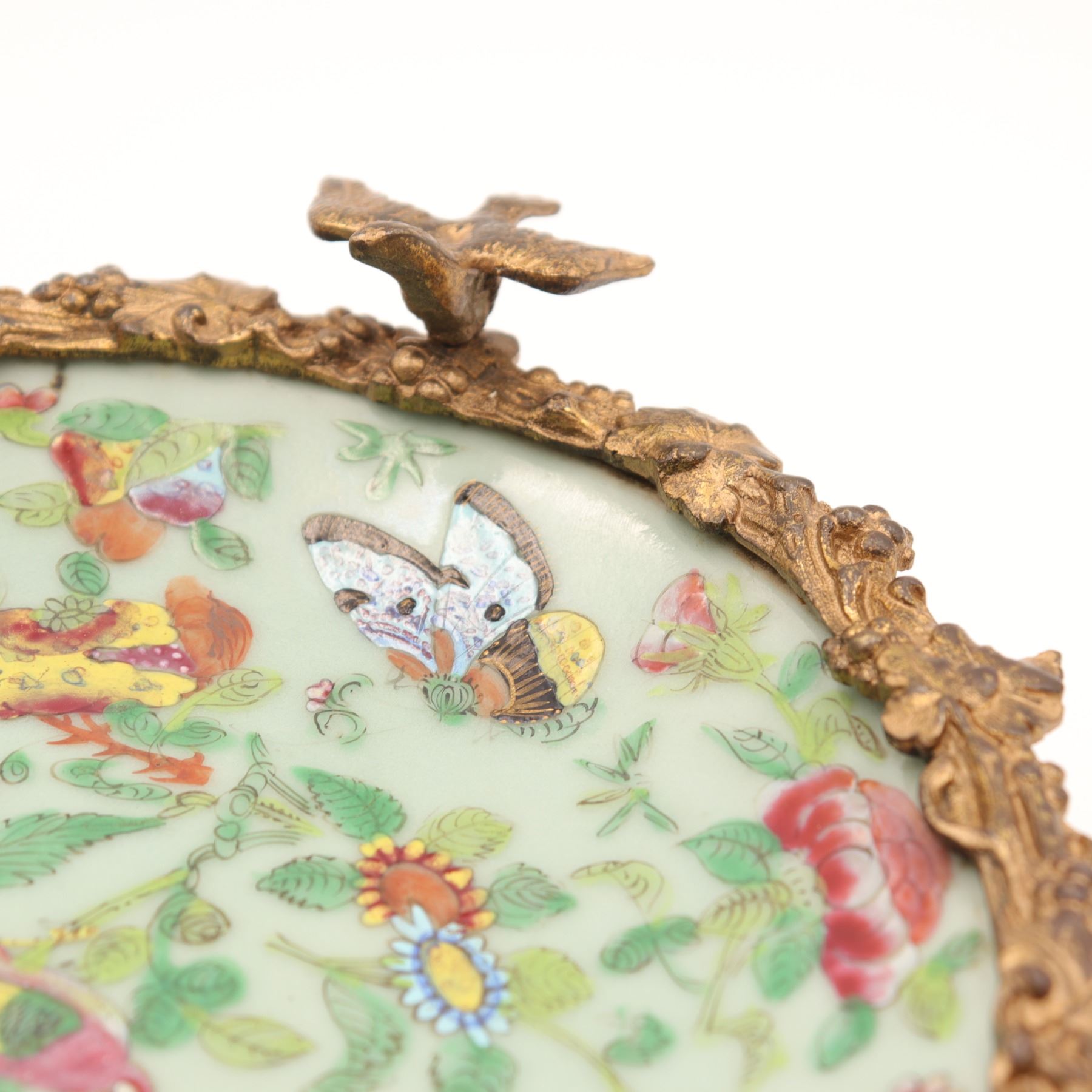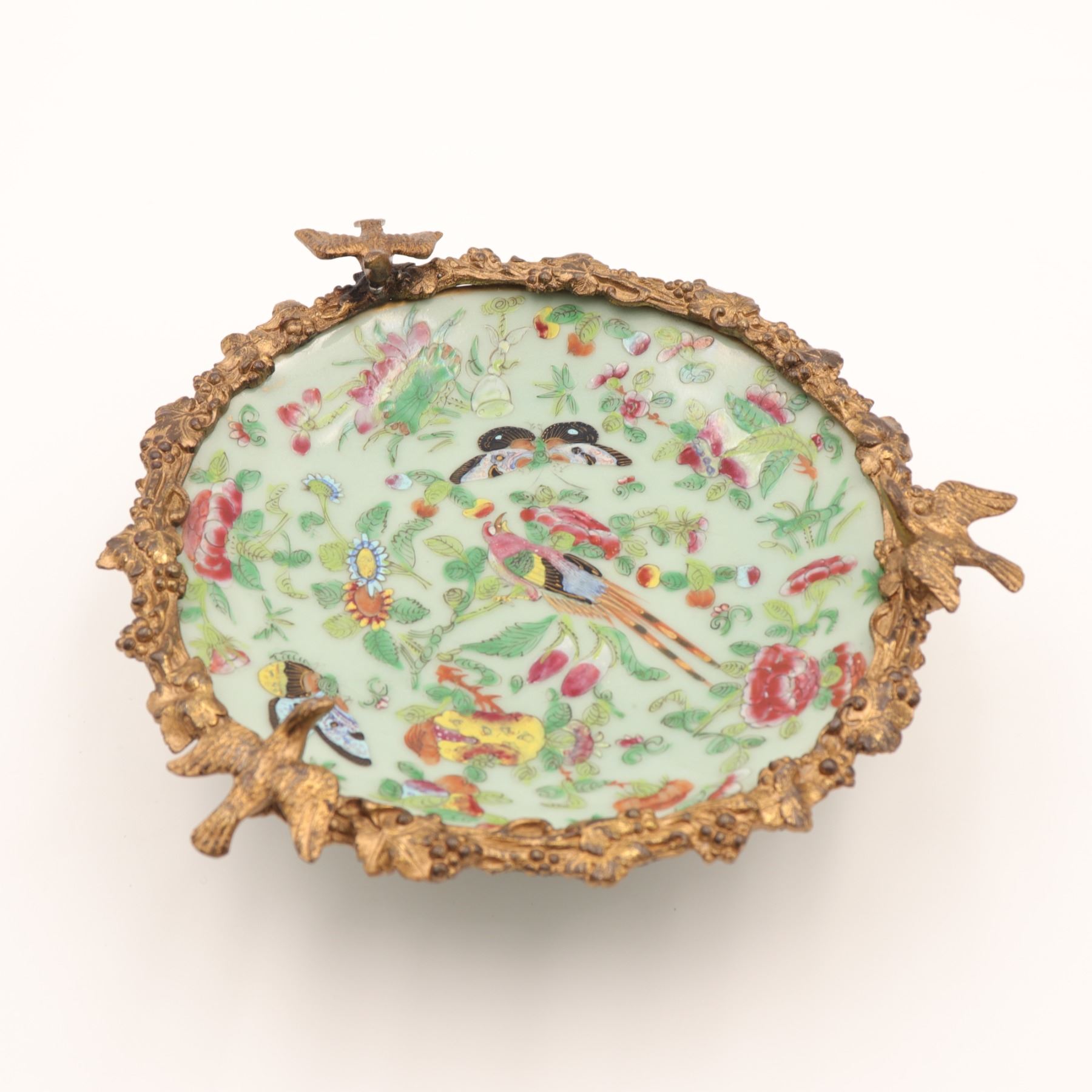 Chinese Celadon and Famille Rose Plate in French Gilt-Bronze Mount, Late 19th Century