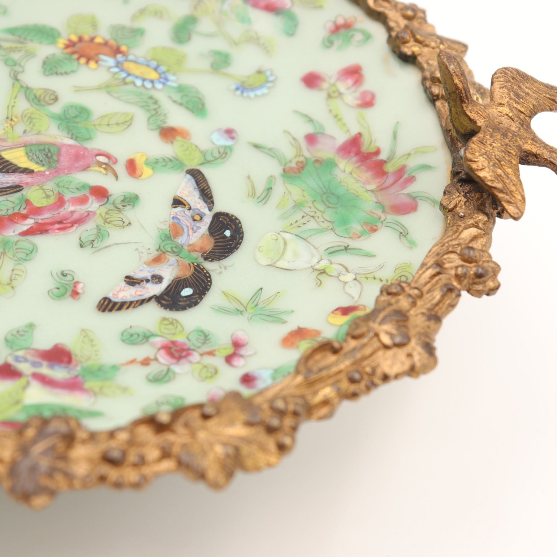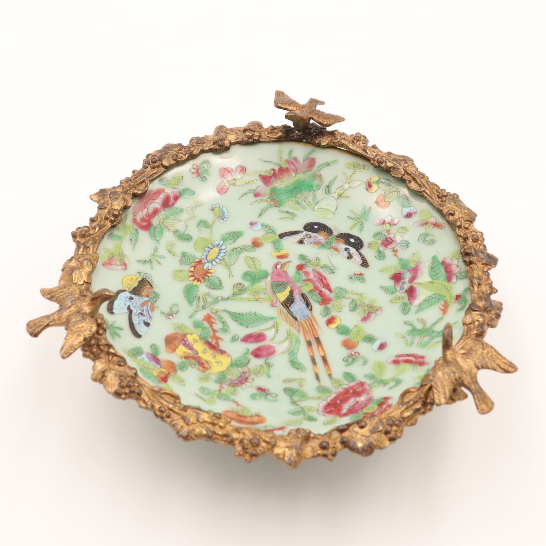 A Chinese porcelain plate, late Qing dynasty, with pale celadon glaze finely enamelled in the famille rose palette with birds, butterflies, flowers and scrolling foliage, the base bearing an underglaze blue seal mark, adapted in Europe and mounted within an elaborate French gilt-bronze frame modelled as rockwork with three naturalistic birds perched around the rim.