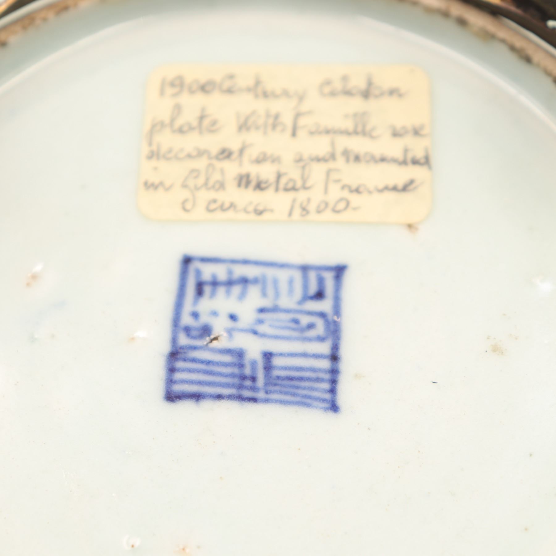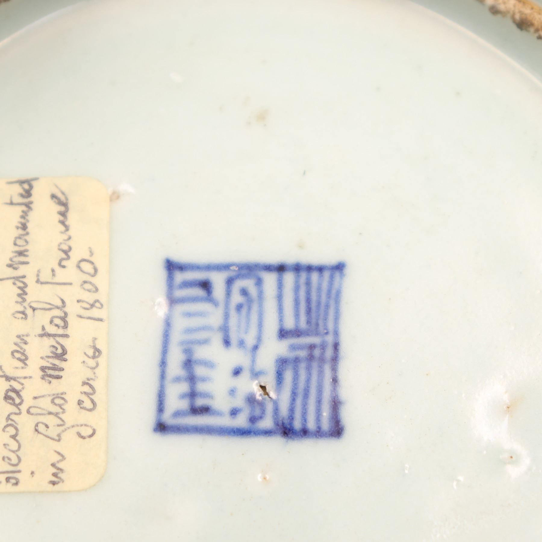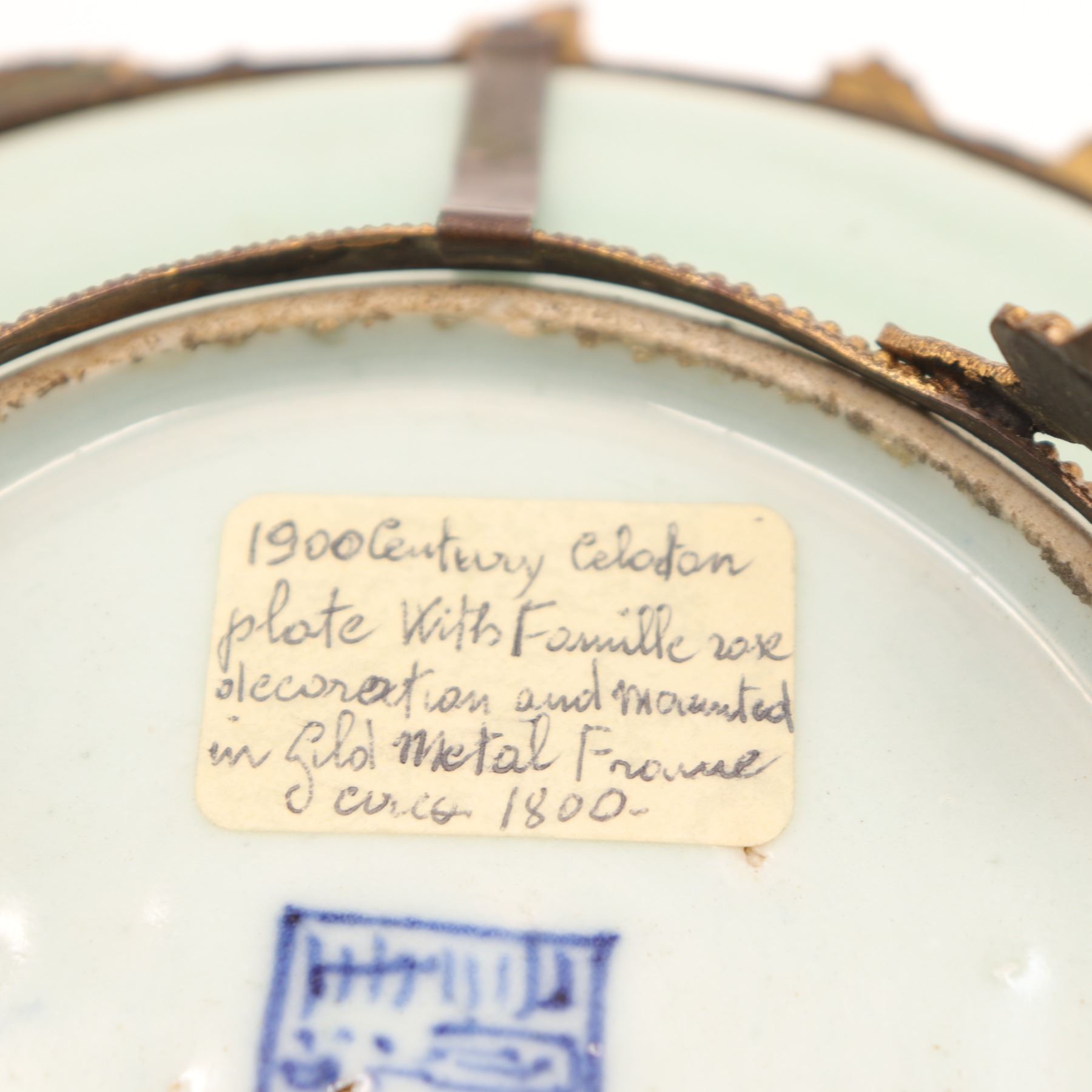 Condition: Plate in very good condition with no apparent rim chips or cracks, enamels bright; small drilled hole to base from earlier mounting. Gilt-bronze mount with rubbing and oxidation to gilding, structurally sound.