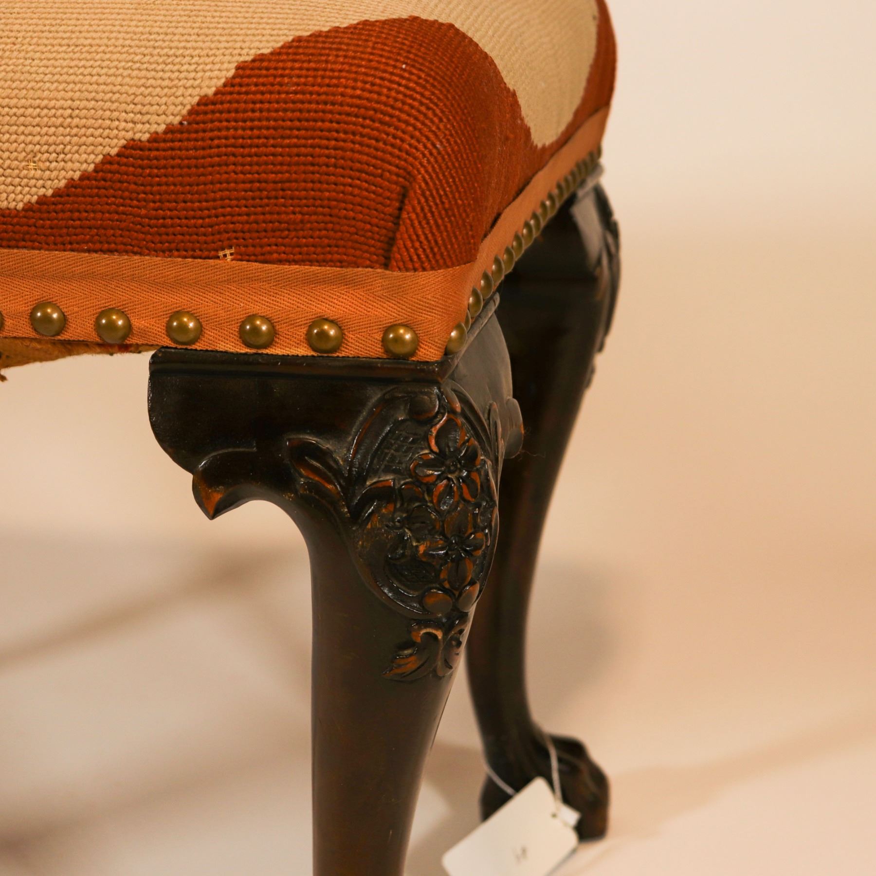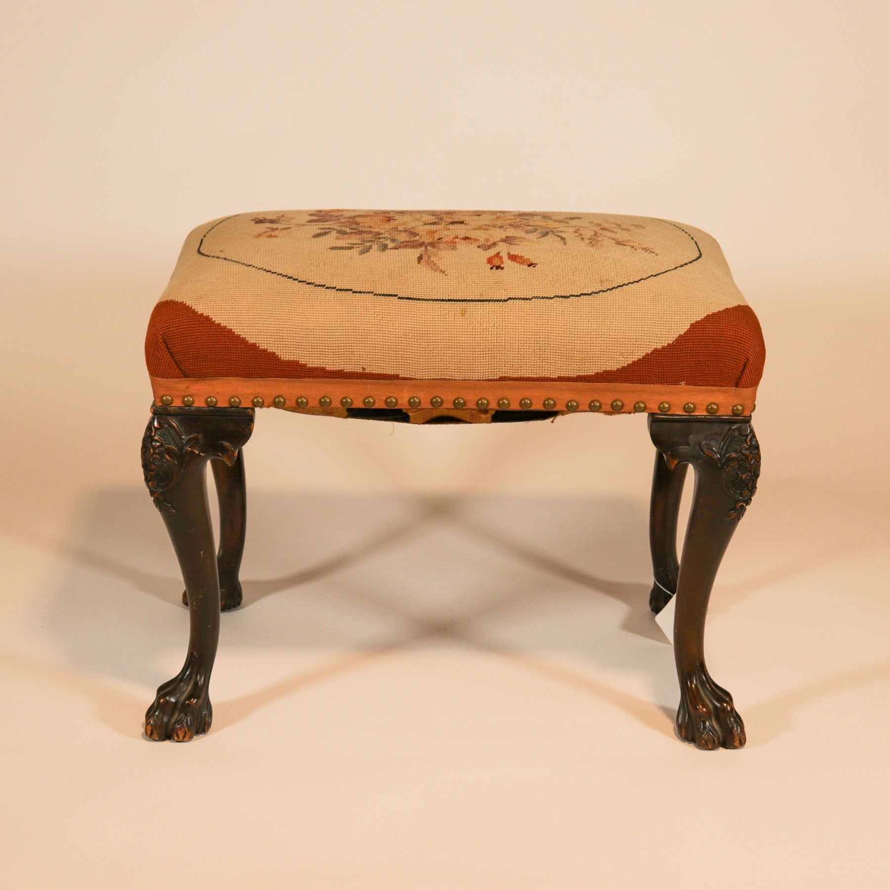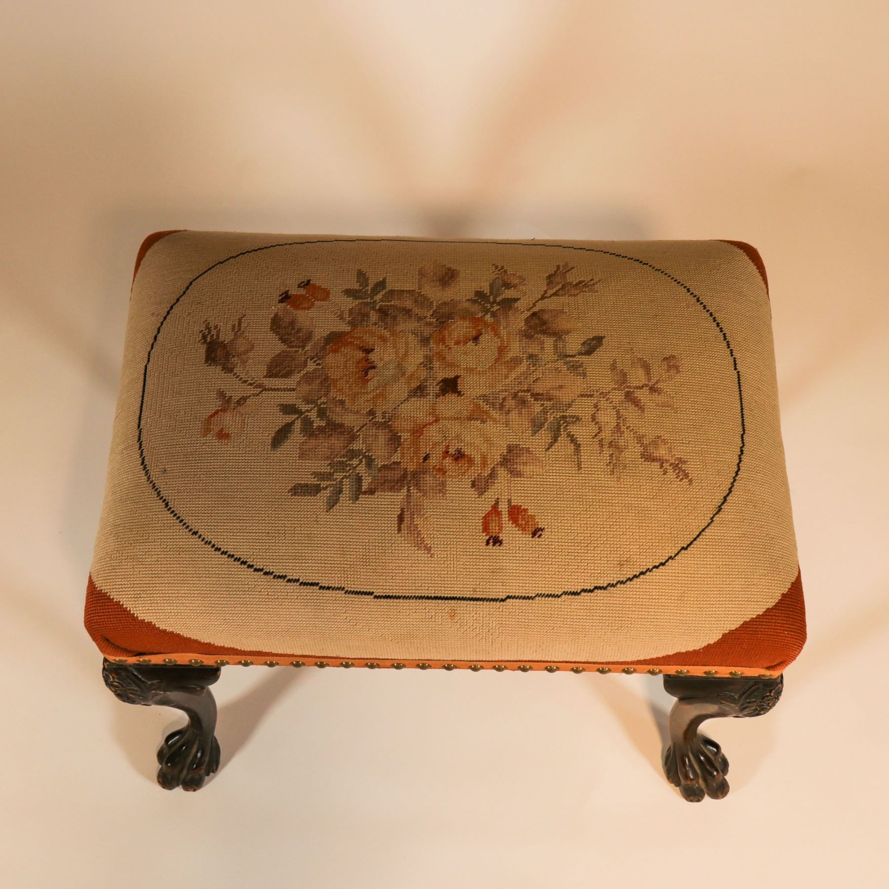 Chippendale Revival Needlepoint Upholstered Footstool with Carved Ball-and-Claw Feet