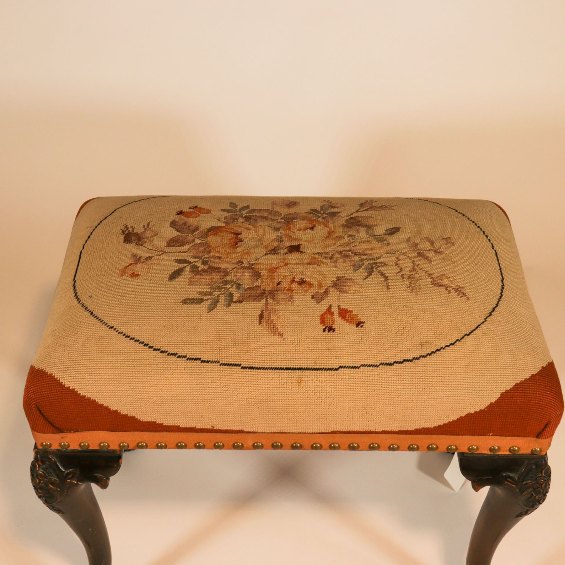 Chippendale revival footstool, early–mid 20th century, the rectangular seat upholstered in floral needlepoint depicting a bouquet of pastel blossoms within an oval reserve on a tan ground with rust-colored corners, secured with brass nailhead trim, raised on four cabriole legs with carved foliate knees terminating in ball-and-claw feet. The seat requires re-webbing/support and is sold for restoration. Approx. 24 in. wide, 17 in. deep, 19 in. high.