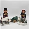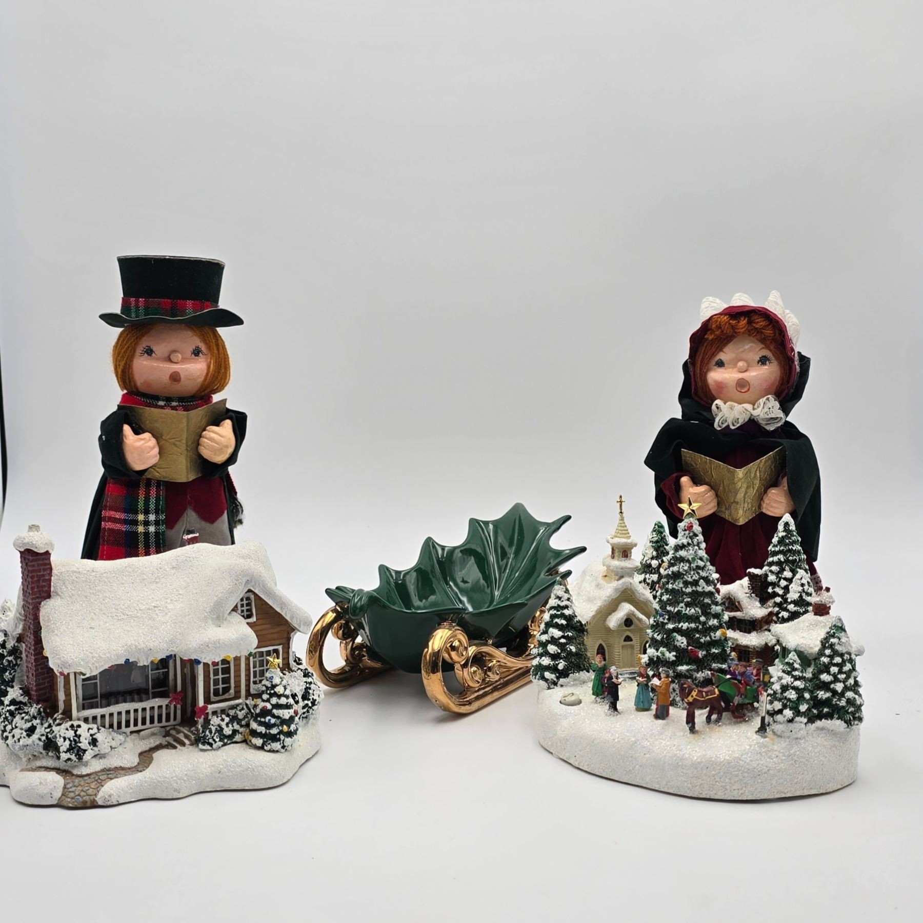 Christmas village scenes (battery operated); mistletoe sleigh bowl (slight damage); caroller décor