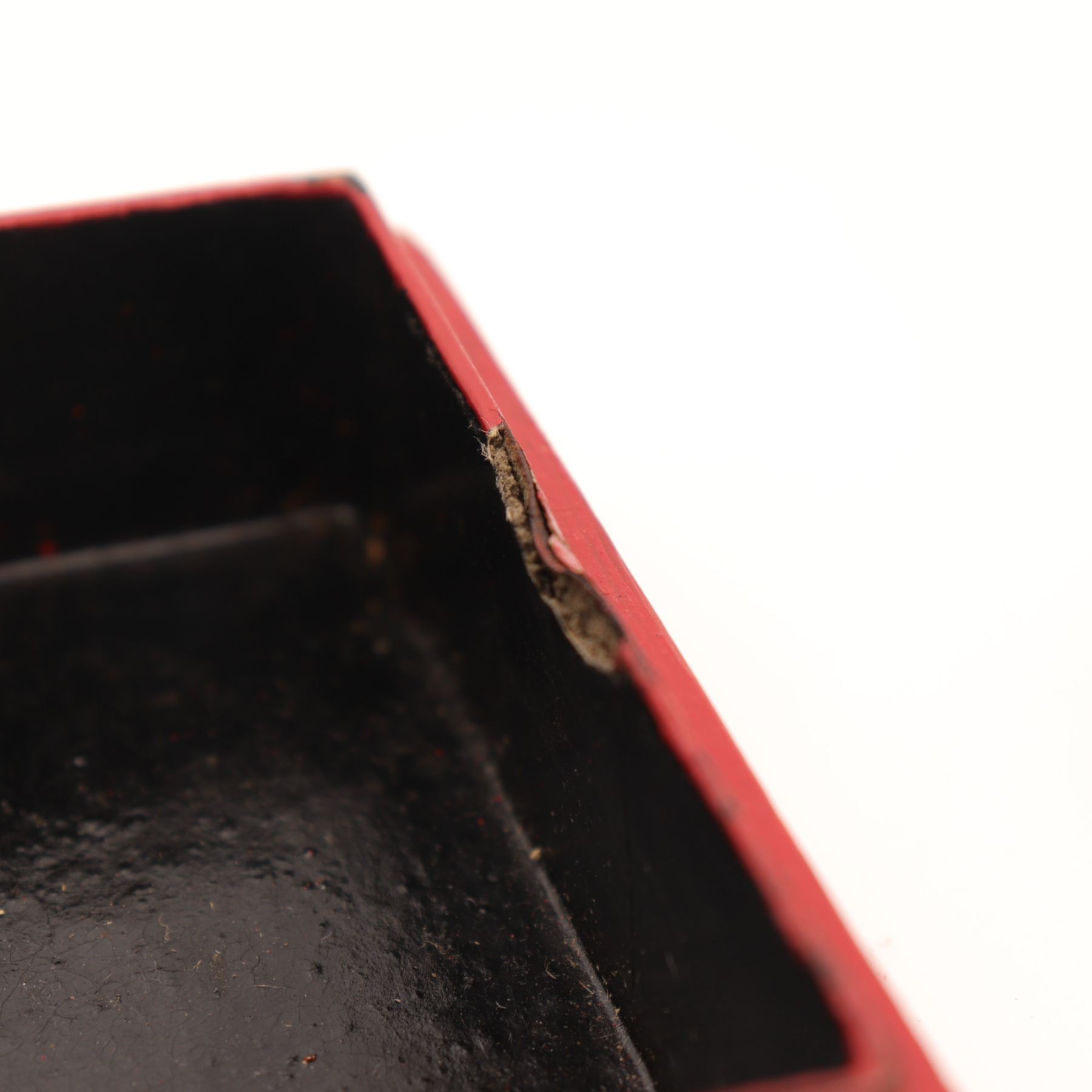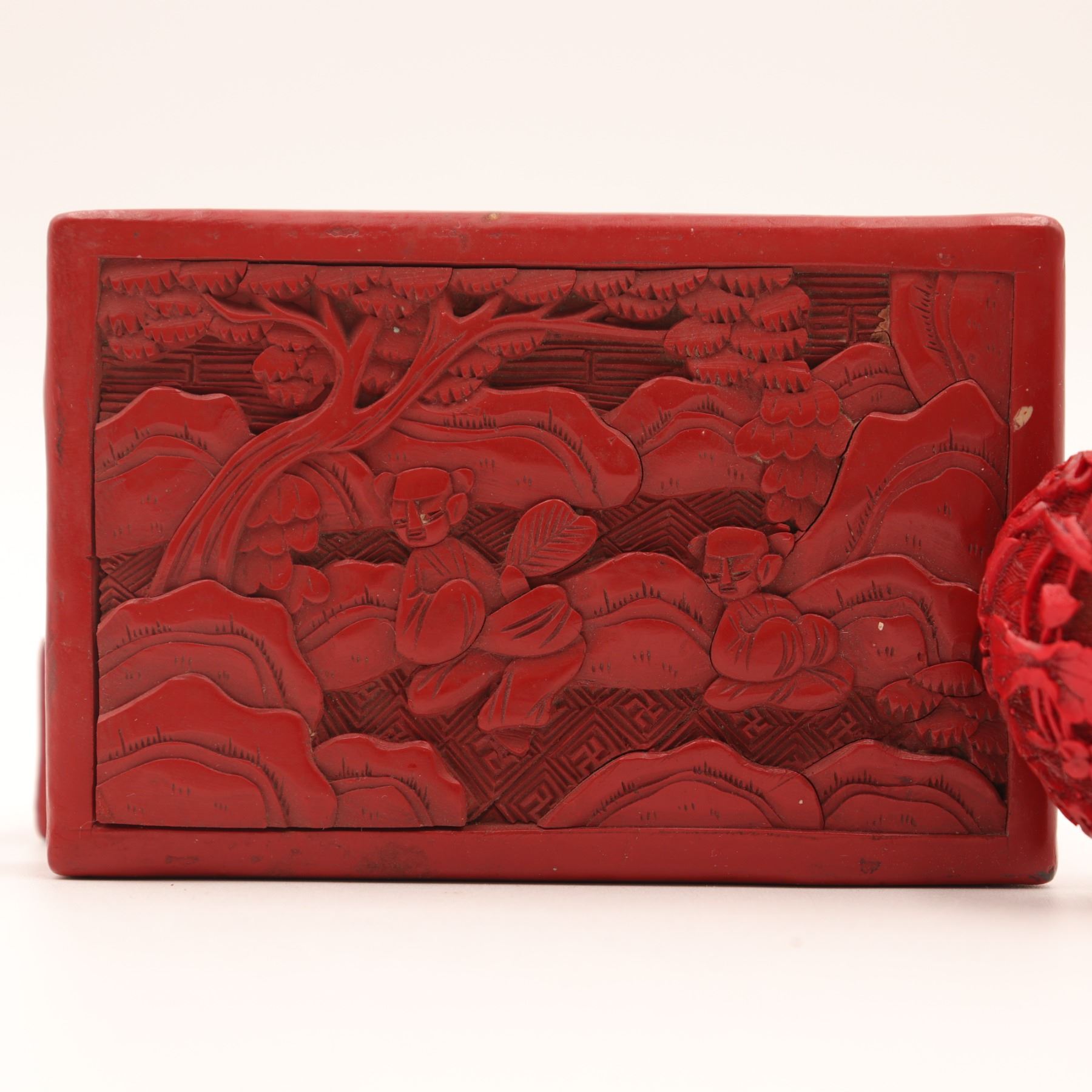 Pair of mid-20th-century Chinese cinnabar lacquer items comprising a rectangular trinket box carved with scholars in landscape and marked CHINA to the base, approx. 4 x 2½ x 1½ in., and a small snuff or perfume bottle carved with floral motifs and bearing an apocryphal Qianlong mark to the underside. Box with minor lacquer loss to the interior edge not visible when closed; bottle in good condition with light wear.