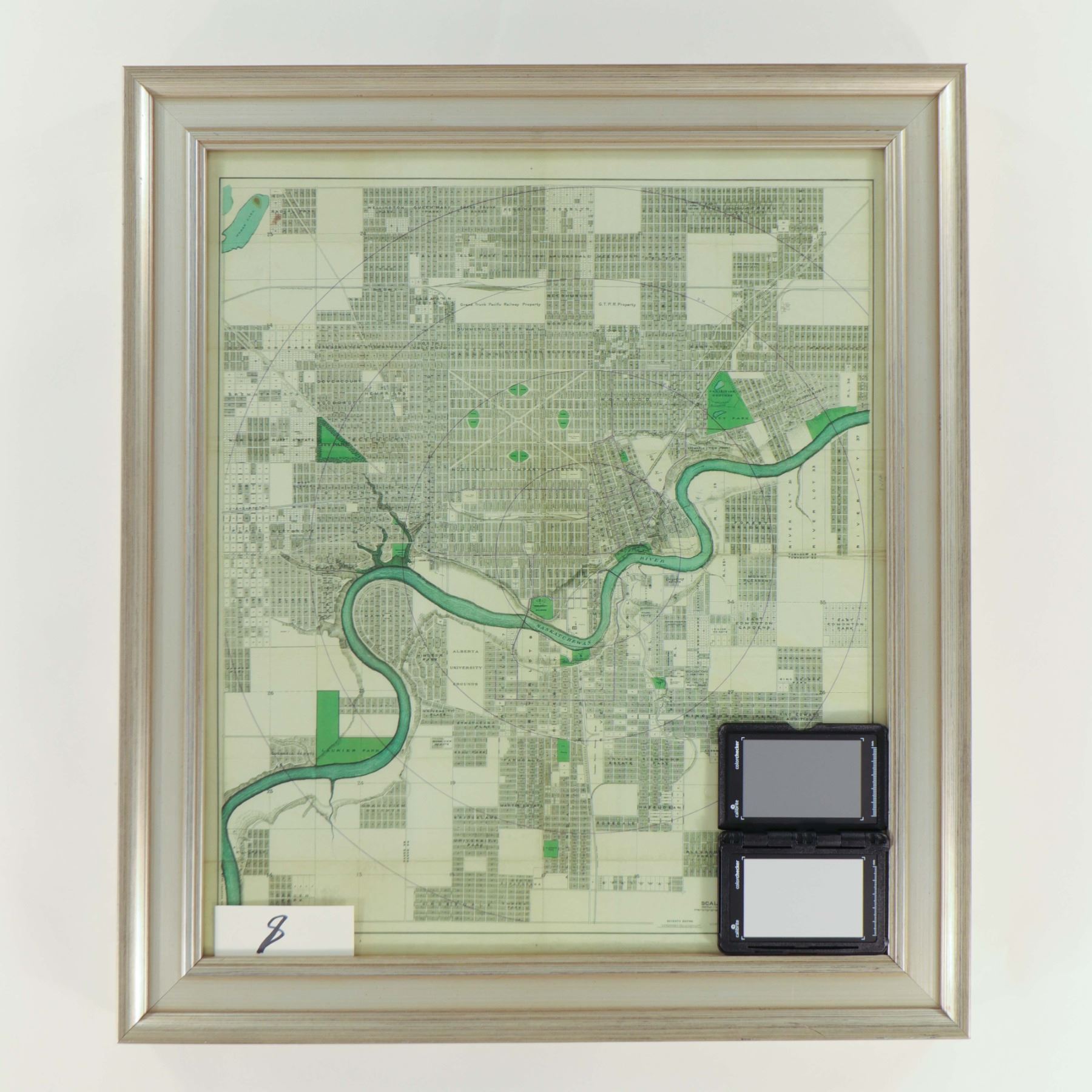 Medium: printed city planning/engineering map in green and black with parks highlighted; framed 61 × 71 cm; image ~50 × 60 cm. Dating: Hazeldean shown partially developed and river-valley rings align with mid‑1950s expansion (c. 1955–1957). Context: attractive mid‑century city plan for décor/local history collectors.