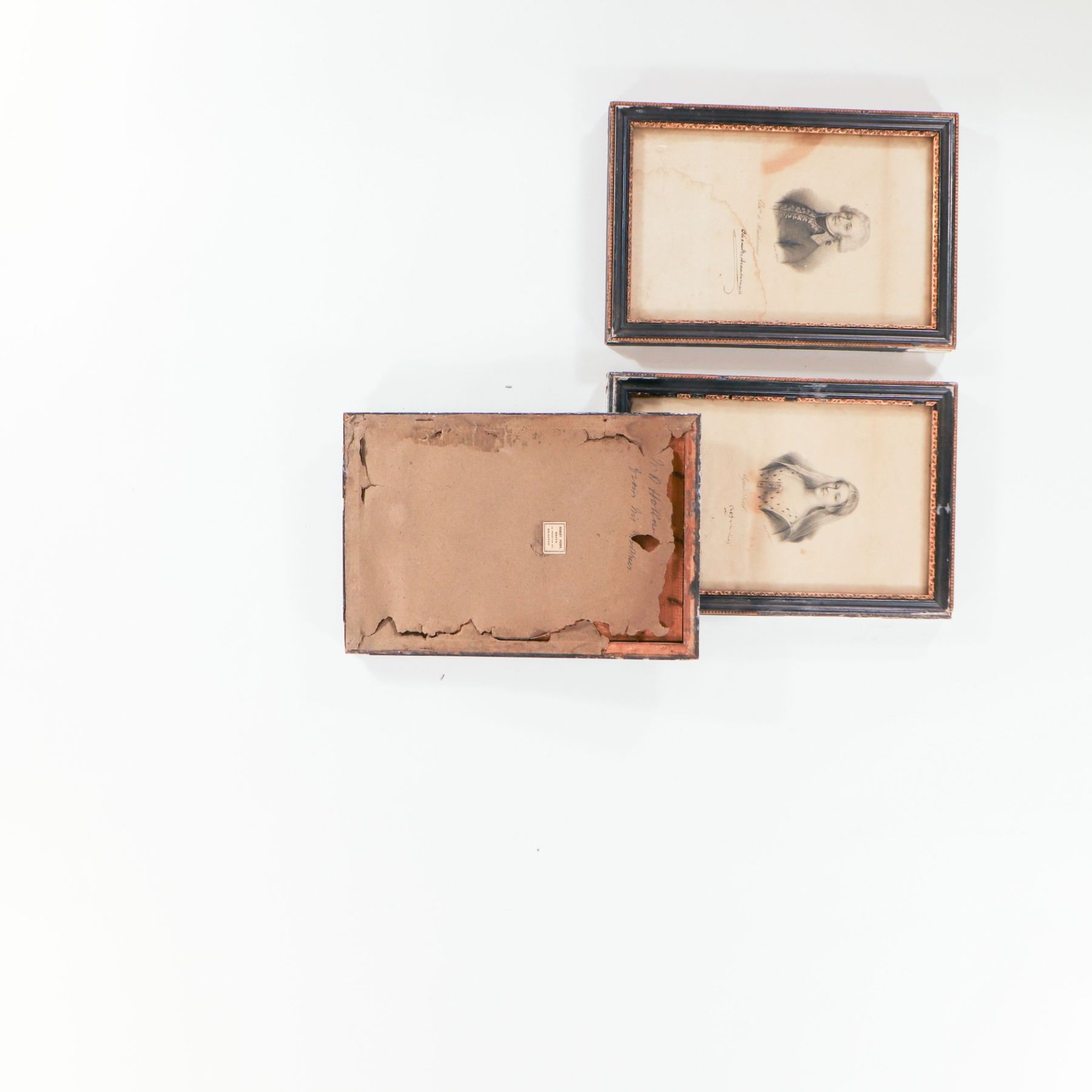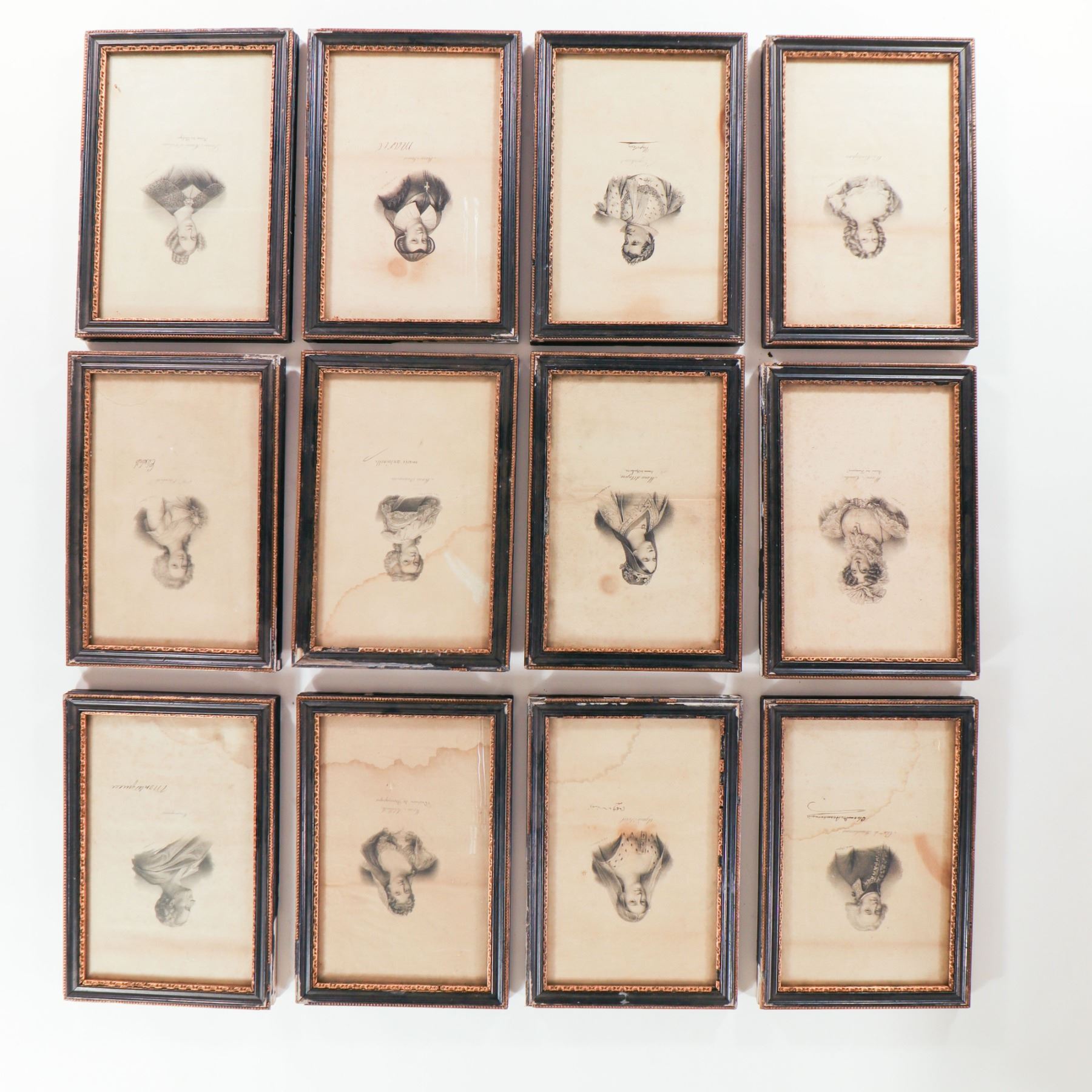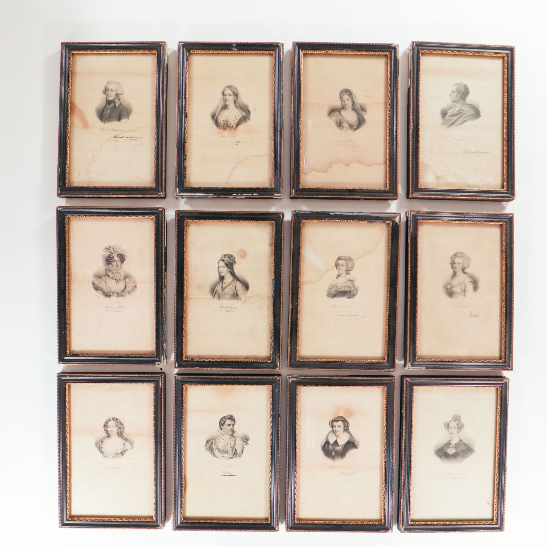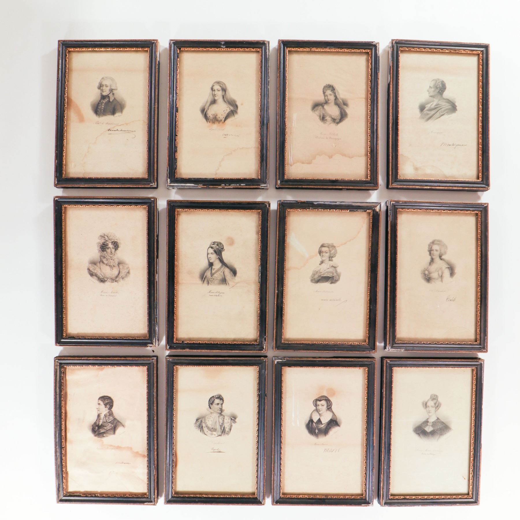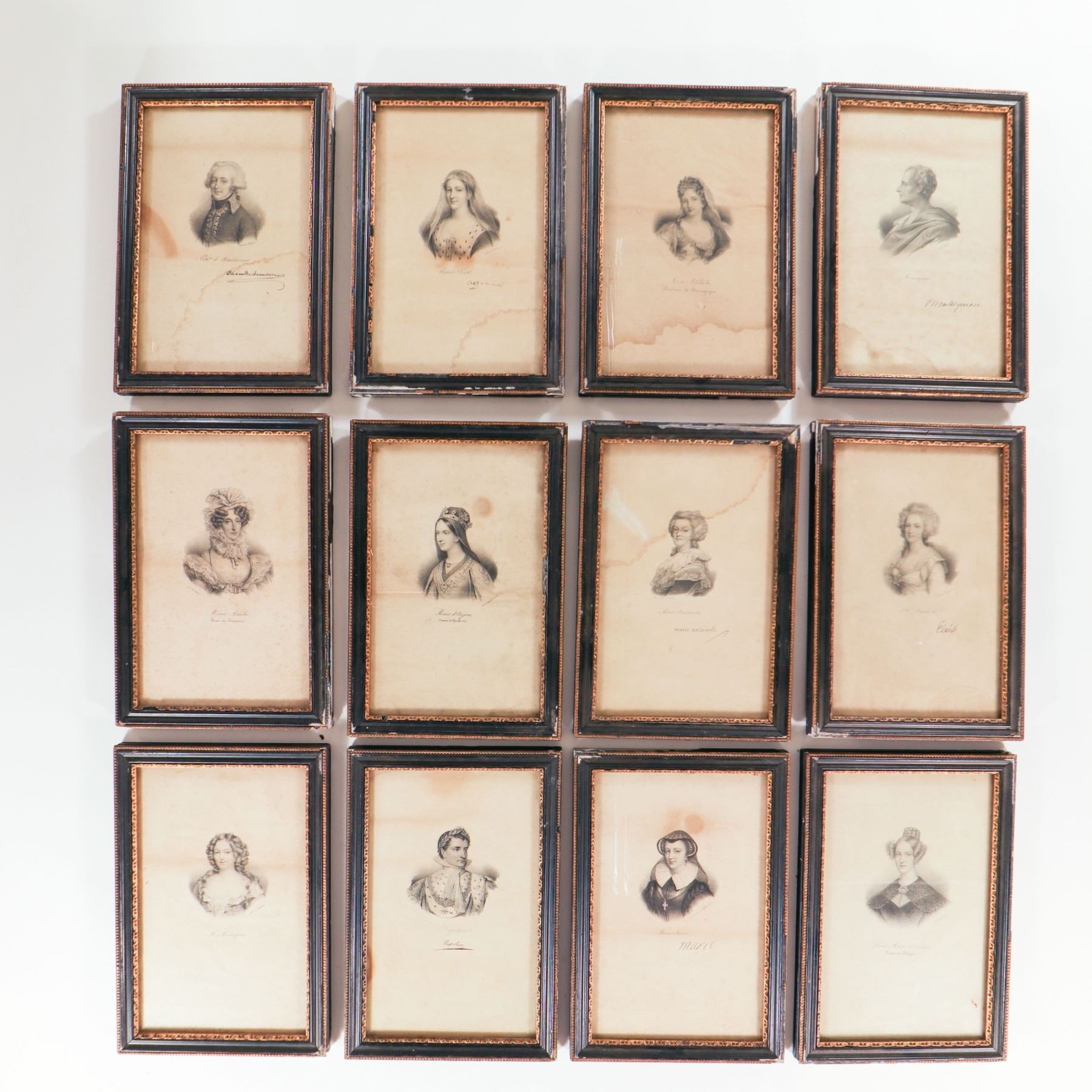 Collection of twenty-one small 19th-century engraved portraits, each presented in a narrow ebonised frame with gilt inner beading. The prints, finely worked in black on cream paper, depict various named historical sitters—predominantly ladies in early 19th-century dress with a few male figures—each identified in script in the lower margin. Most appear to be stipple or line engravings after contemporary painted portraits, likely issued as book or portfolio plates and subsequently framed en suite. Several retain remnants of old backing labels to the reverse. An attractive, period set for decorative or scholarly display.