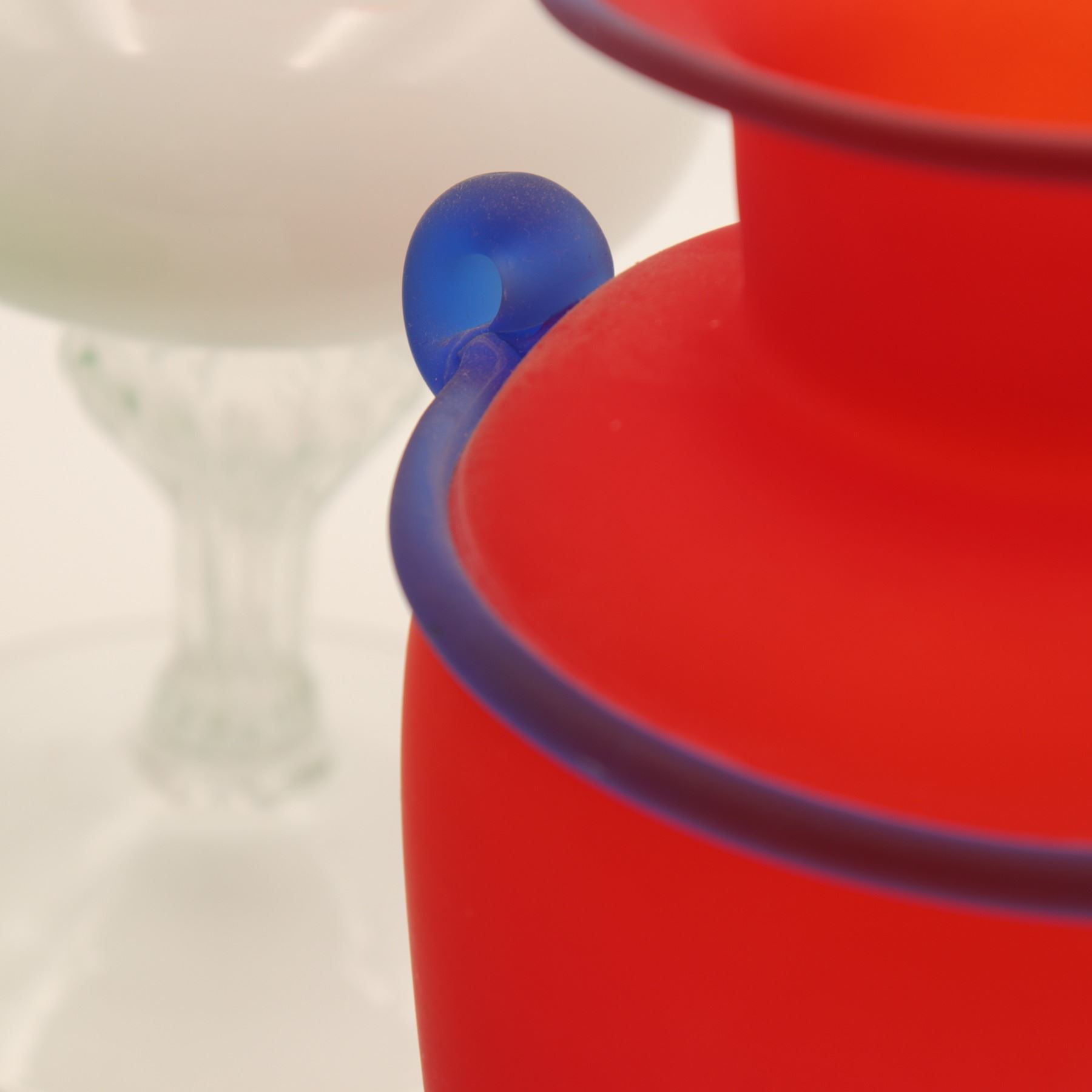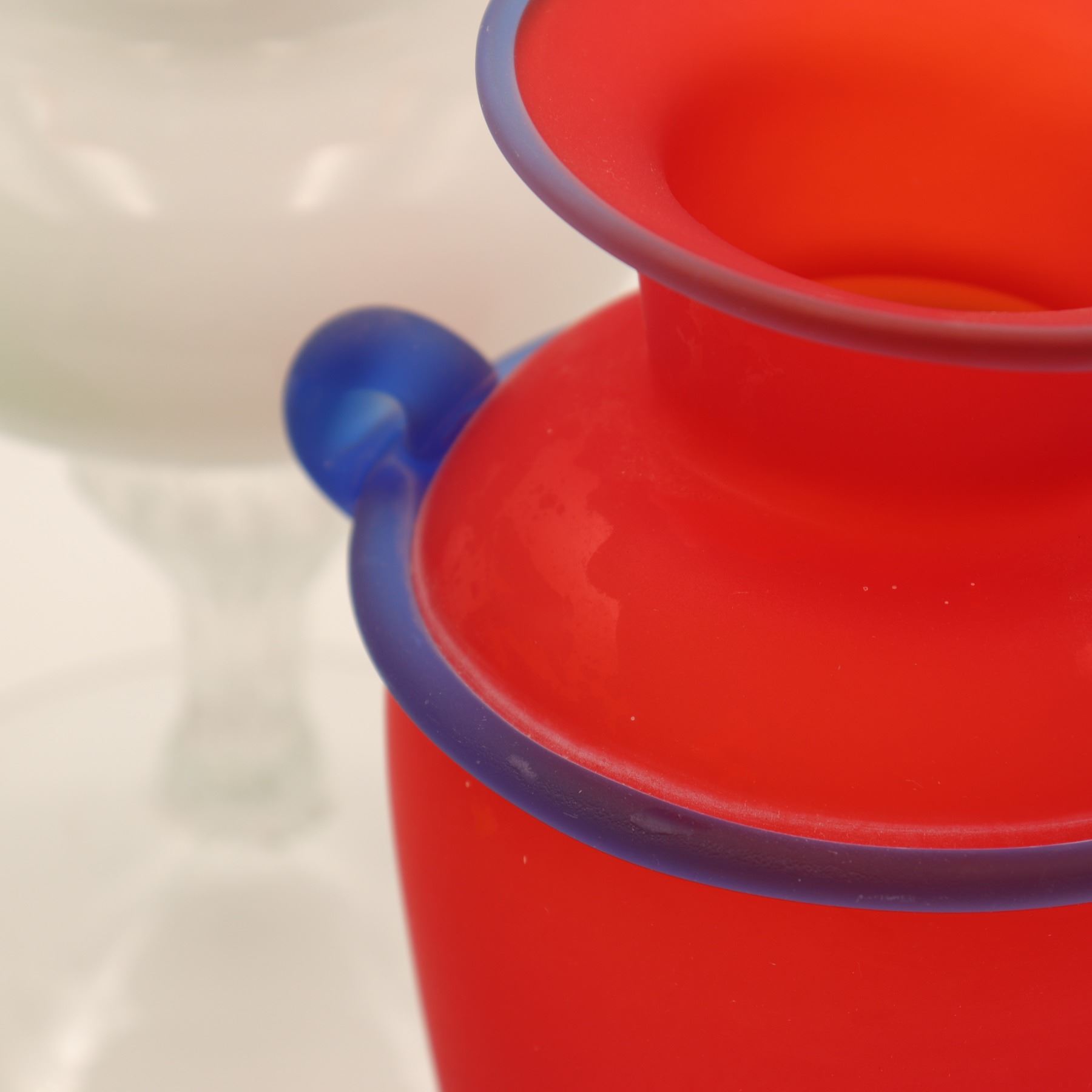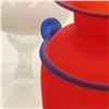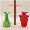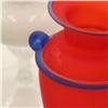 Red Vase with Blue Trim: A satin red amphora-style vase with applied cobalt blue ribbon handles and rim, height approx. 9".