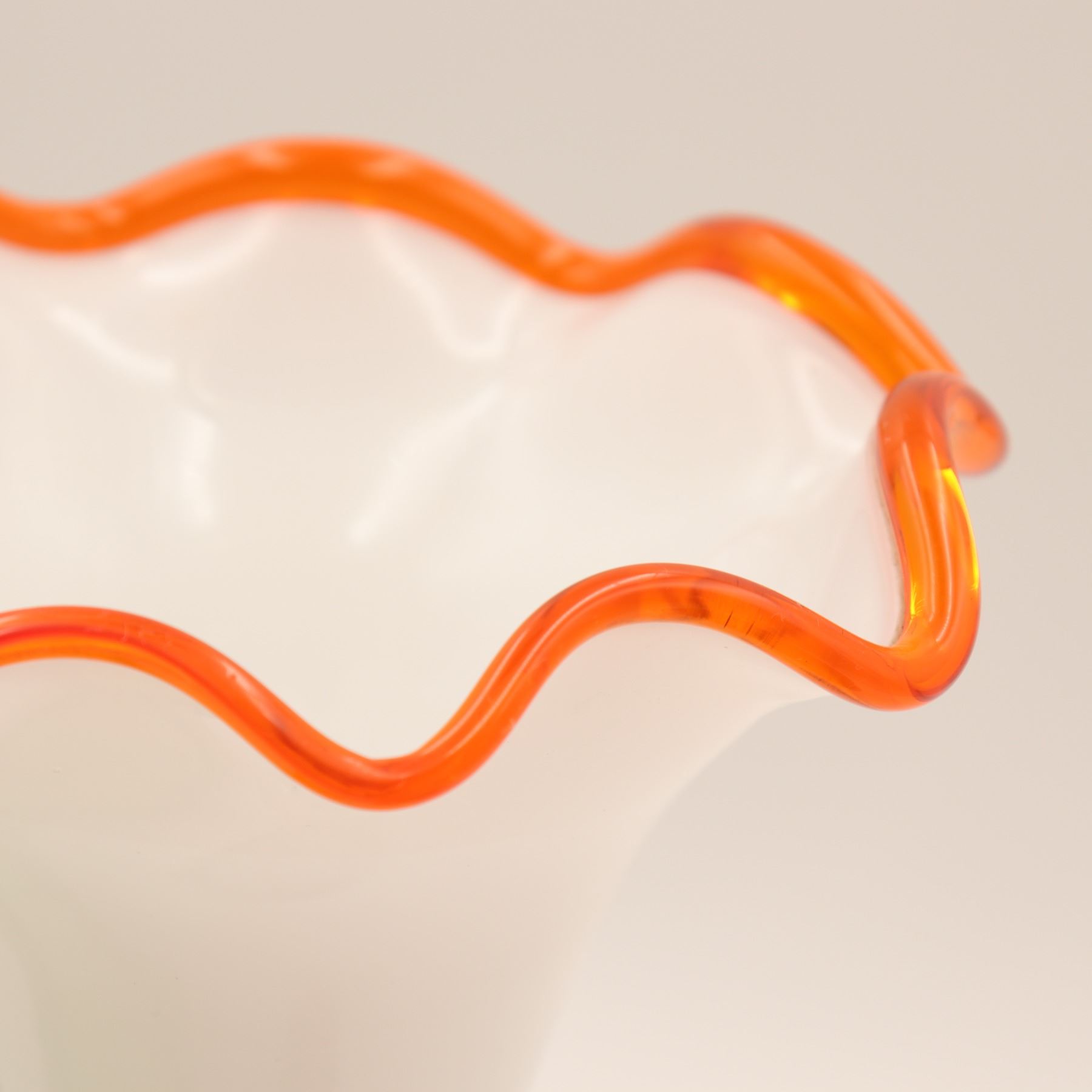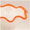 White Pedestal Vase with Orange Rim: A striking milk glass vase on clear pedestal base, the ruffled rim outlined in fiery orange, height approx. 11".