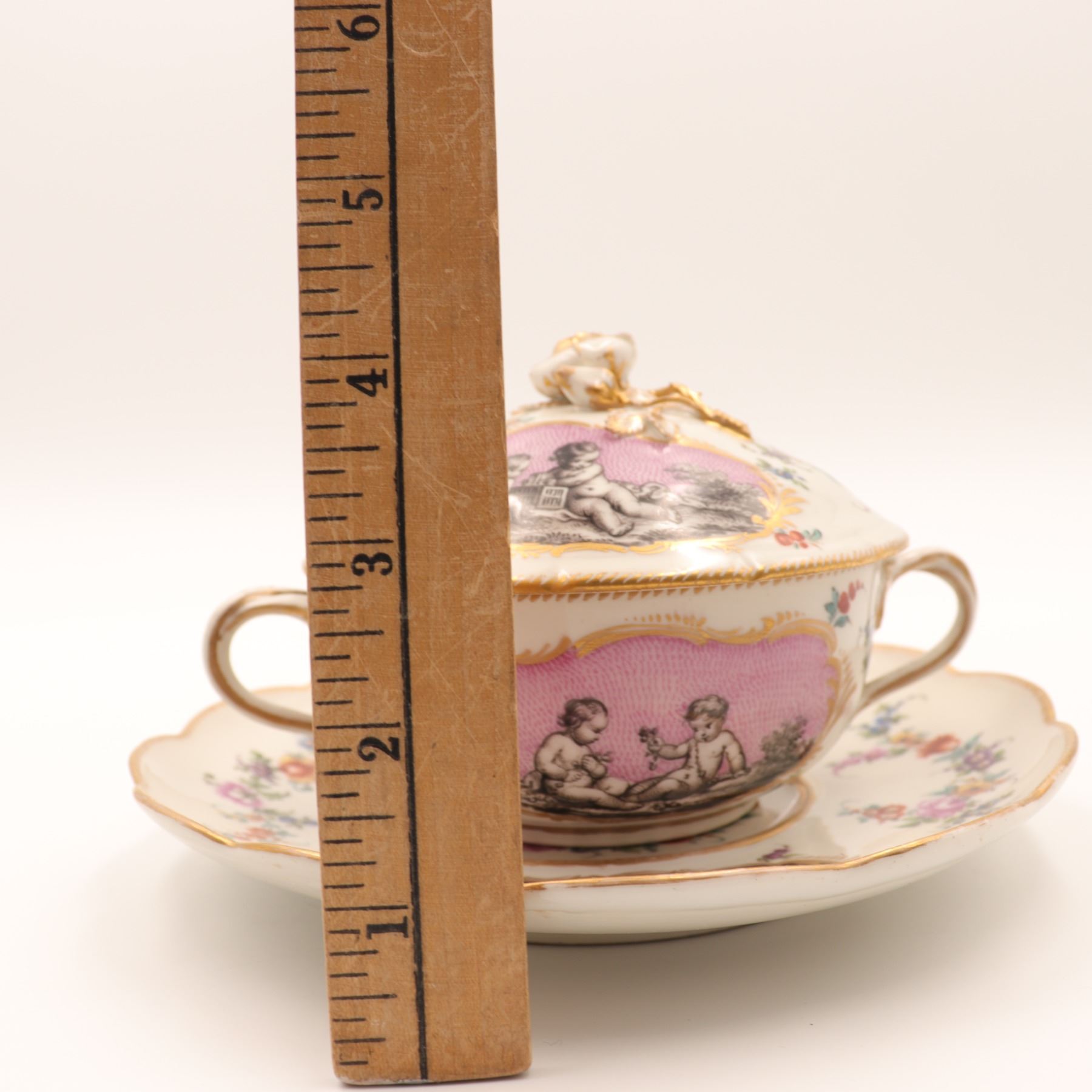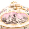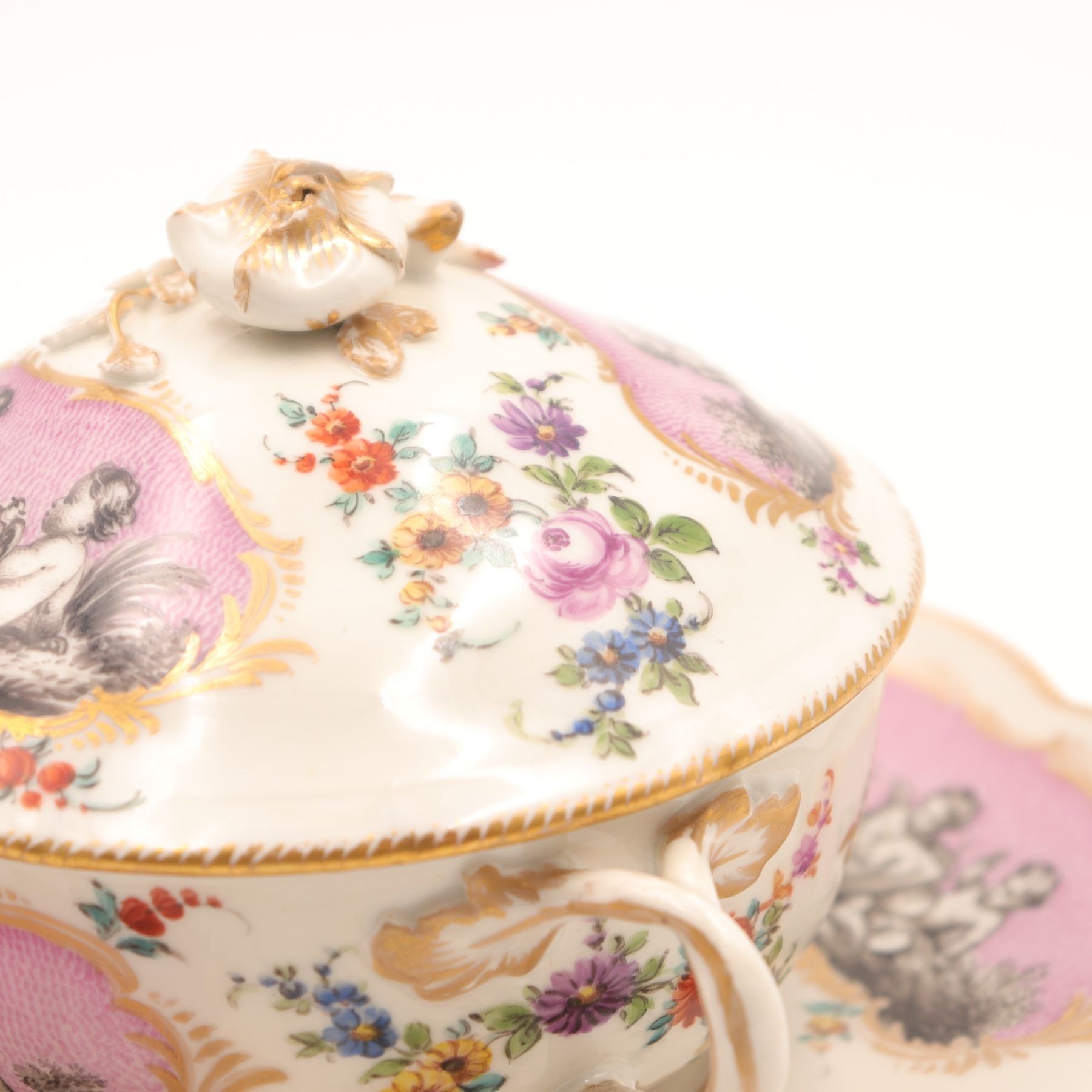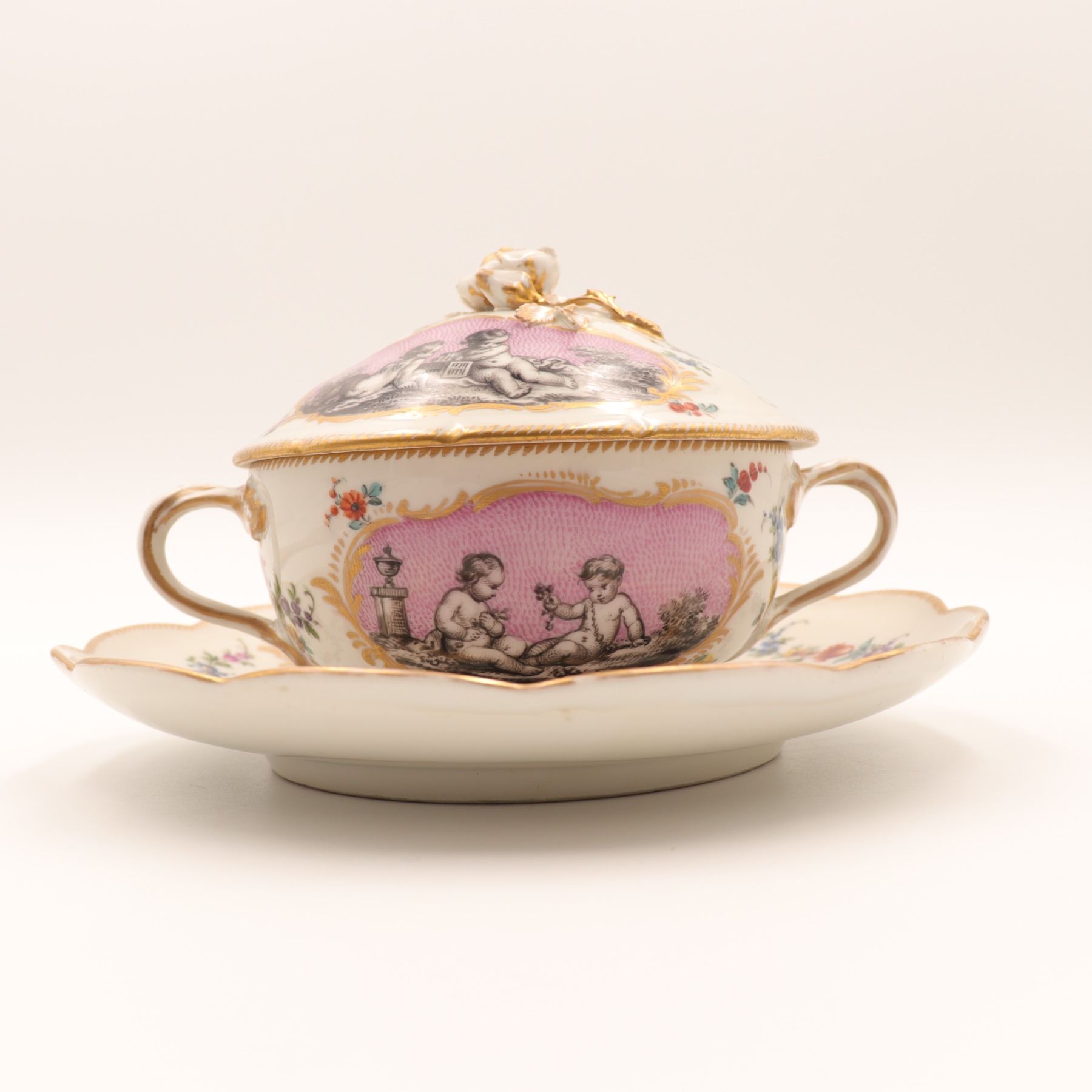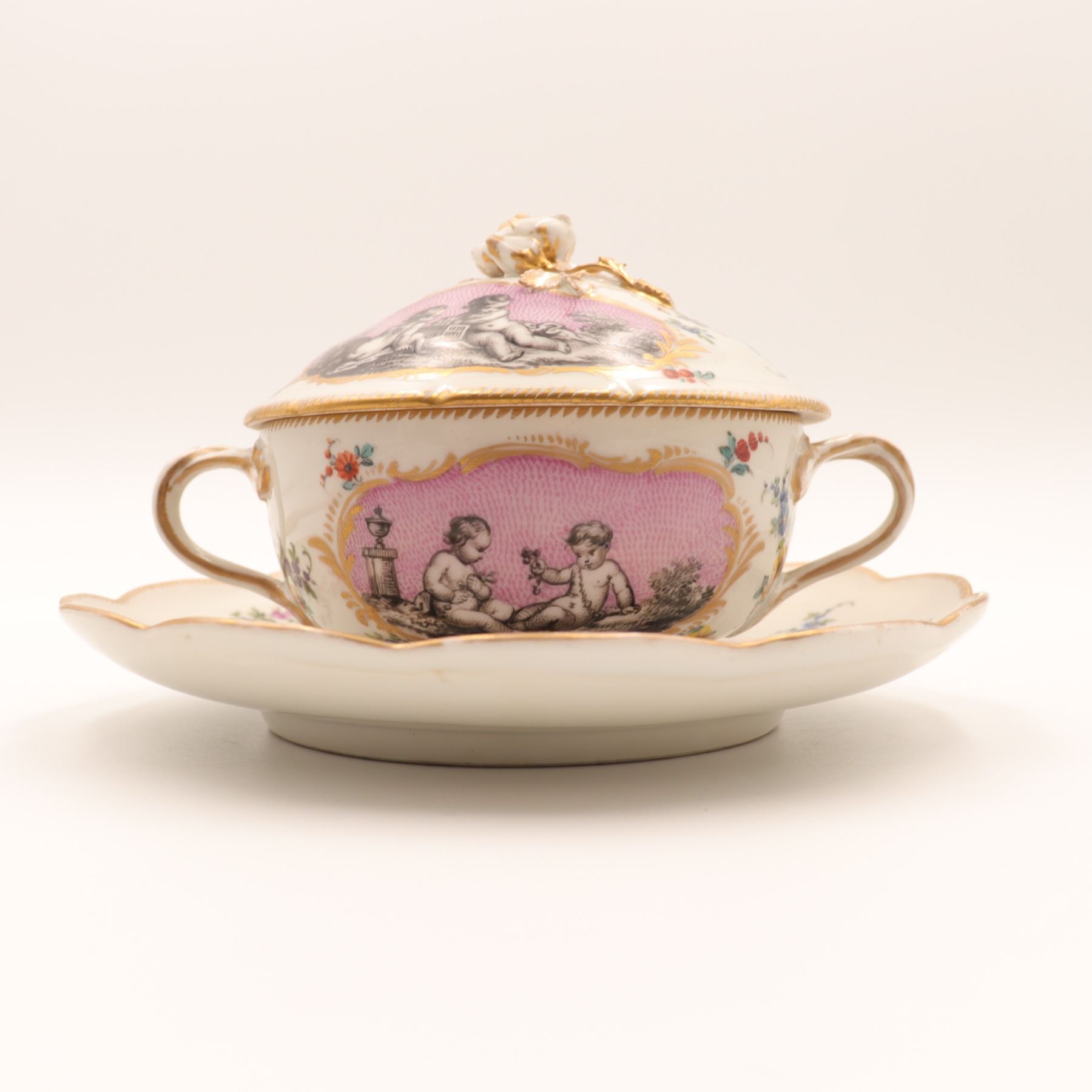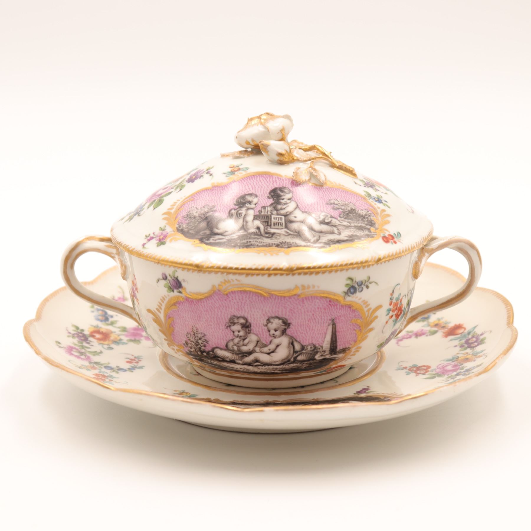 Continental porcelain two-handled covered cup and saucer, late 19th century, decorated in the manner of Sèvres with monochrome printed scenes of frolicking putti on textured pink cartouches, scattered polychrome floral sprays and gilt scroll borders, domed cover with applied rose finial, underglaze blue script mark to base. Minor chips to cover rim and flower finial, light wear to gilding and enamels, no visible cracks.
