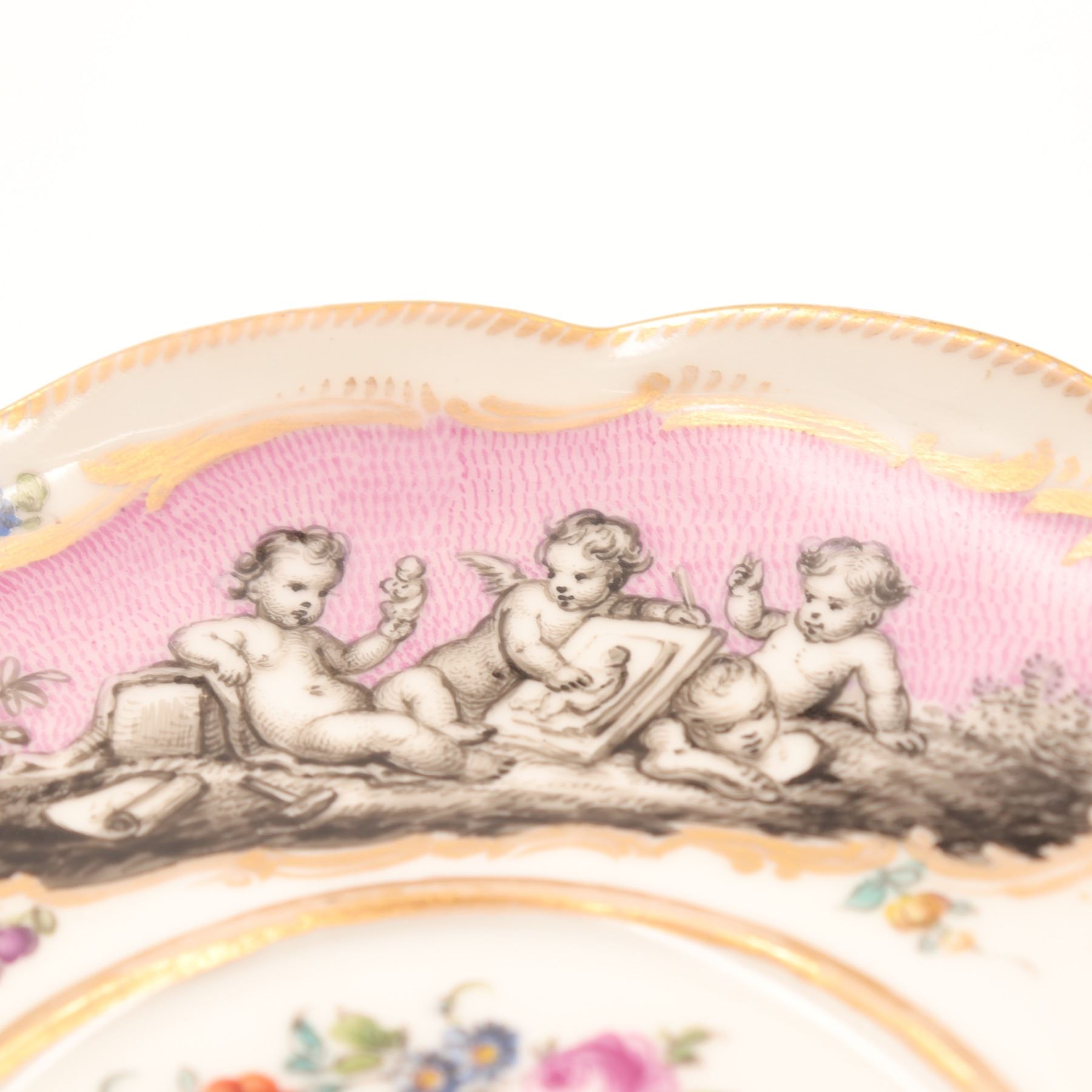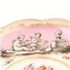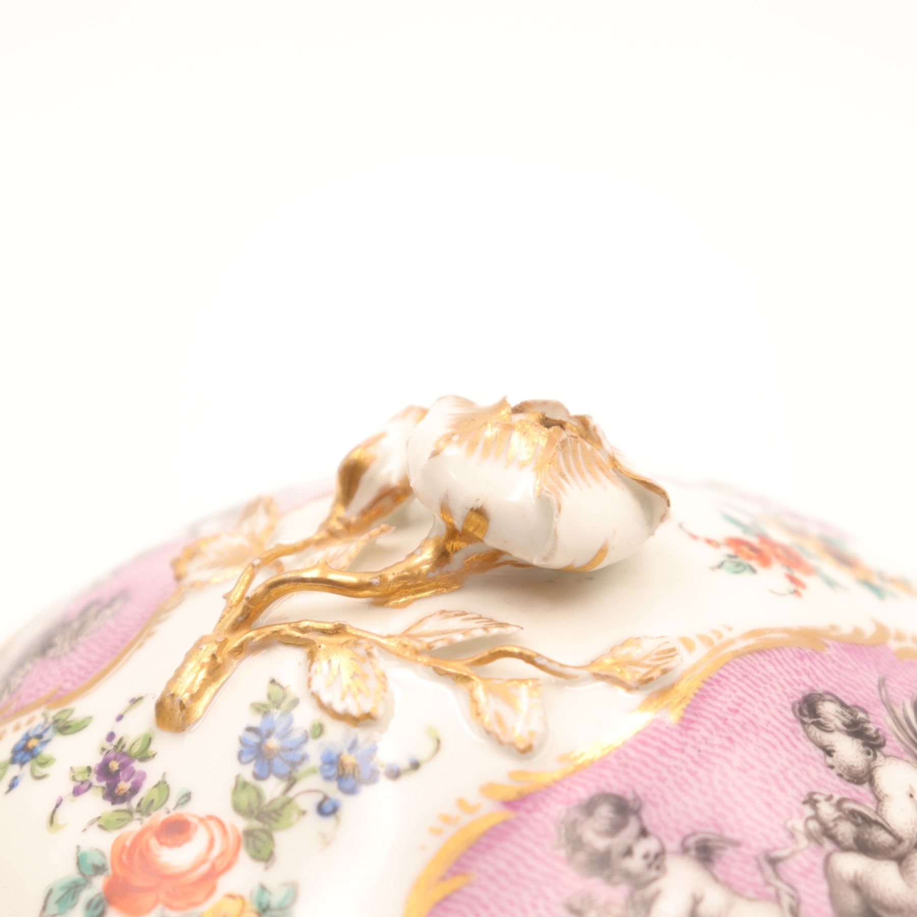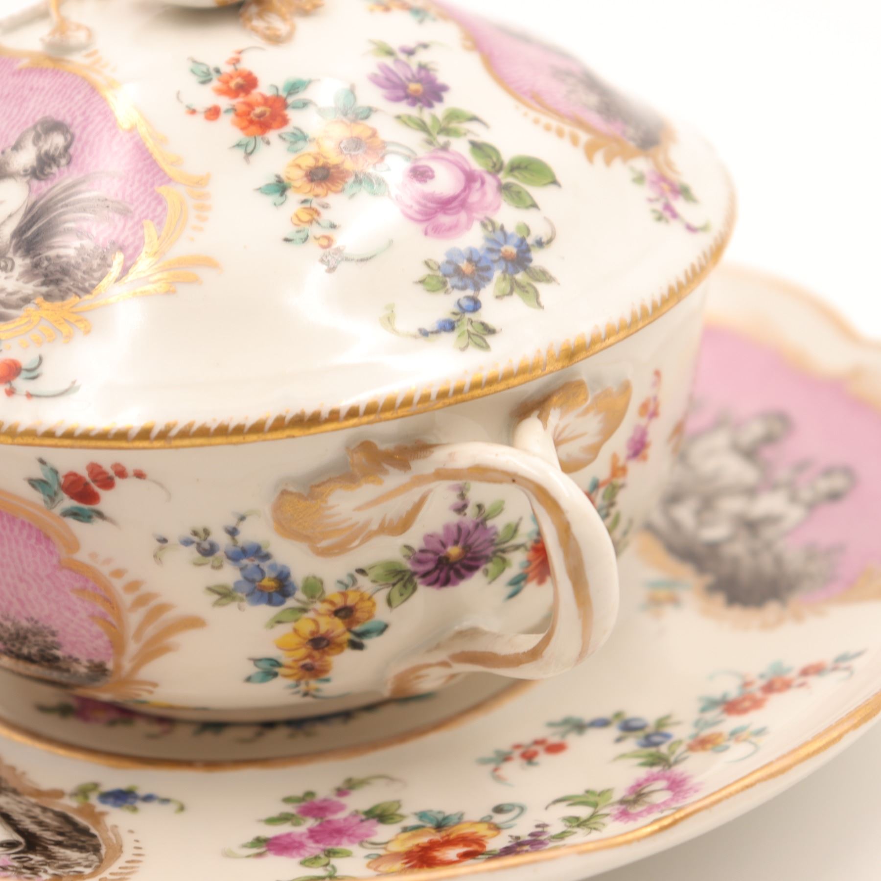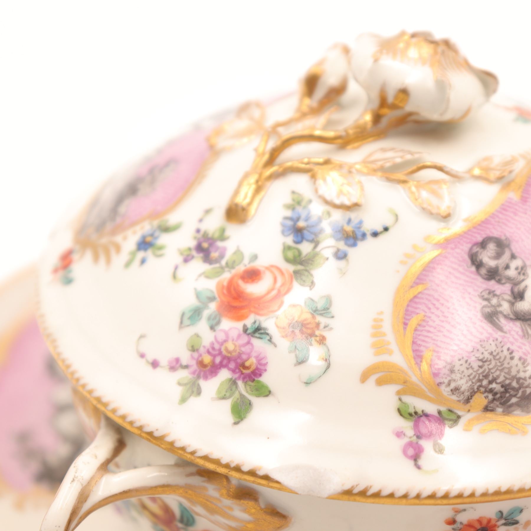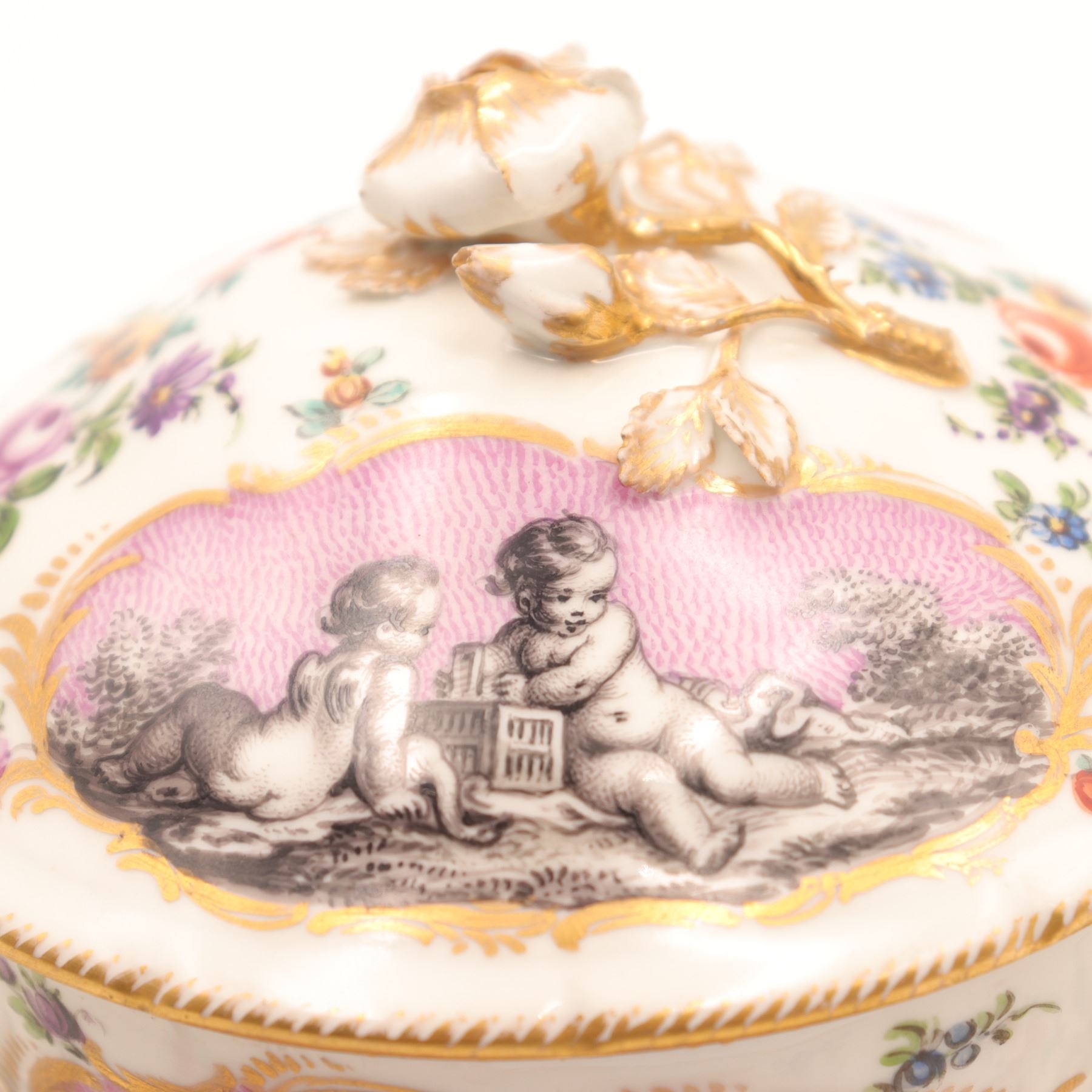 Continental porcelain two-handled covered cup and saucer, late 19th century, decorated in the manner of Sèvres with monochrome printed scenes of frolicking putti on textured pink cartouches, scattered polychrome floral sprays and gilt scroll borders, domed cover with applied rose finial, underglaze blue script mark to base. Minor chips to cover rim and flower finial, light wear to gilding and enamels, no visible cracks.