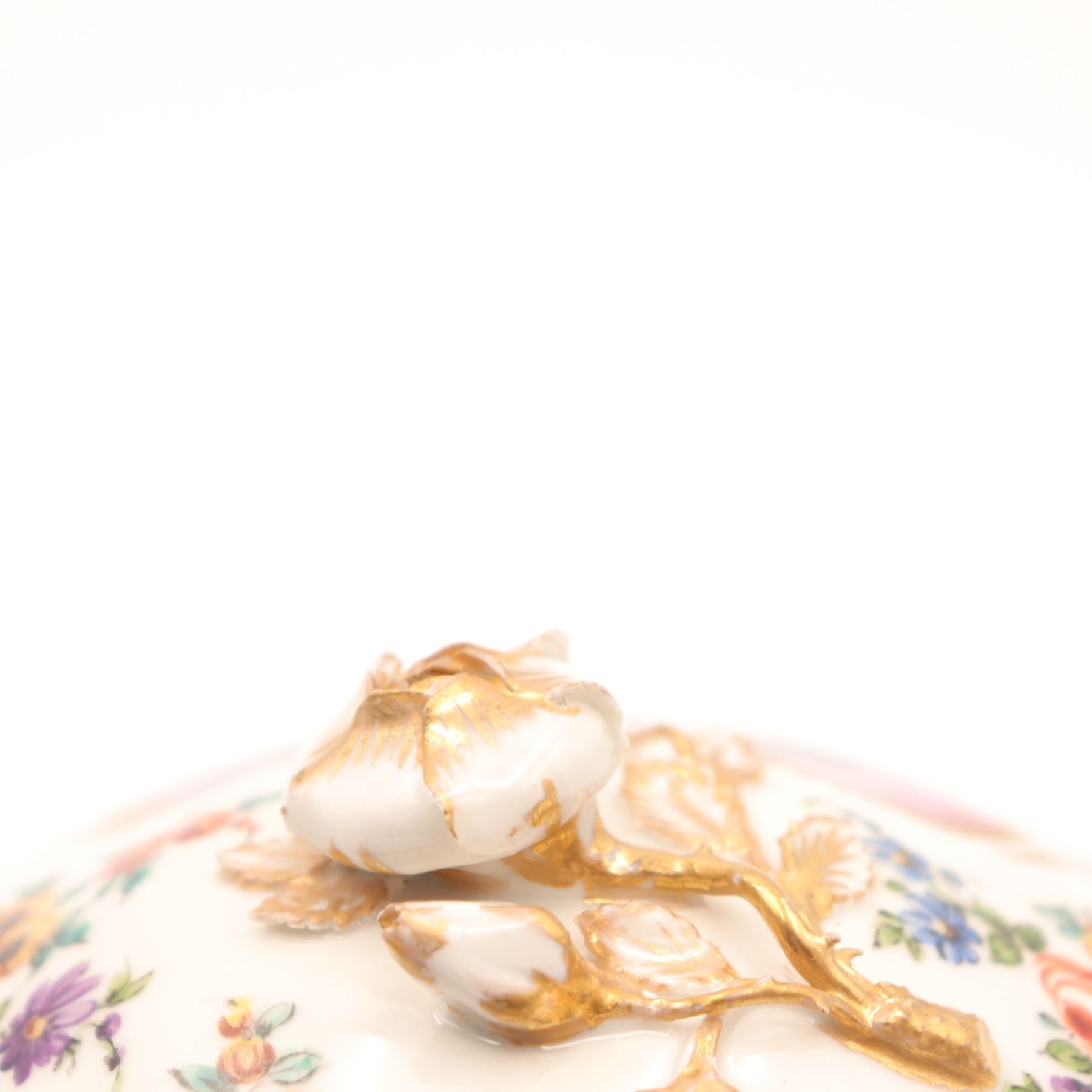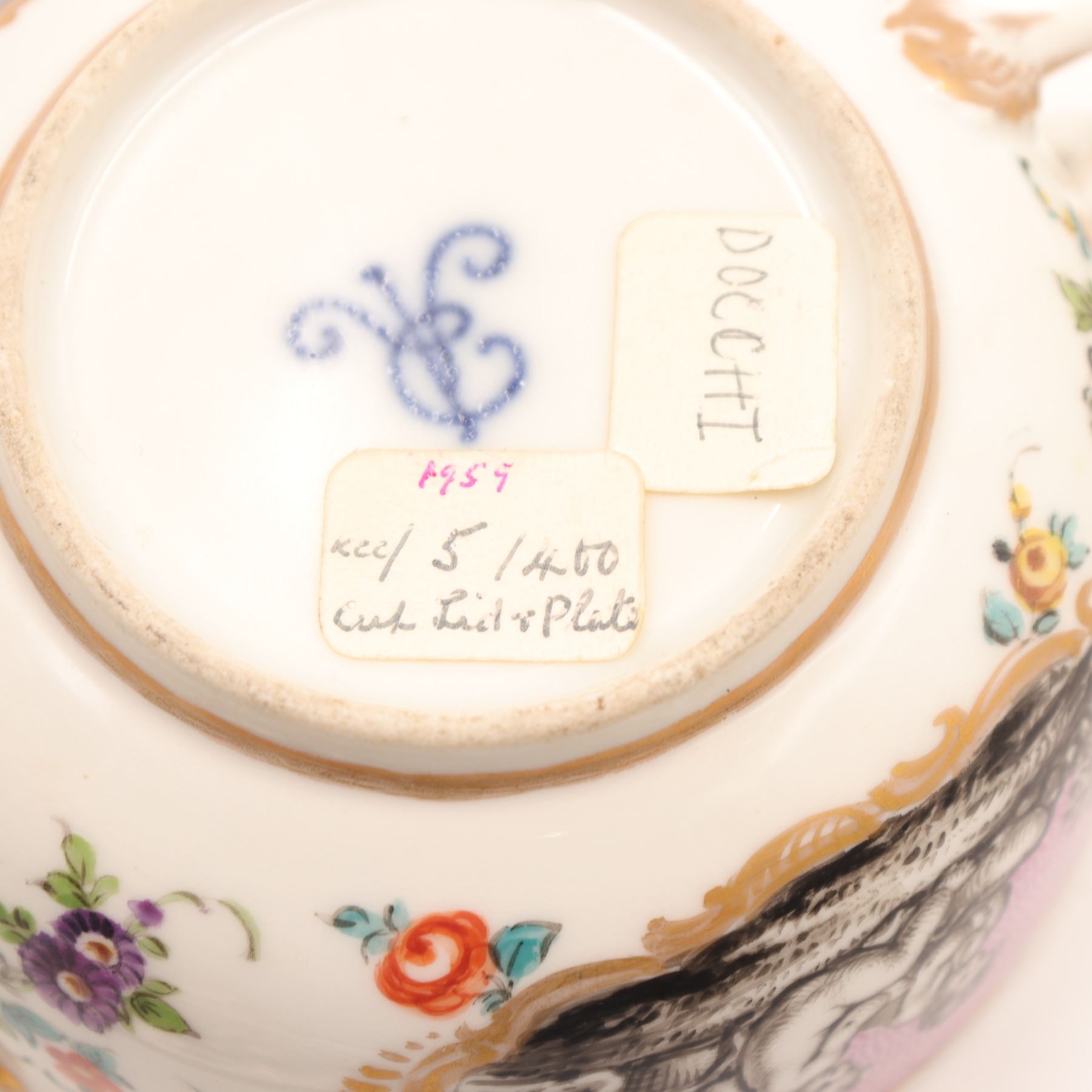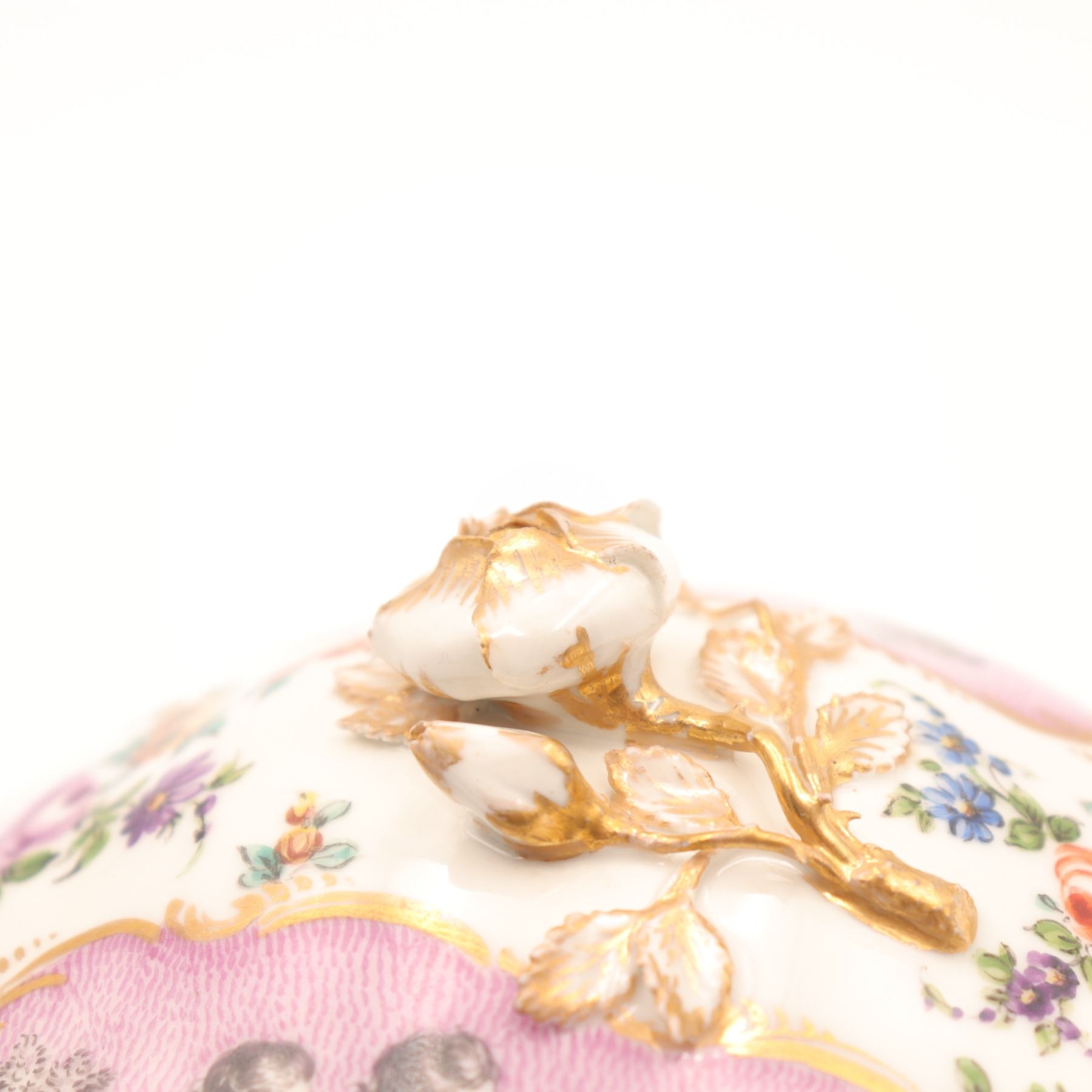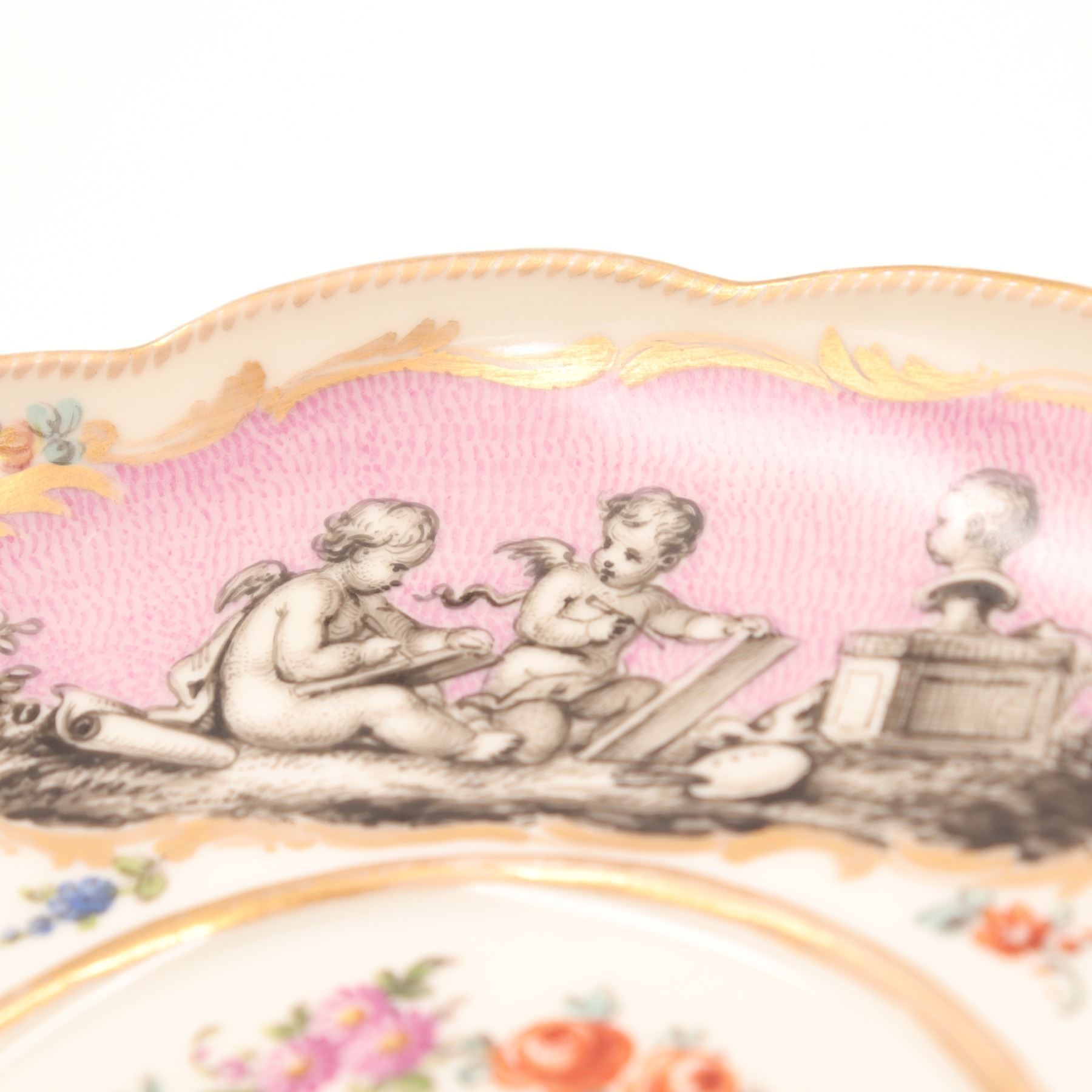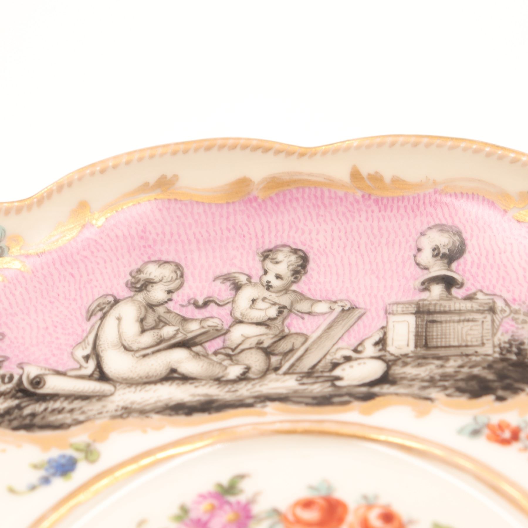 Continental porcelain two-handled covered cup and saucer, late 19th century, decorated in the manner of Sèvres with monochrome printed scenes of frolicking putti on textured pink cartouches, scattered polychrome floral sprays and gilt scroll borders, domed cover with applied rose finial, underglaze blue script mark to base. Minor chips to cover rim and flower finial, light wear to gilding and enamels, no visible cracks.