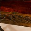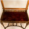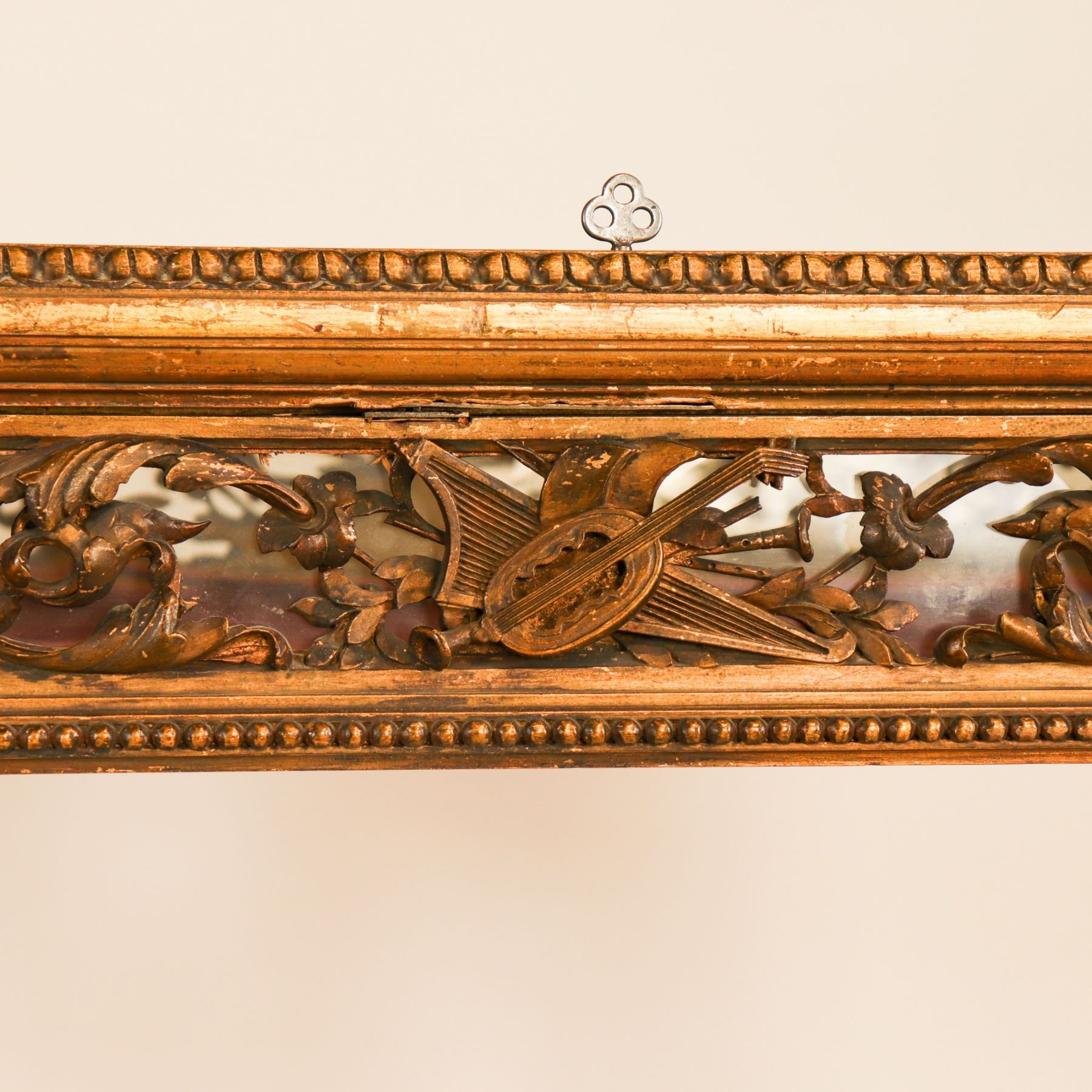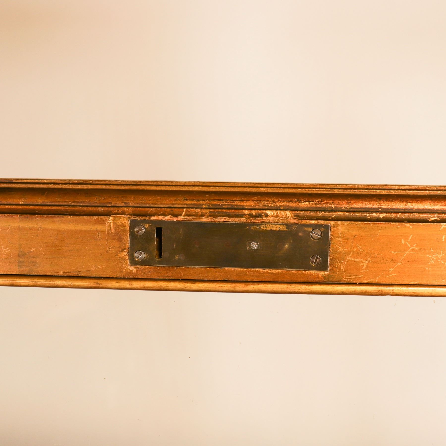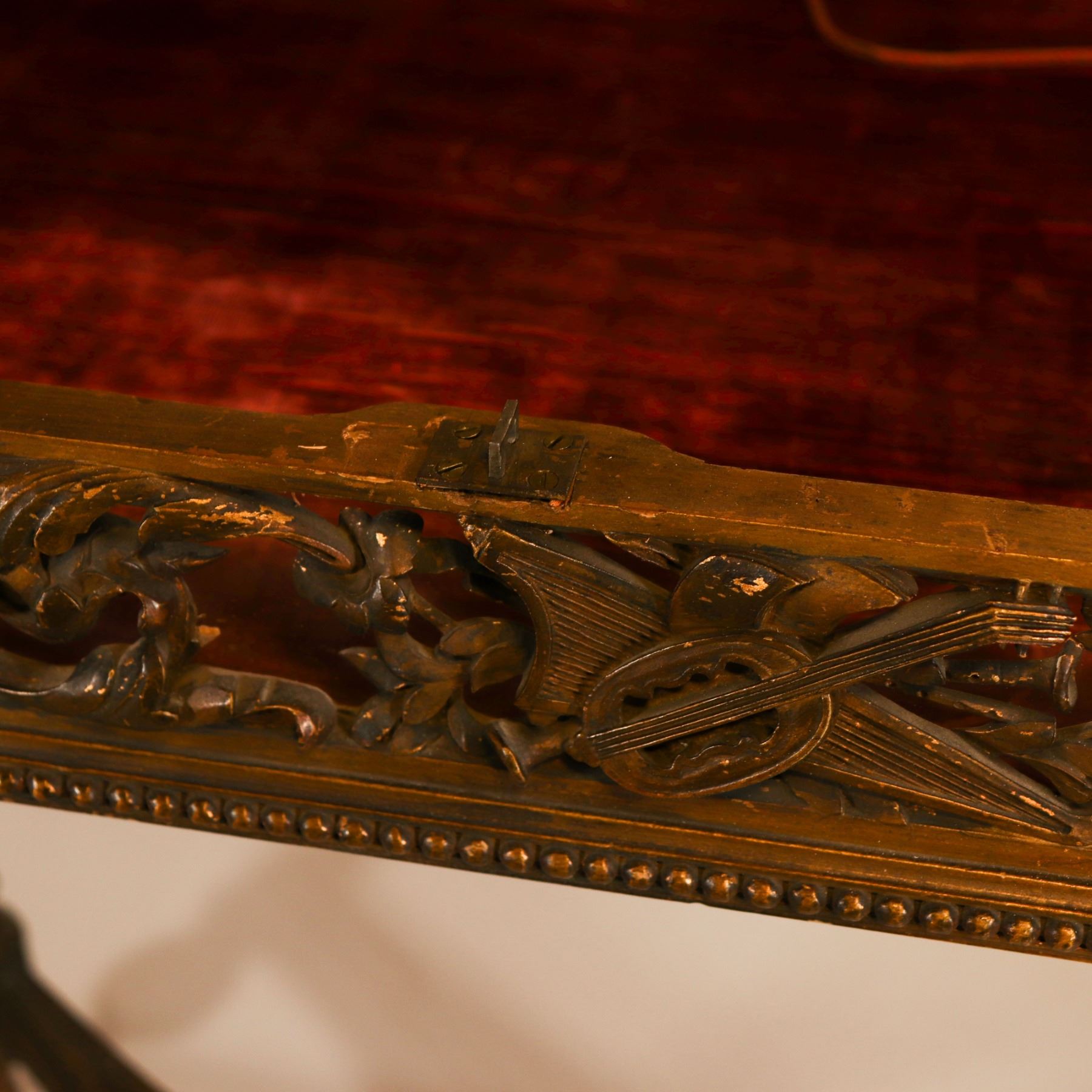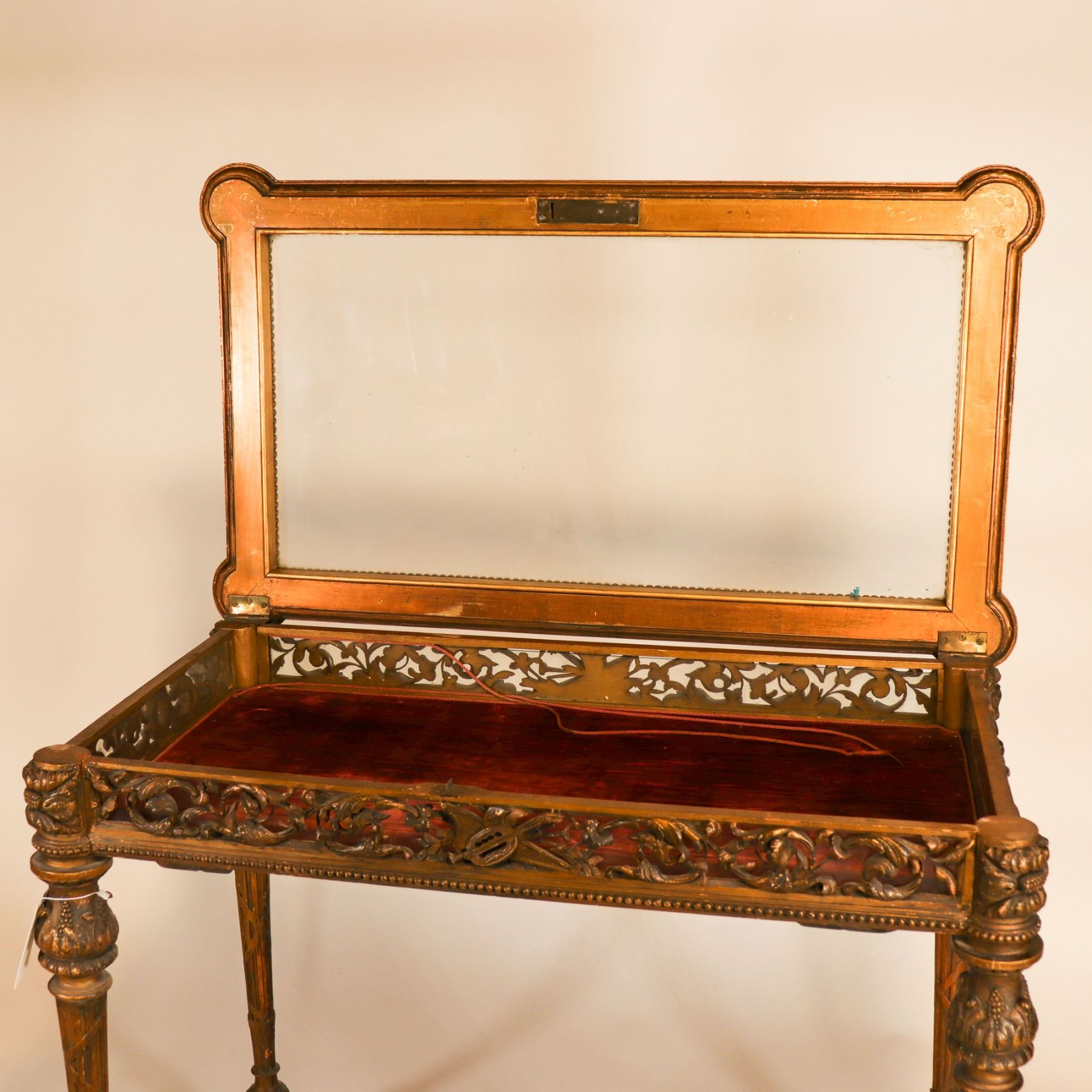 Rectangular giltwood vitrine table with hinged glass-top display compartment, the upper edge framed by continuous beaded and guilloche moldings above a pierced foliate and scroll-carved frieze backed with red fabric and enclosing a velvet-lined interior. Each corner with boldly modeled clustered leaf embellishments over turned and stop-fluted tapering legs carved with acanthus and berry motifs, joined by a shaped X-form stretcher with central roundel and beaded molding, terminating in small toupie feet. Retains an attractive, warm, time-softened gilded surface and red interior, designed for the presentation of jewelry or small objets d’art. Continental, in the Louis XVI Revival taste, late 19th century. 36x21x30H