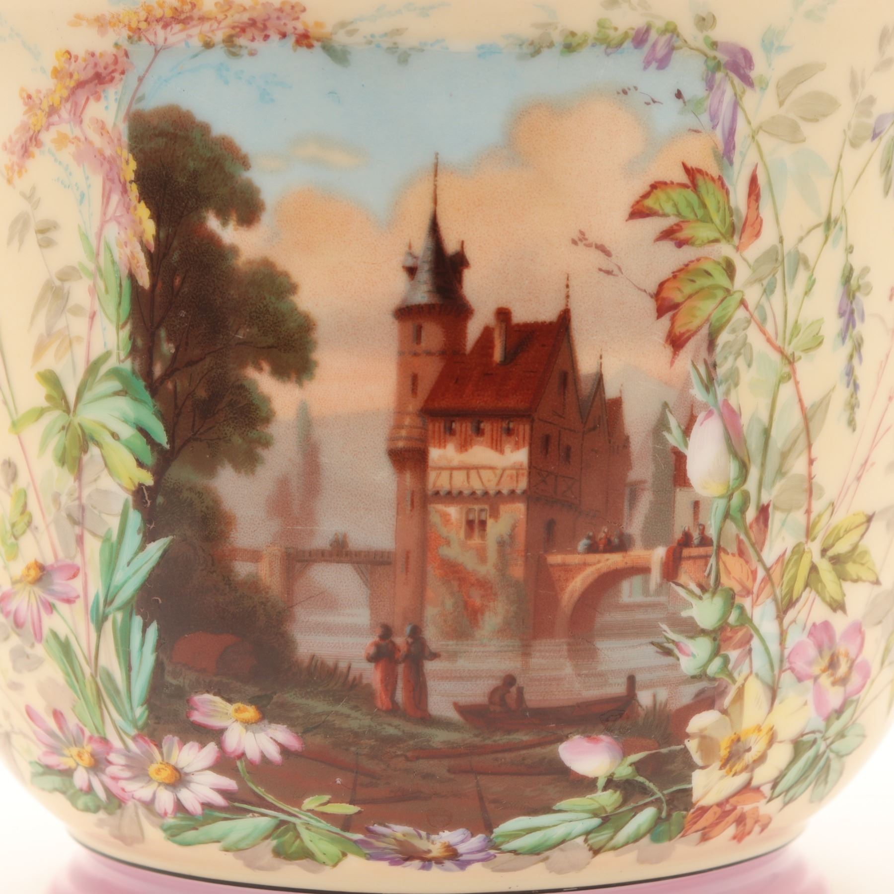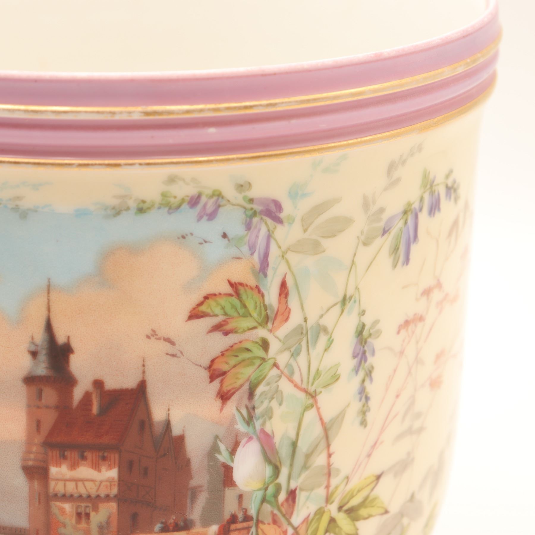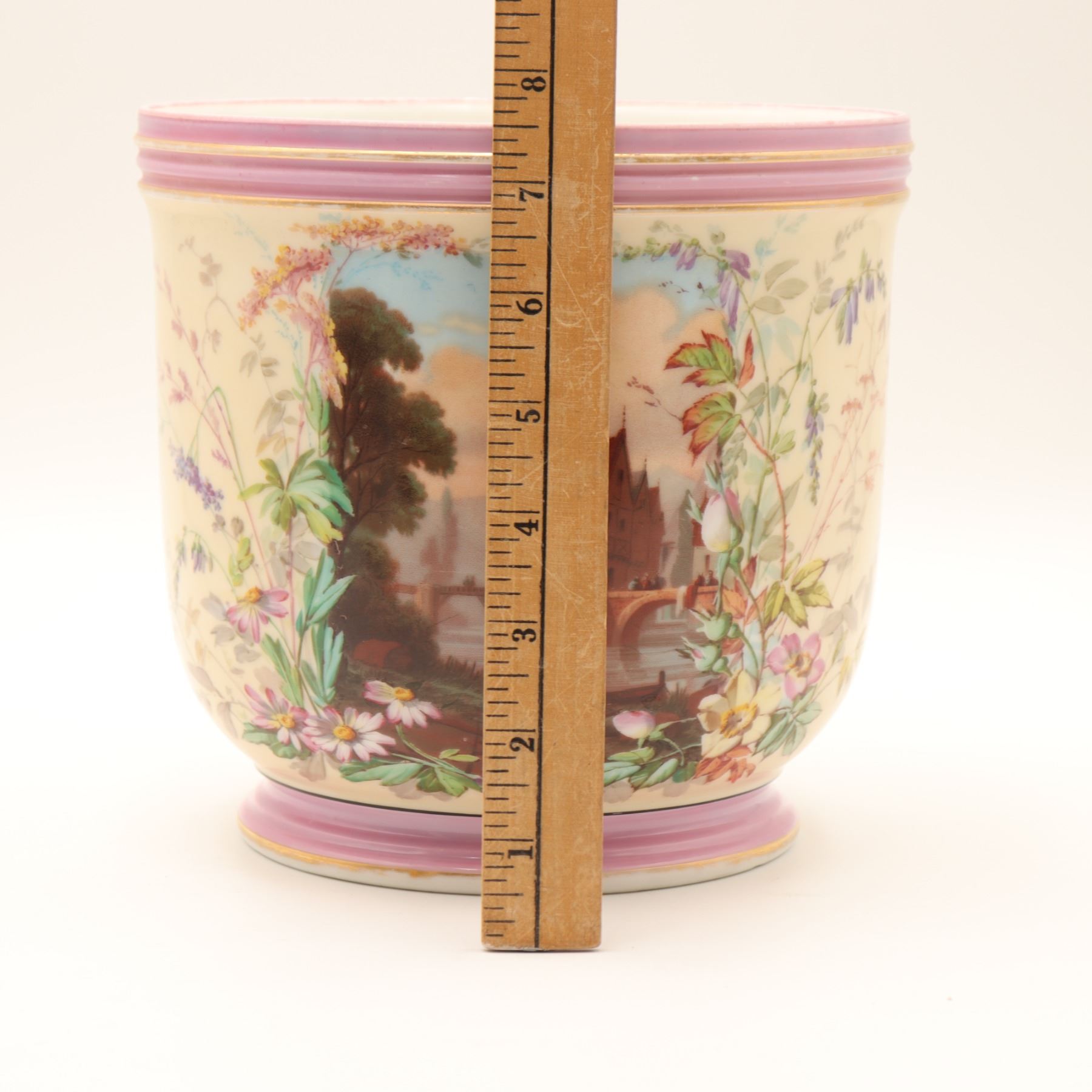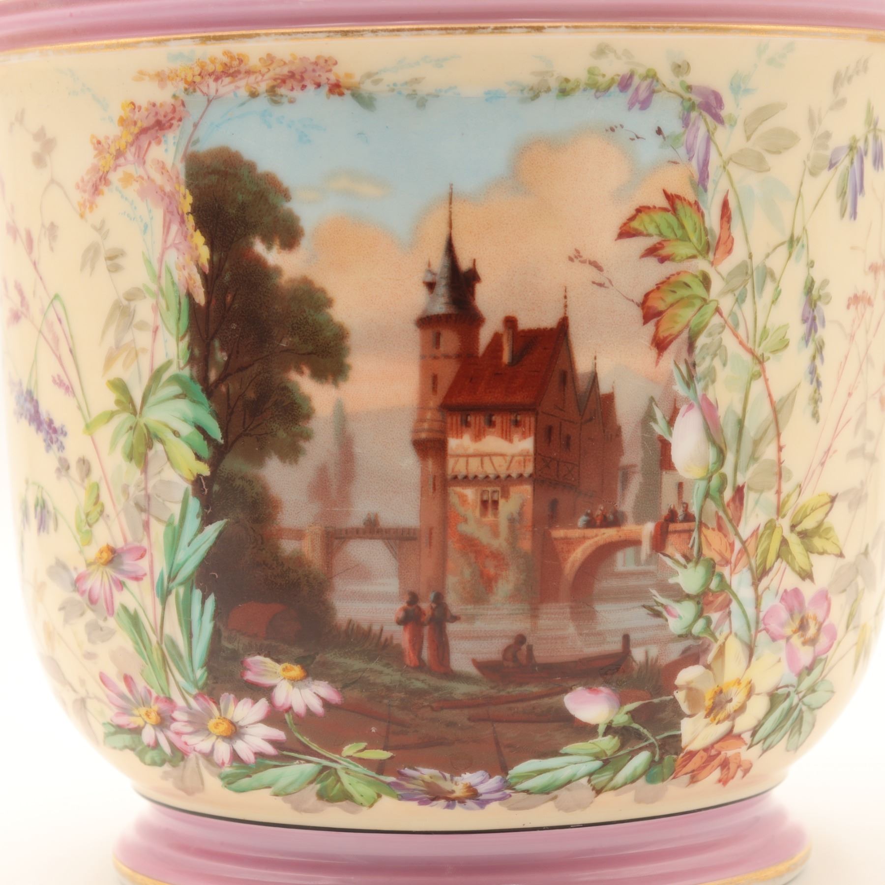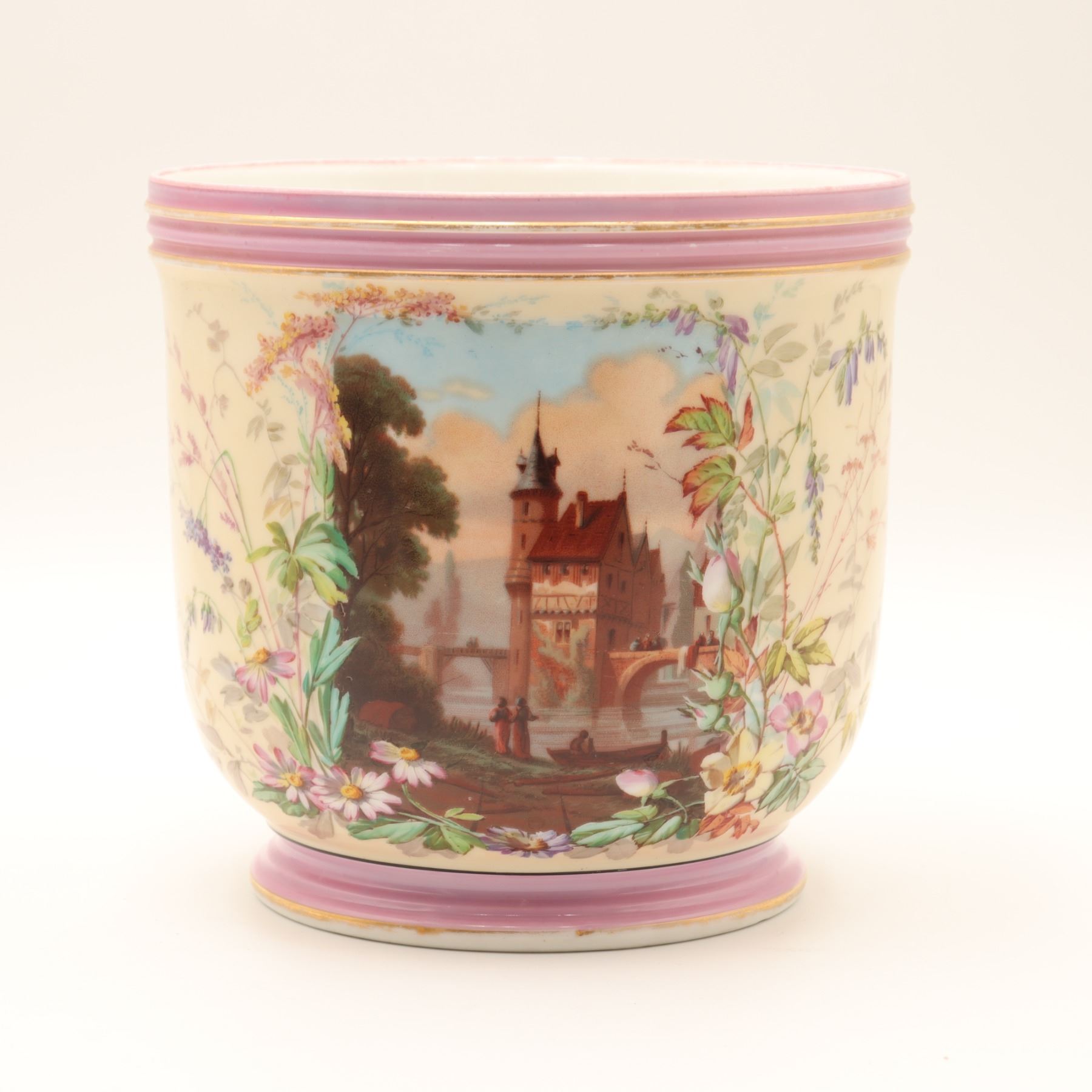 Continental porcelain cachepot or flower pot, probably French or German, late 19th century, of cylindrical form with cream ground and pink and gilt banding, finely enamelled with a romantic riverside castle scene framed by profuse painted flowers, reverse with loose botanical sprays. Interior and base with light wear to gilding and surface rubbing, no major chips or cracks noted.