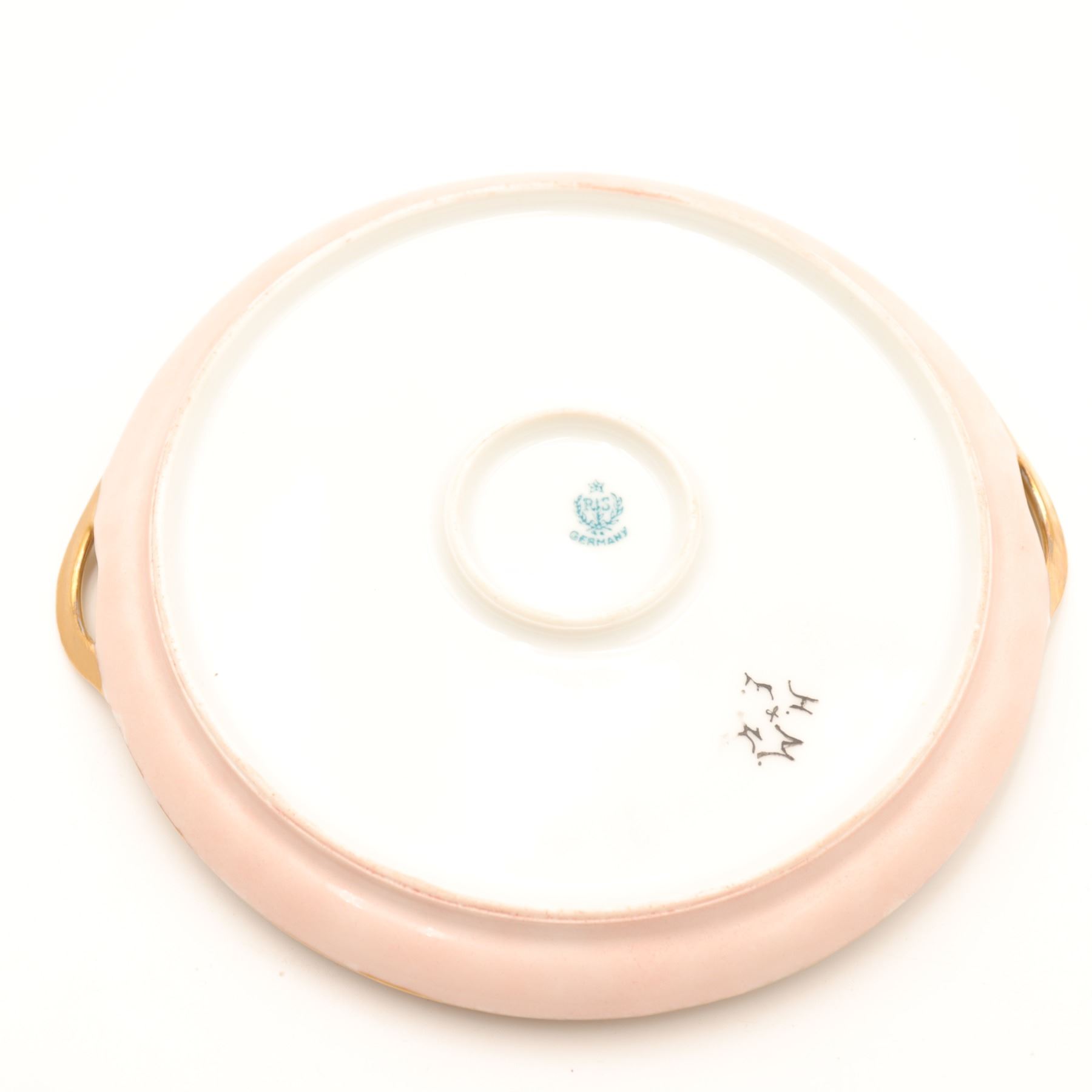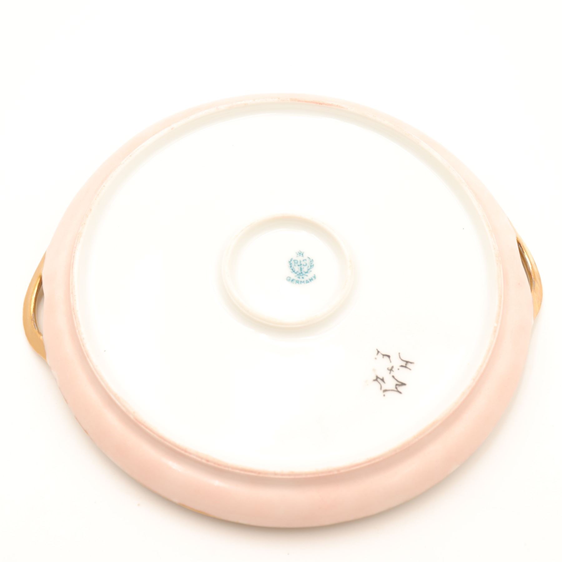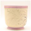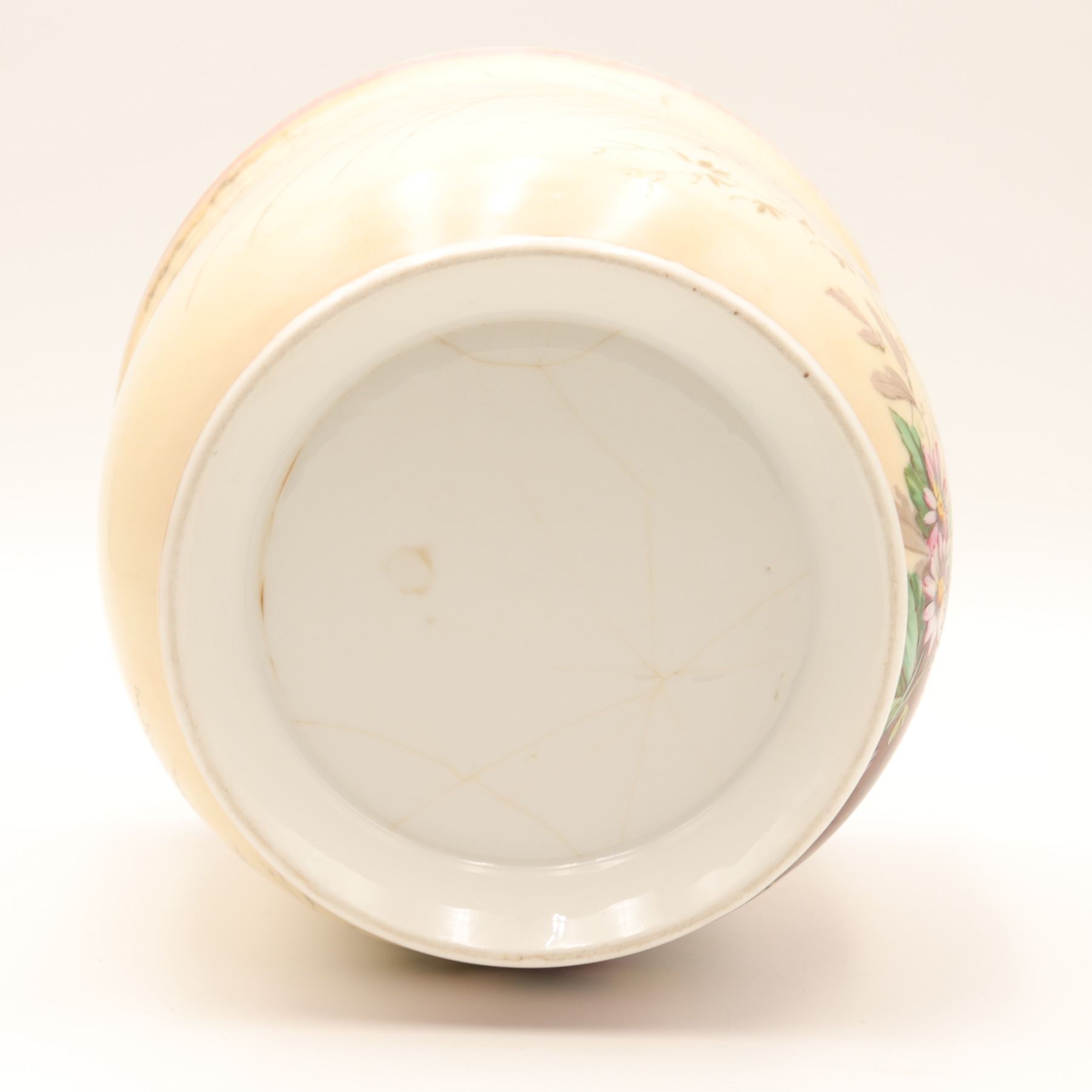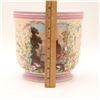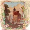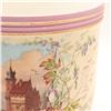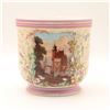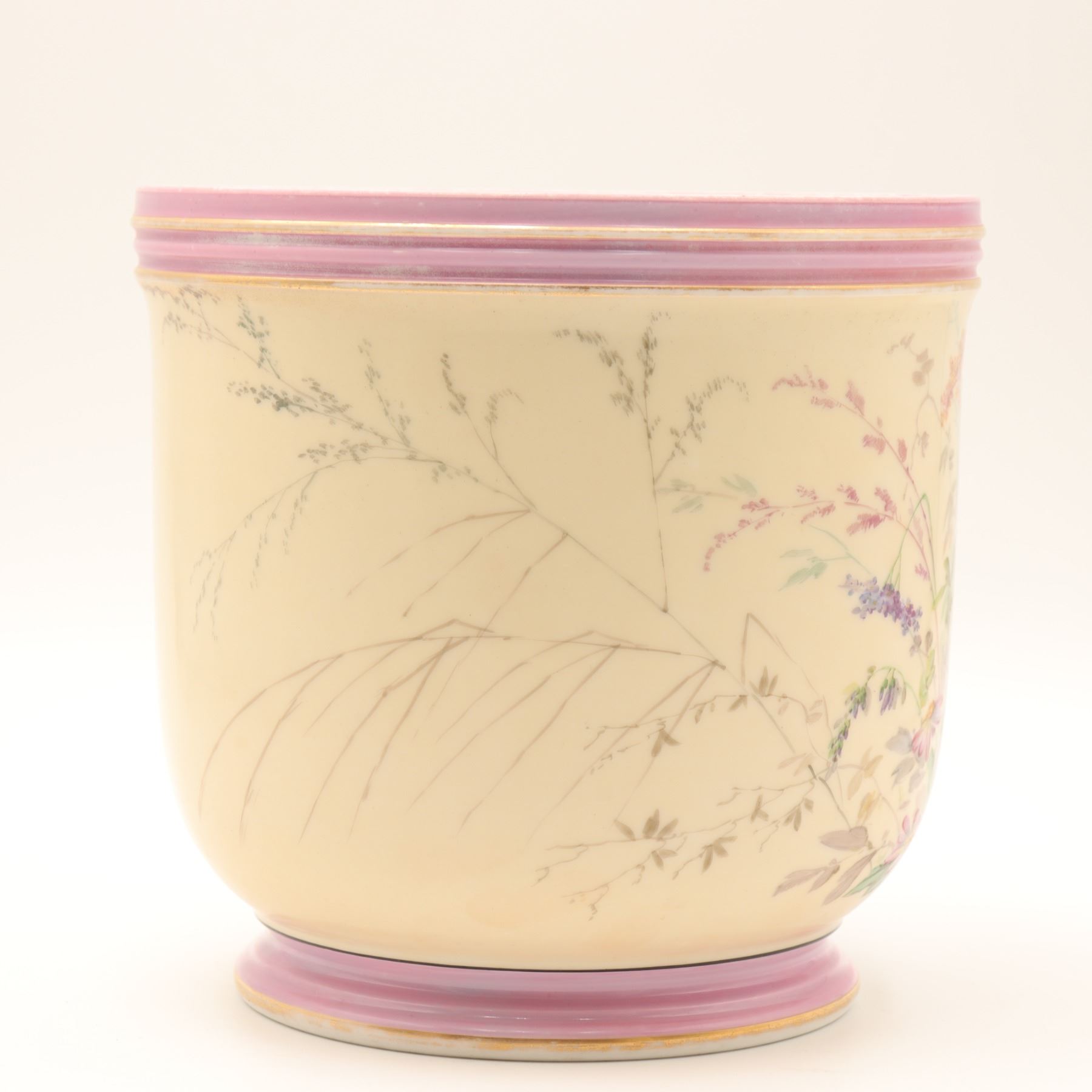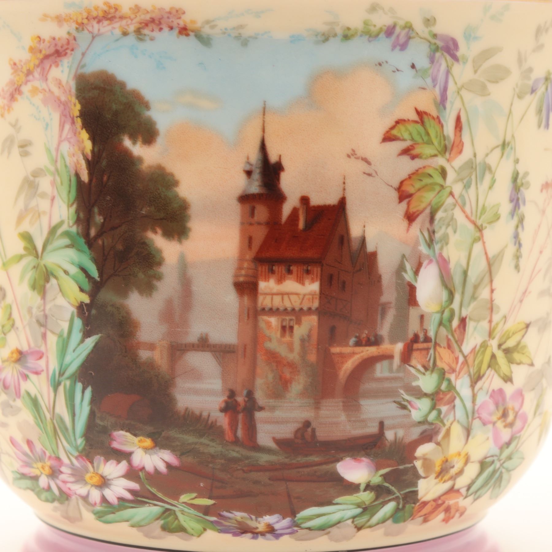 Continental porcelain cachepot or flower pot, probably French or German, late 19th century, of cylindrical form with cream ground and pink and gilt banding, finely enamelled with a romantic riverside castle scene framed by profuse painted flowers, reverse with loose botanical sprays. Interior and base with light wear to gilding and surface rubbing, no major chips or cracks noted.