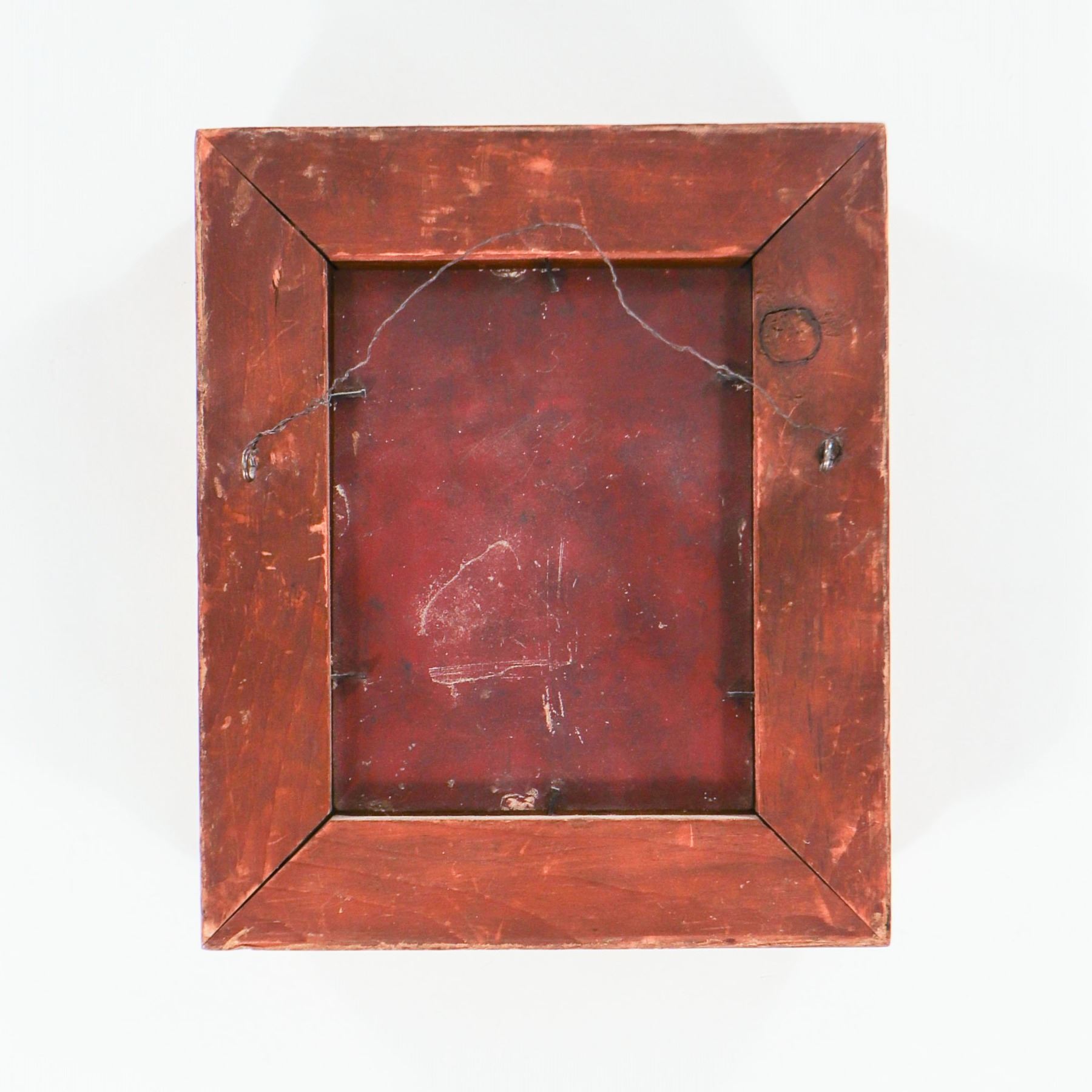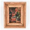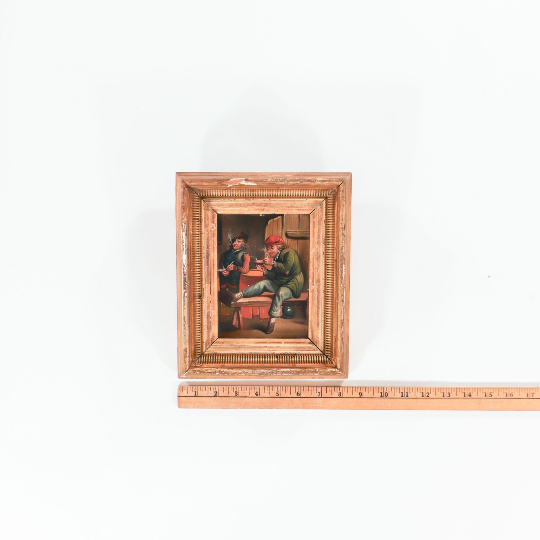 Continental School, late 19th–early 20th century, oil on steel plate tavern interior, showing two rustic figures seated at a table smoking pipes, one in a red cap leaning back on a bench with his feet up, the other turned toward him in conversation. Warmly lit interior with cupboard and hanging utensils beyond, painted with rich colour and smooth enamel-like finish typical of oils on metal support. Set in a period carved and gilt-composition frame with reeded inner moulding. Unsigned.