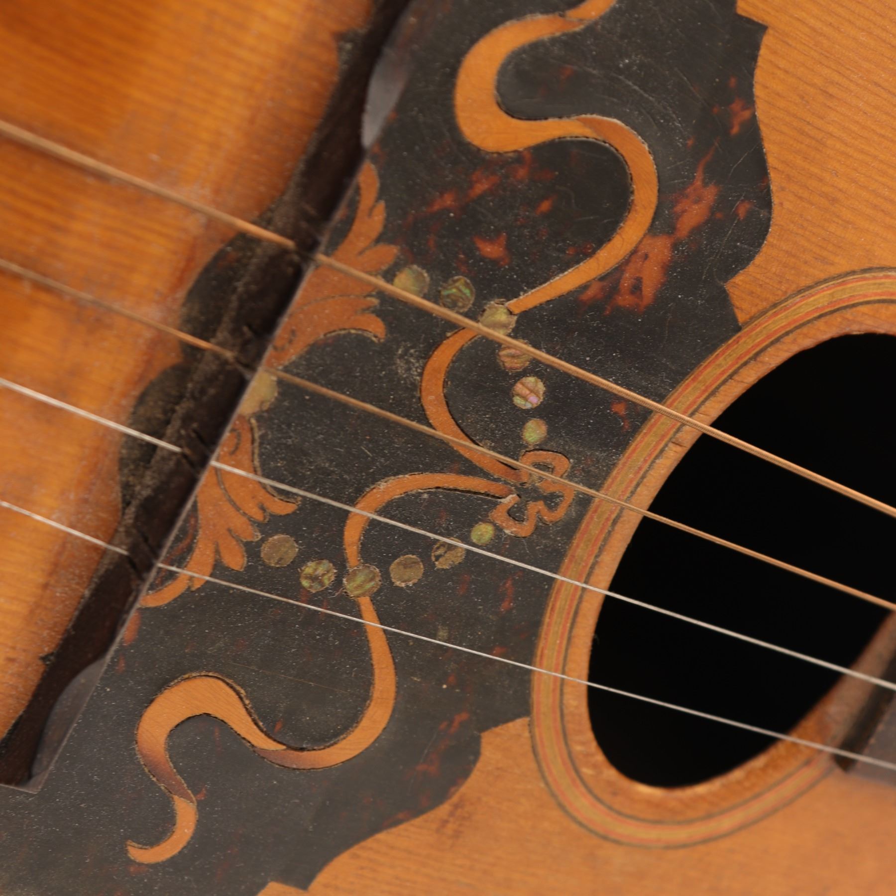 Unmarked bowl-back teardrop mandolin, probably European factory production, circa 1920–1940, with ribbed bowl back, spruce top and oval soundhole, fitted with a floating bridge above a painted tortoiseshell-effect pickguard decorated with scrollwork and small dot inlays, plain headstock with eight tuners for four string courses. Approx. 24 in. overall length. In fair, decorative condition with heavy surface wear, scratches and dirt to top and pickguard, wear and possible repair at the tailpiece area, oxidized hardware and worn fingerboard; strings old and instrument not guaranteed playable, sold as found for restoration or display.