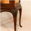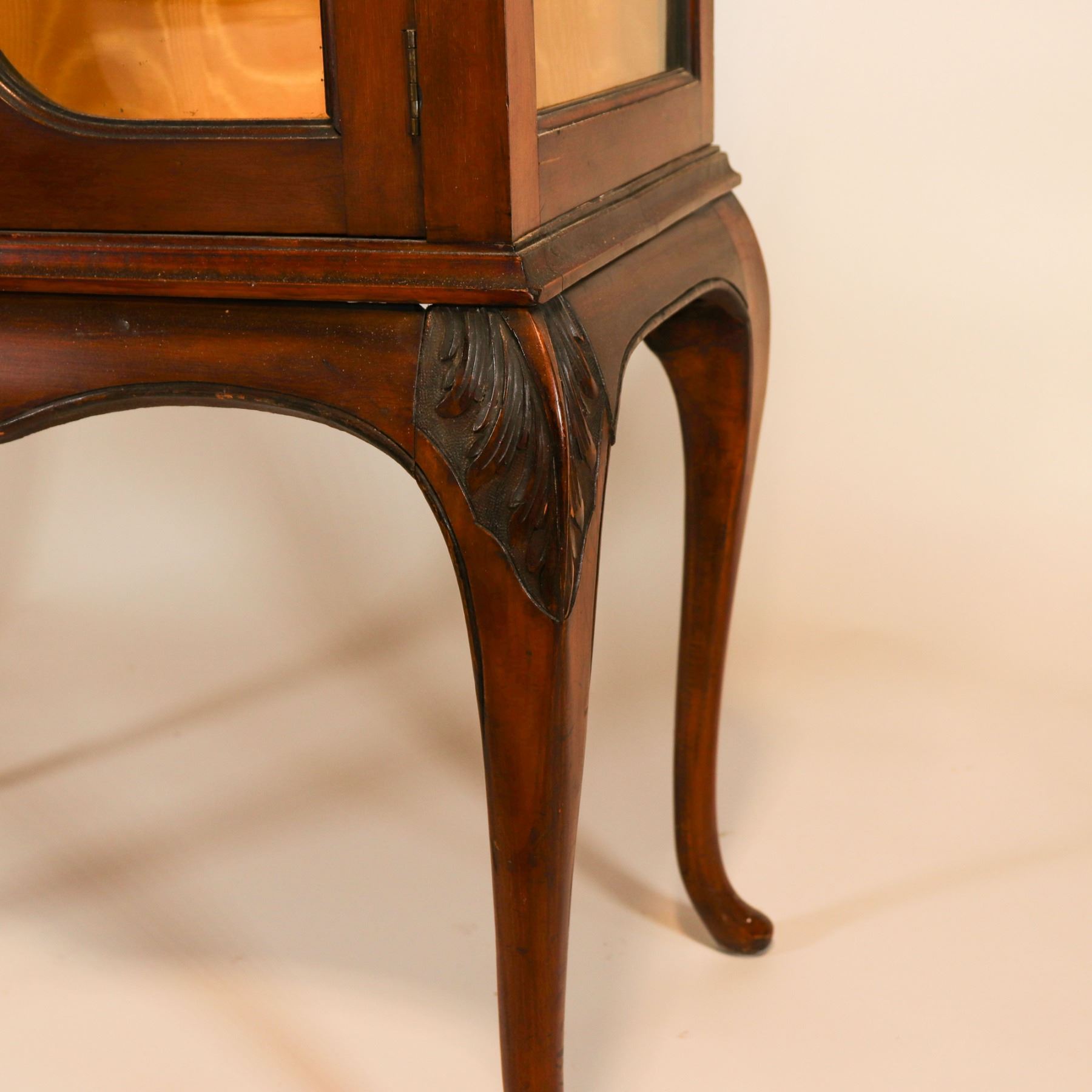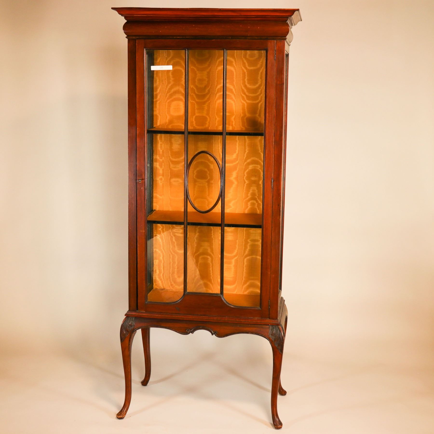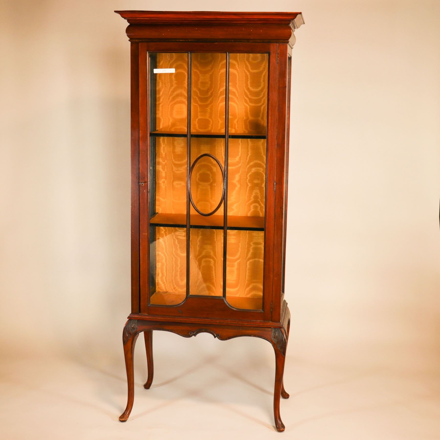 Early 20th century mahogany vitrine display cabinet, the tall rectangular case surmounted by a molded cornice above a single glazed door with vertical astragal bars centering an oval panel, the sides also glazed, opening to three display shelves over a shaped apron and raised on slender cabriole legs with carved foliate knees. Interior lined in figured gold moiré fabric, probably silk or silk-blend, providing a rich backdrop for display. Warm medium-brown finish overall. Approx. 29 in. wide, 16 in. deep, 68 in. high.