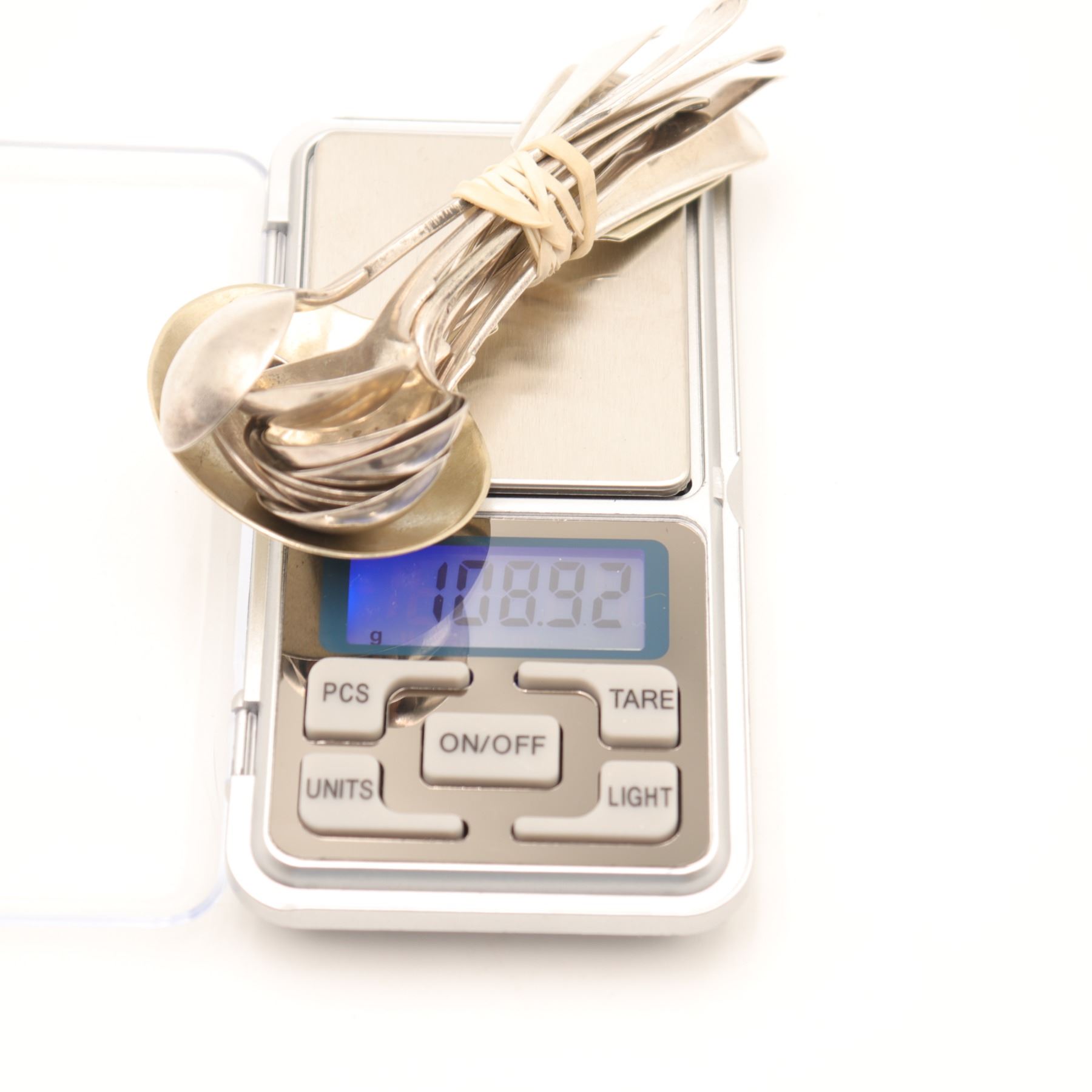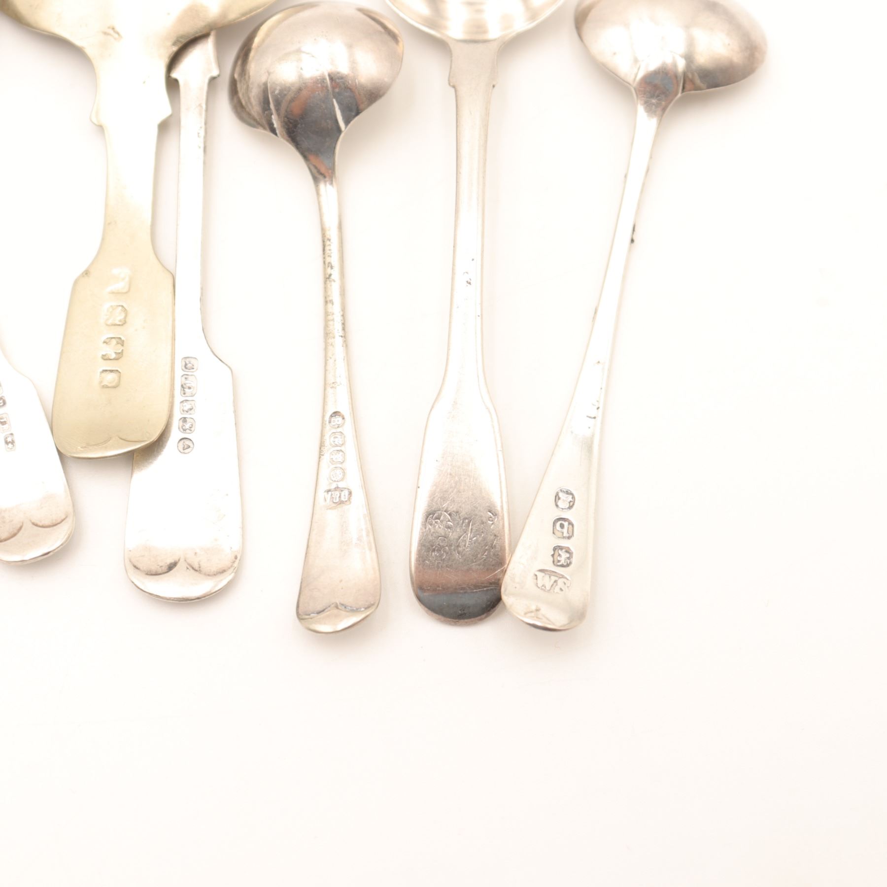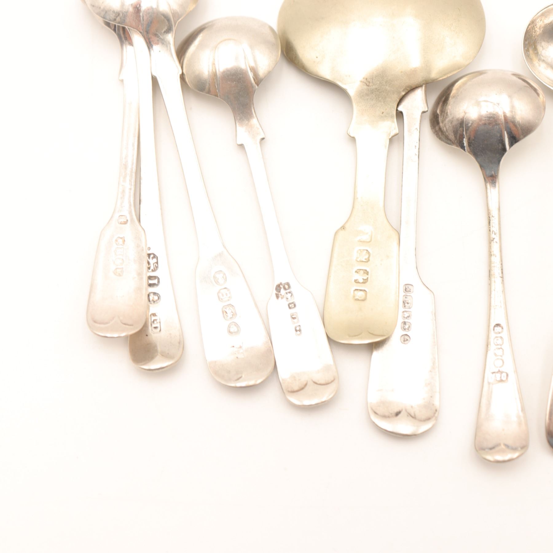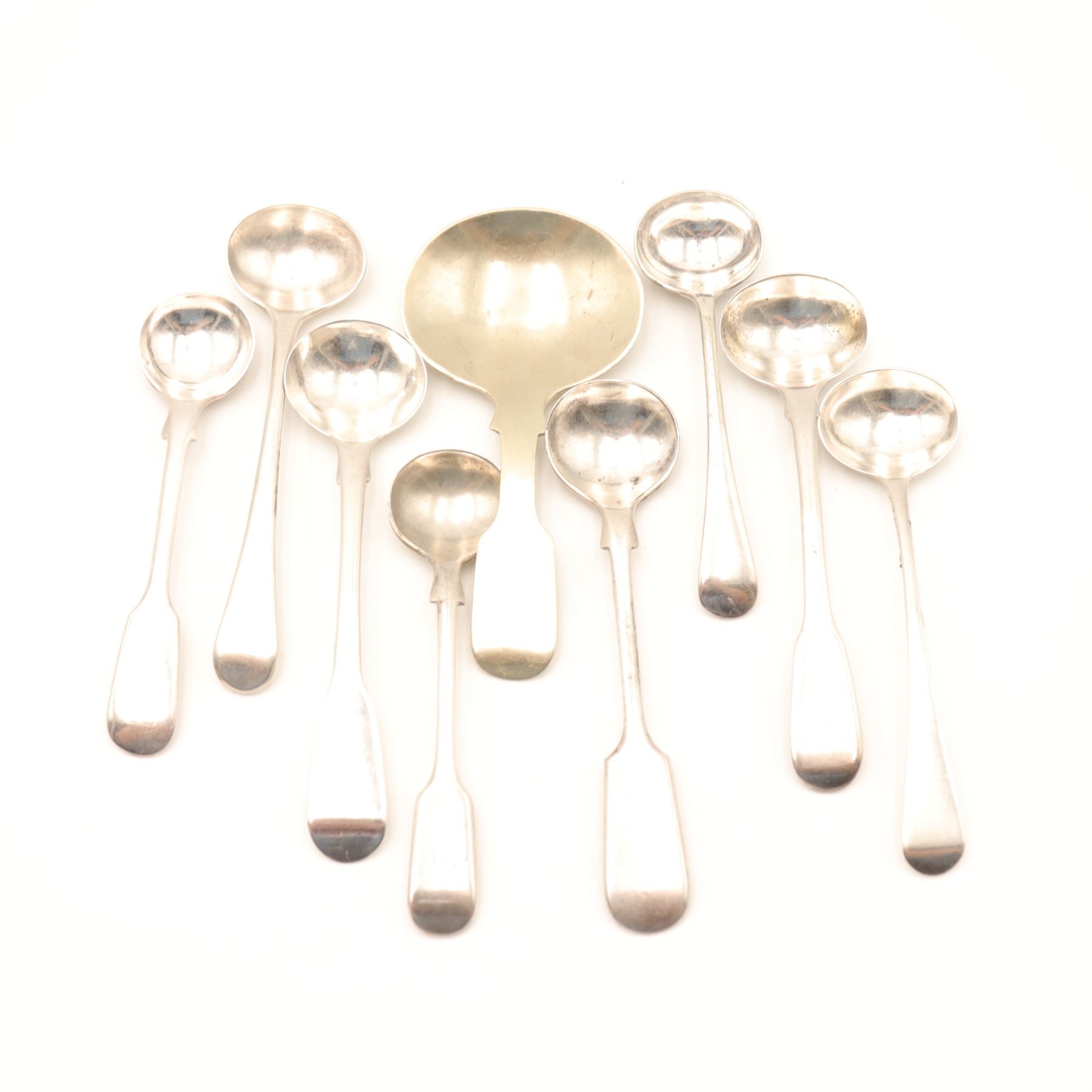 Assorted group of nine English sterling silver condiment spoons, 19th–early 20th century, comprising eight small salt/condiment ladles and one larger caddy or master salt spoon, all with fiddle-pattern or related flat handles and circular or shallow bowls, several with traces of original gilding. Each piece struck to the handle with standard British sterling hallmarks and maker’s marks for various silversmiths. Total combined weight approx. 108.92 g.
