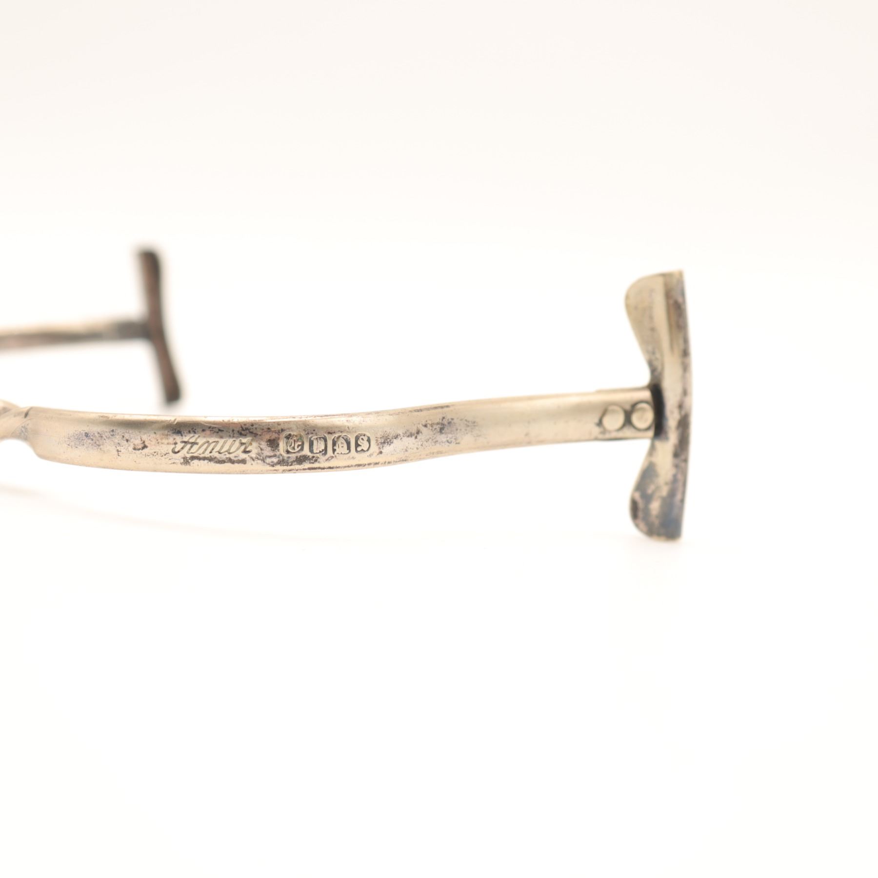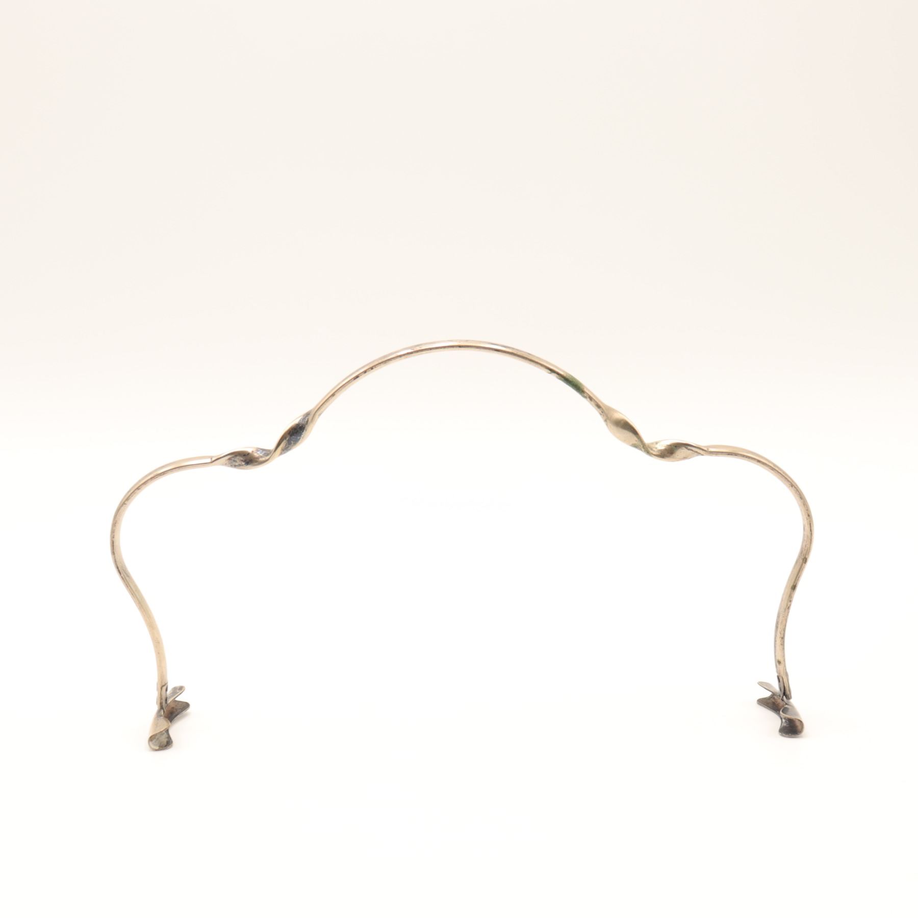 English sterling silver detachable swing handle for a serving or cake plate, Birmingham, early 20th century, the arched handle with subtle twist detailing to the upper section and plain flattened terminals formed as clips to grasp the rim of a circular plate. One side engraved with a script signature and struck with Birmingham sterling hallmarks and an indistinct maker’s mark. Suitable for use with a dessert, cake or biscuit plate. Plate shown in photographs is for display only and is not included with this lot.