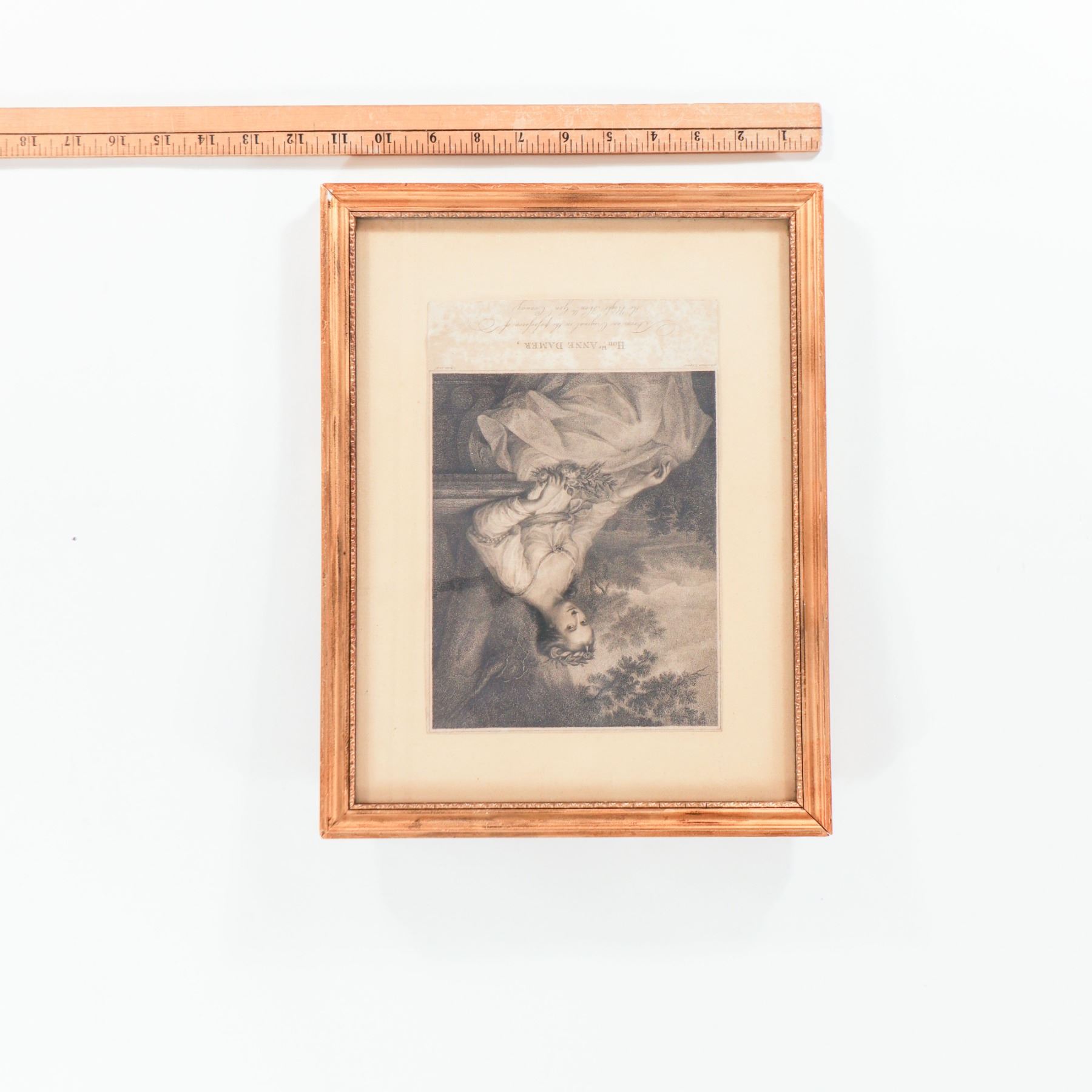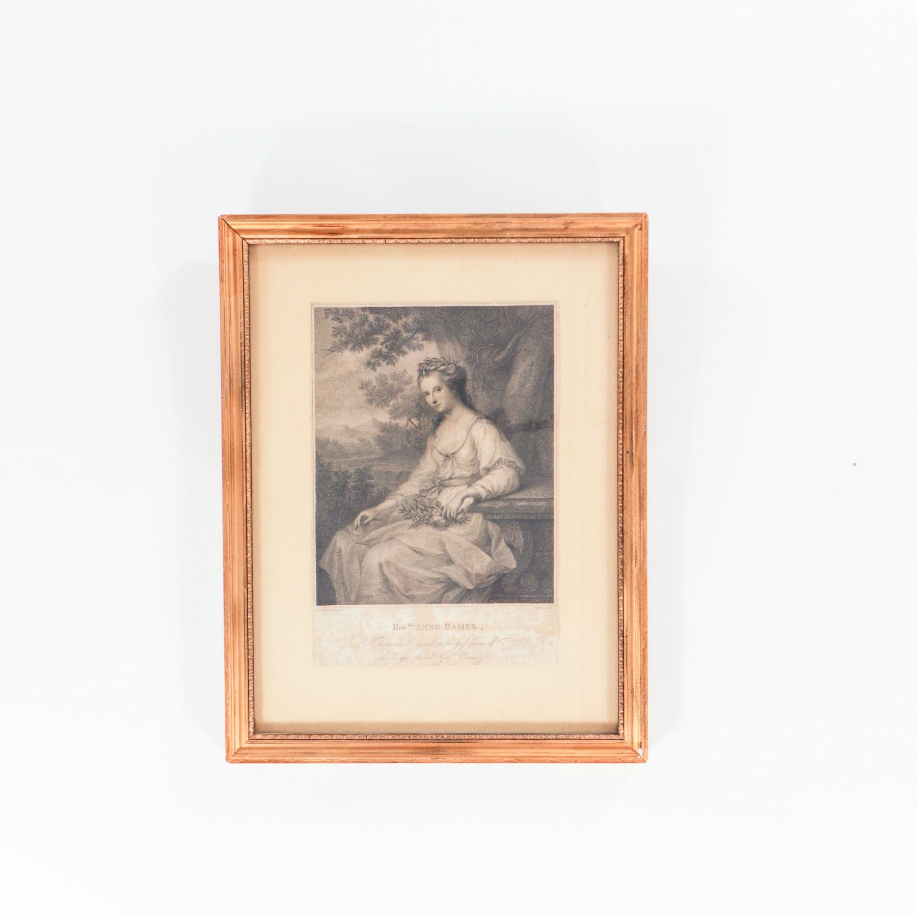 Early 19th-century British stipple engraving in sepia tones depicting a seated young woman in classical dress, identified in the lower margin as “The Hon. Anne Damer”. Shown three-quarter length in an outdoor setting, a laurel wreath in her hair, holding a spray of flowers and resting one arm on a stone ledge, with trees and distant landscape beyond. Finely worked stipple and line engraving on wove paper, with full title and publication details printed below (partially obscured by the mount). Presented in a later gilt-composition frame with plain cream mount, glazed.