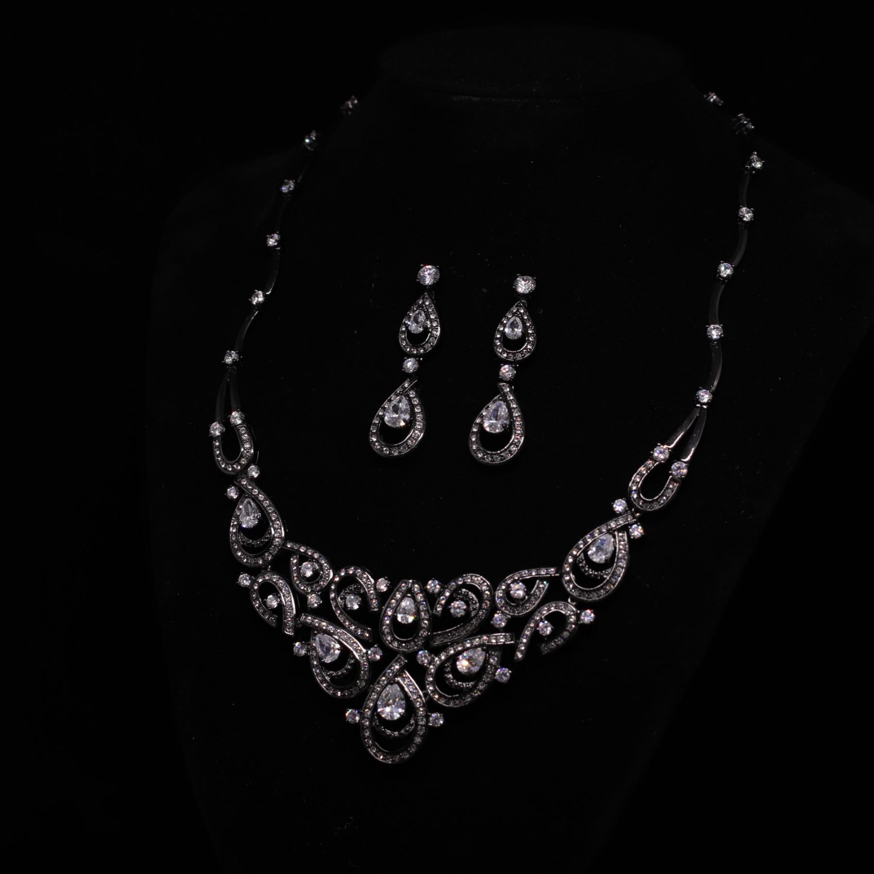 Elegant rhodium-plated necklace and matching drop earrings from the Fifth Avenue Collection. Each piece is set with brilliant clear rhinestones in teardrop and scroll motifs. Perfect condition, unworn look. In orogonal box.