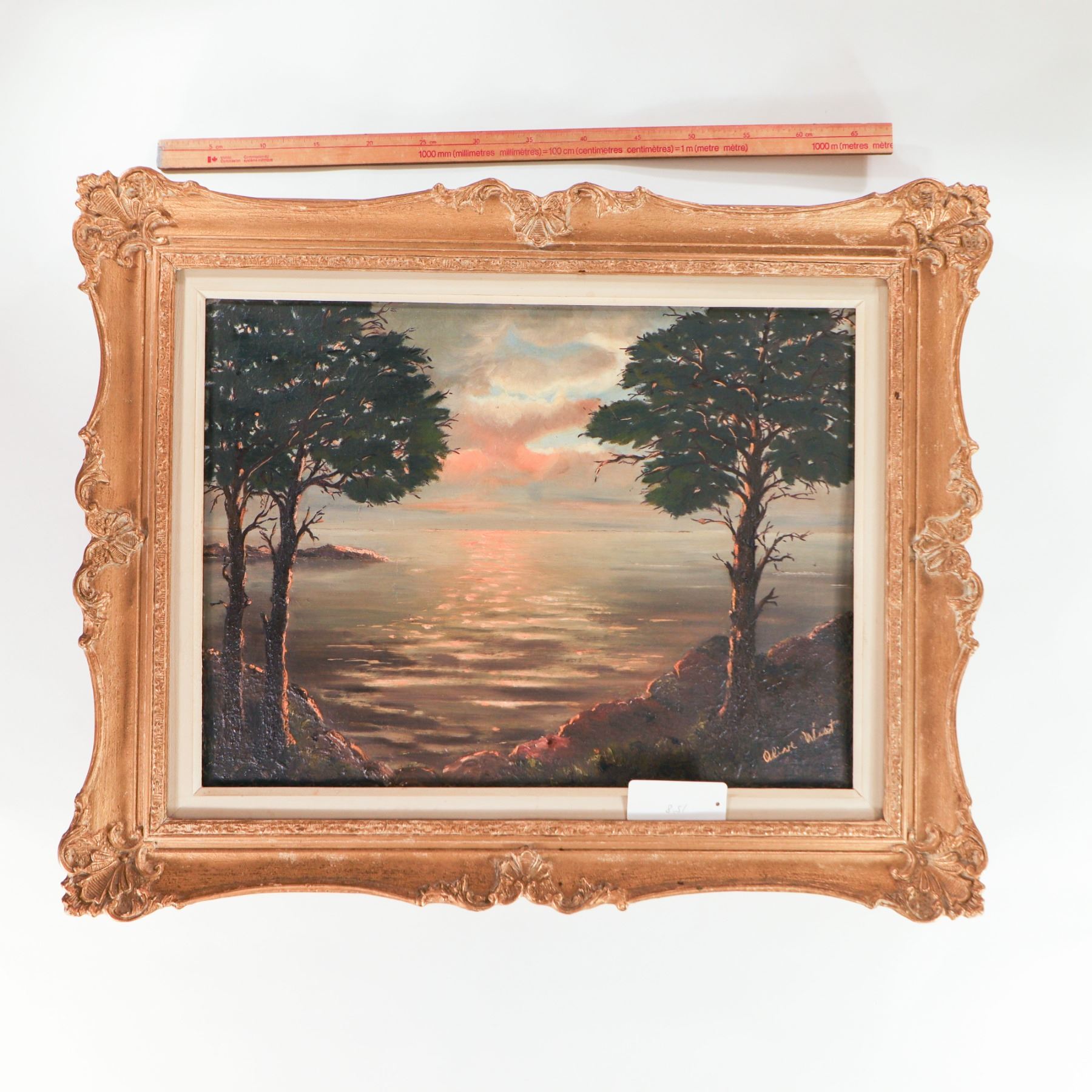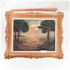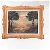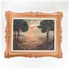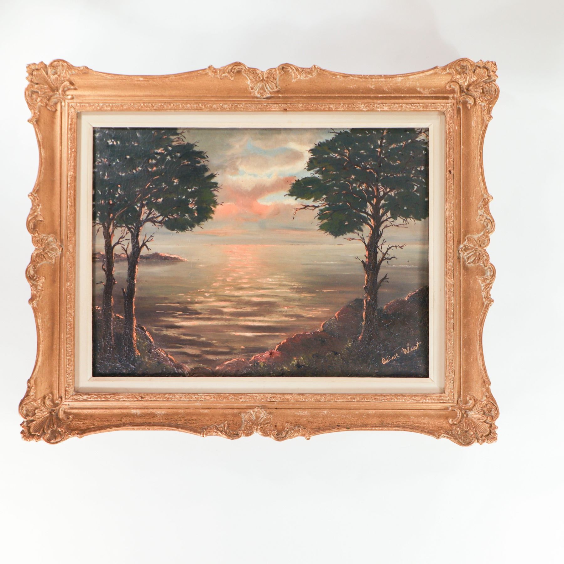 Mid-20th century oil on canvas depicting a dramatic sunset over a calm coastal inlet, the sky filled with soft pink and blue clouds reflected in the water below, flanked by dark silhouetted pines and rocky headlands at left and right. Indistinctly signed at lower left. Presented in an ornate gilt-composition frame with scrolling rococo-style corners and a later cream-painted inner liner. Overall approx. 32–34 in. high x 28–30 in. wide (frame); sight size approx. 23–25 in. x 19–21 in.