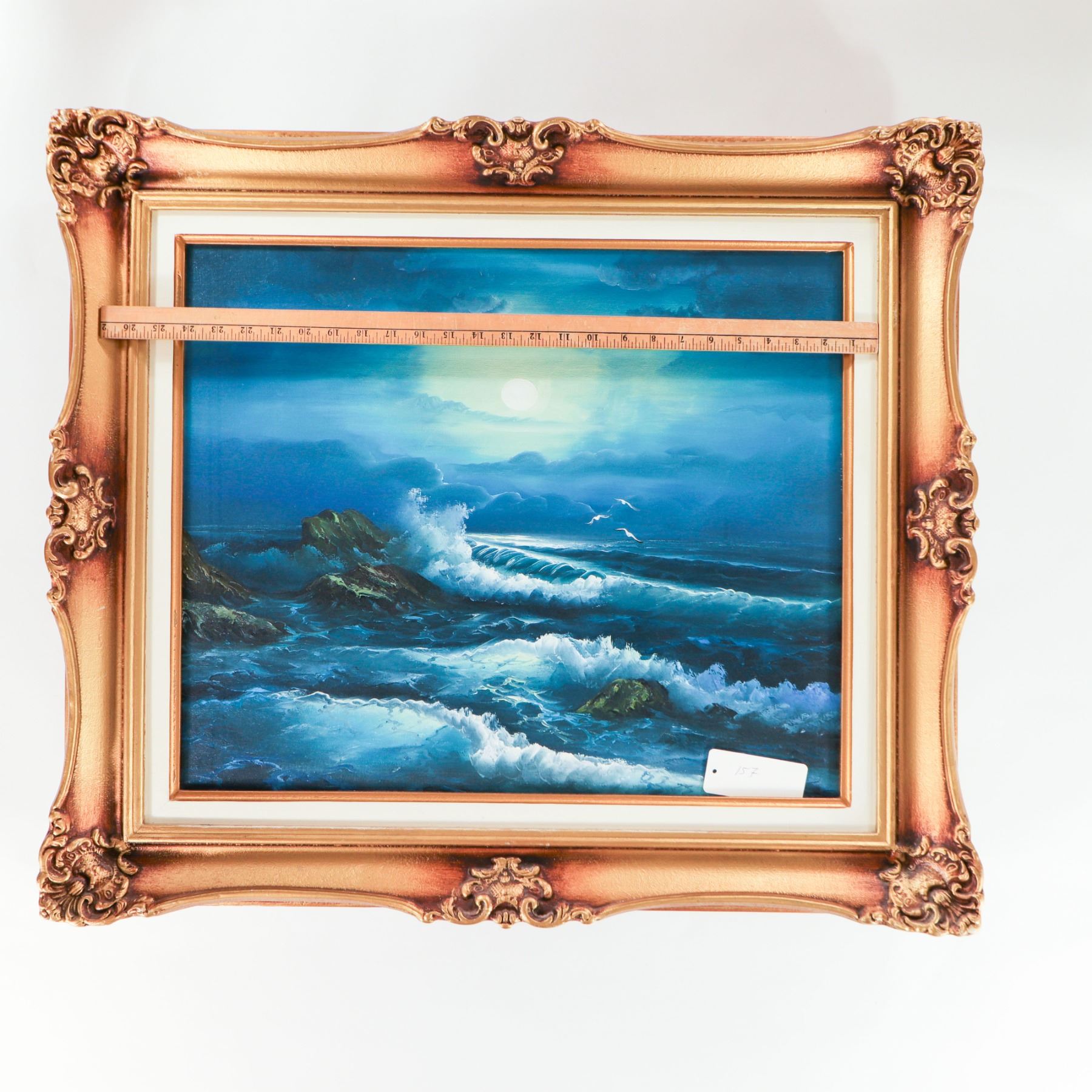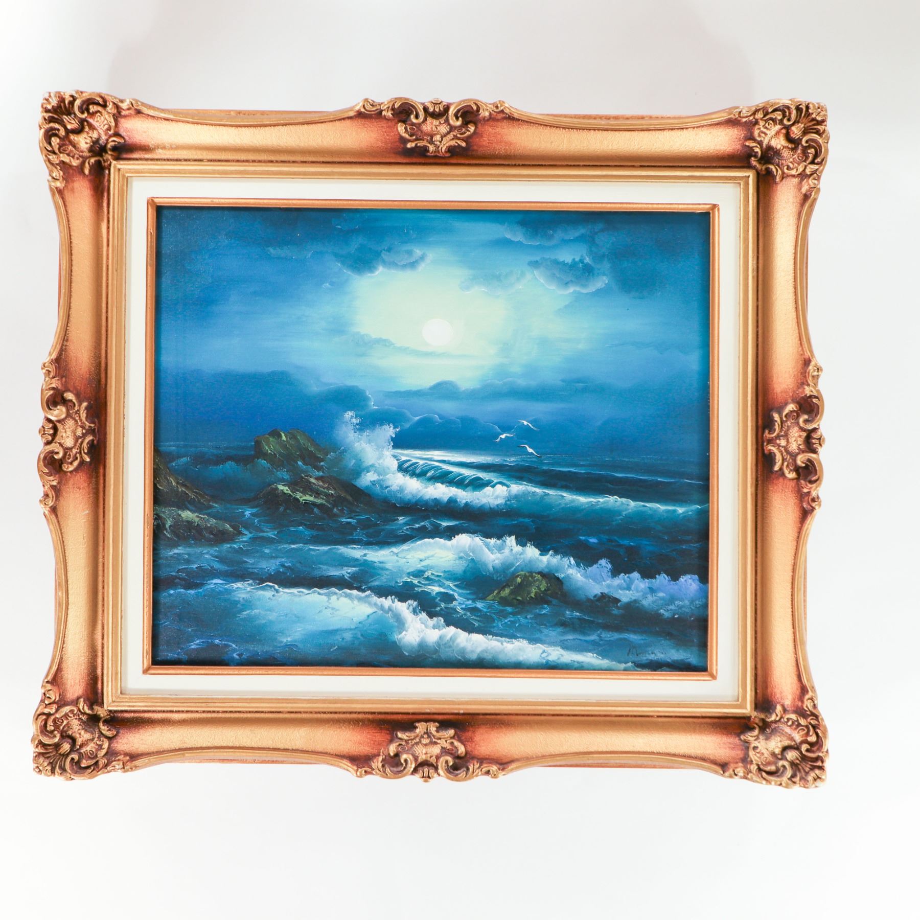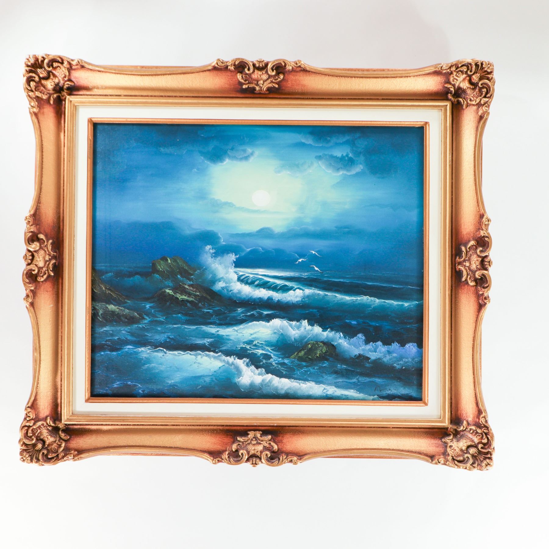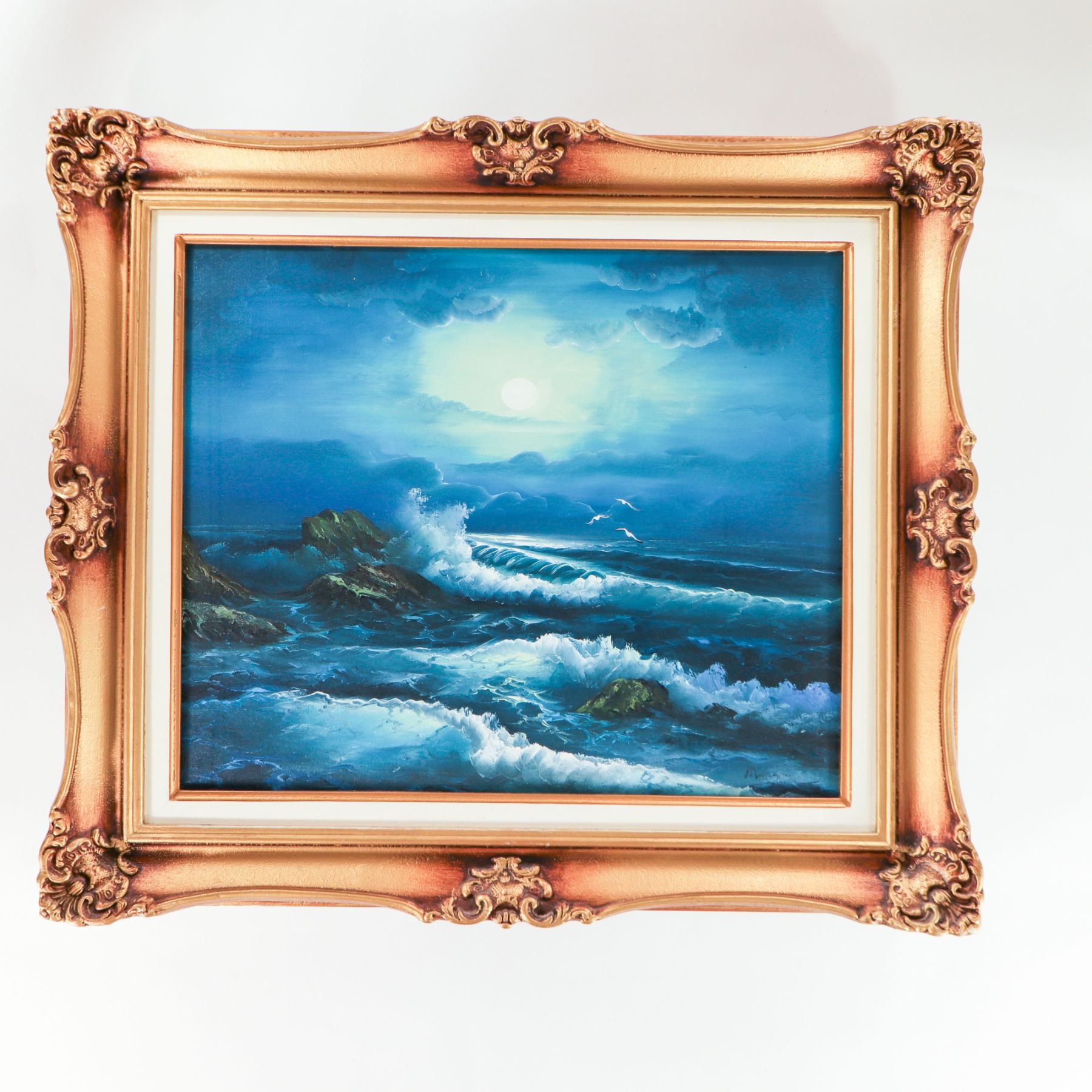 Mid–late 20th century oil on canvas depicting a dramatic moonlit seascape, with a glowing full moon breaking through layered clouds at left and illuminating crashing waves against dark rocky cliffs at right, a few white seabirds wheeling above the surf. Executed in a rich palette of blues and turquoise with green highlights to the rocks and soft yellow around the moon. Unsigned (as visible). Presented in an ornate gilt and copper-toned molded frame with rococo-style corner and center ornaments and a cream inner liner. Overall approx. 30–32 in. high x 26–28 in. wide; sight size approx. 20–22 in. x 16–18 in.