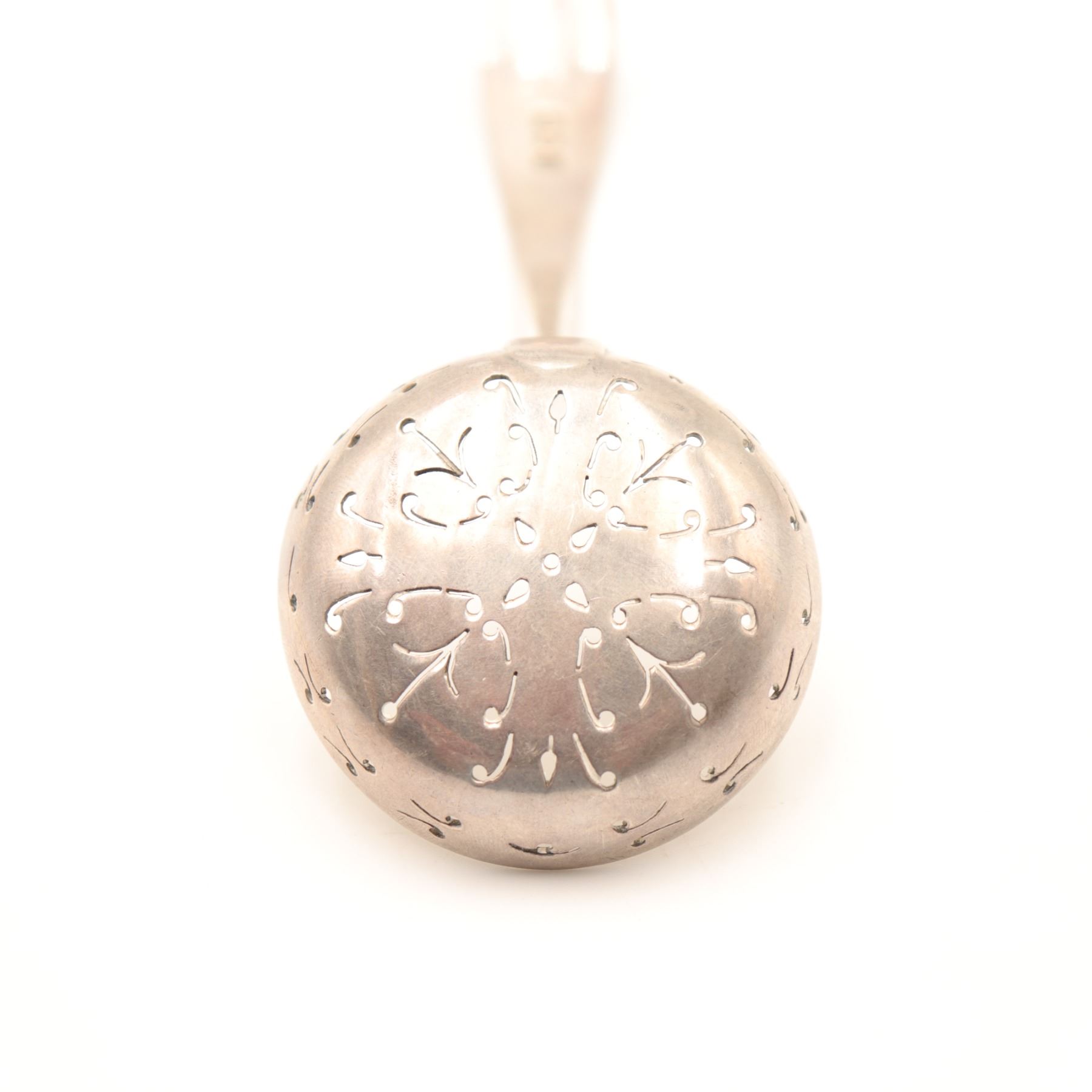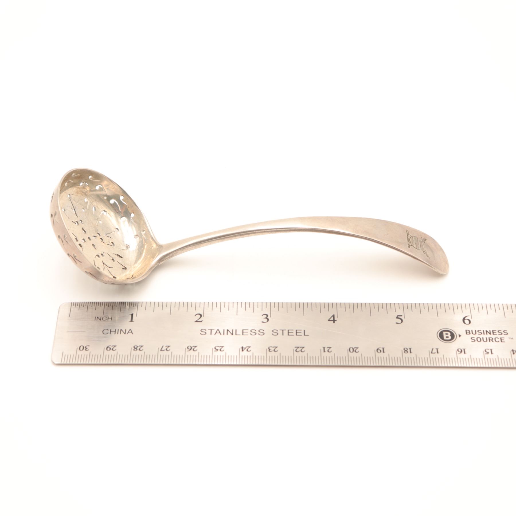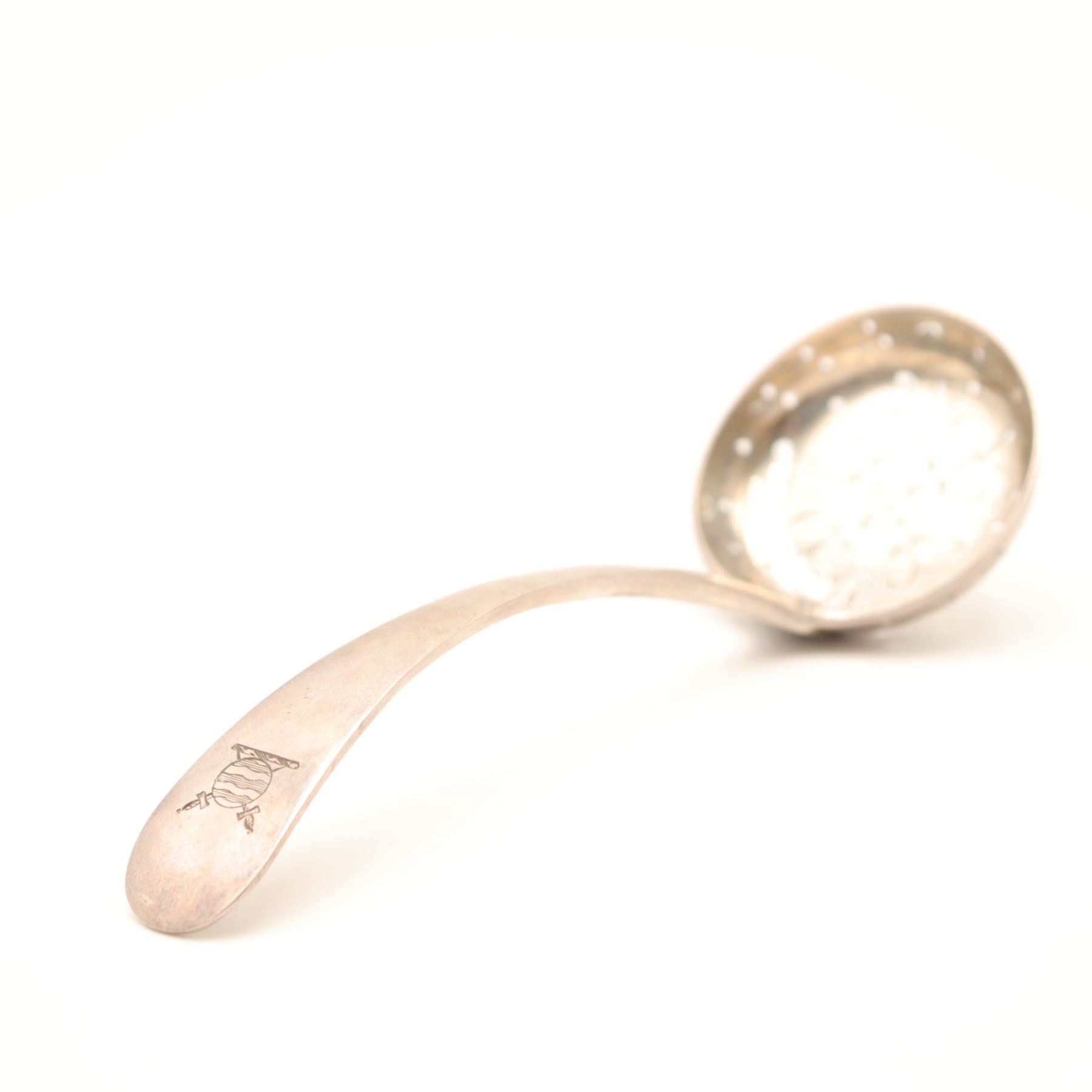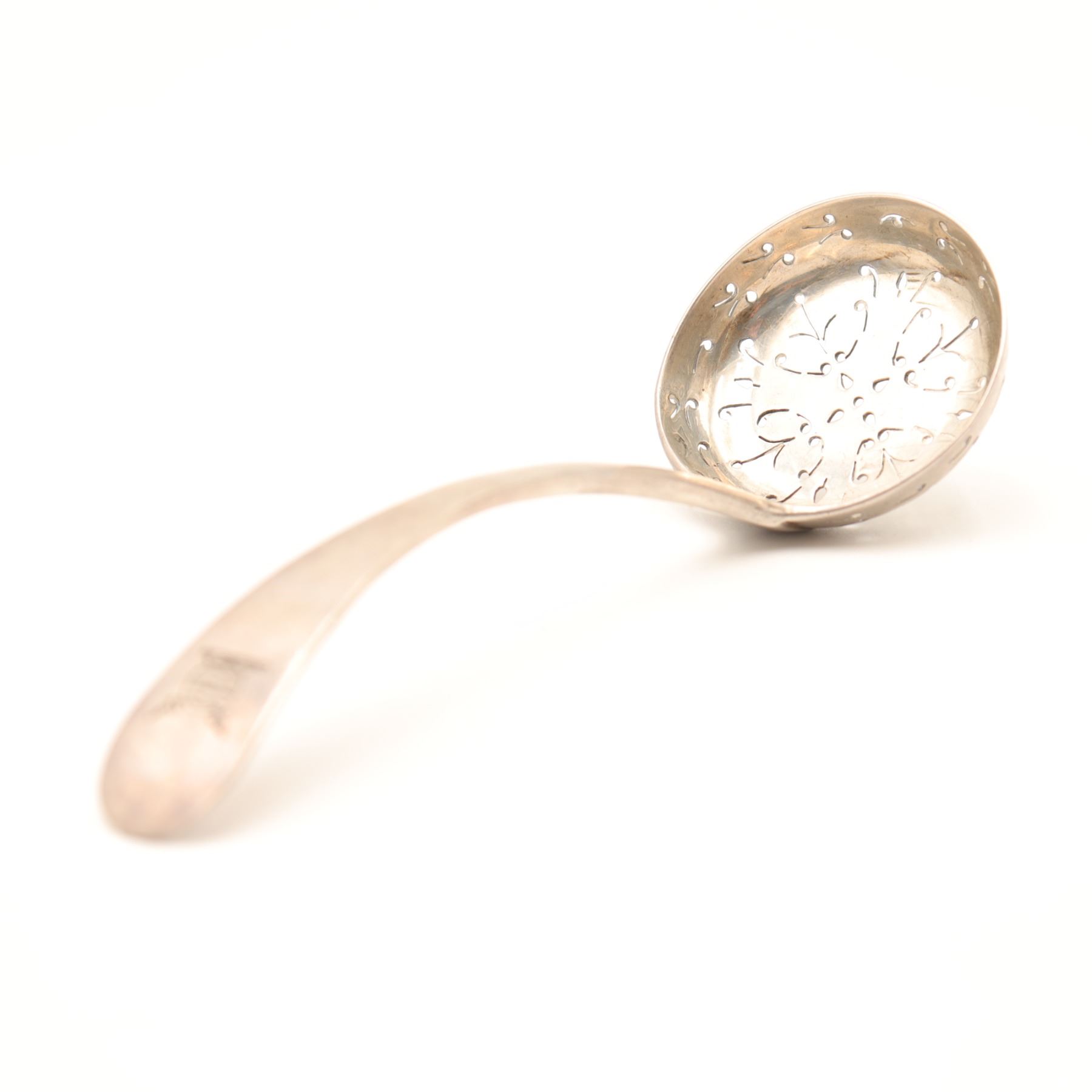 George III English sterling silver pierced ladle, London, early 19th century, the deep circular bowl finely pierced with conforming scroll and dot pattern for straining, on a gently downcurved Old English handle engraved with script monogram to the terminal. Terminal struck with London sterling hallmarks and indistinct maker’s mark. Approximate weight 57.75 g.