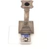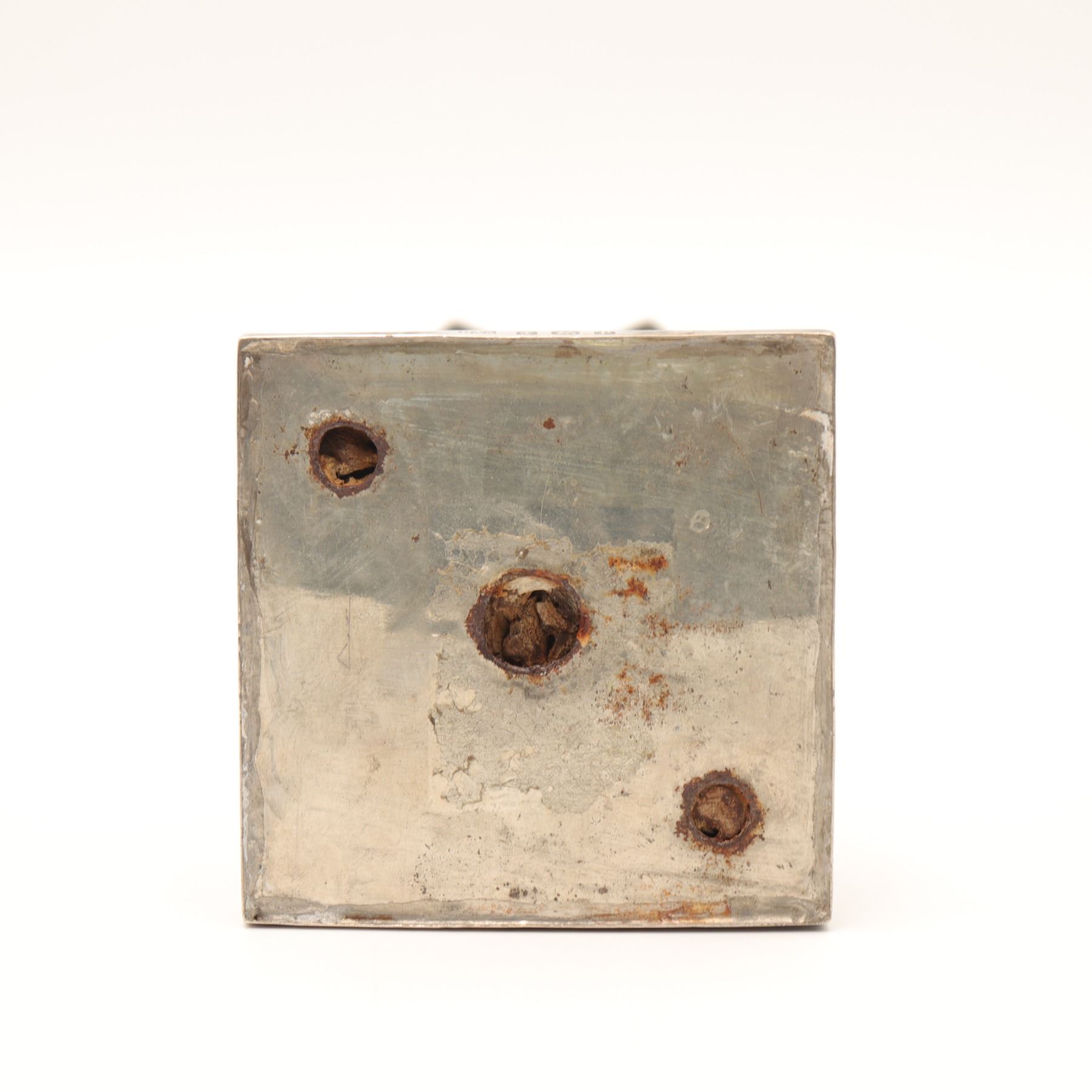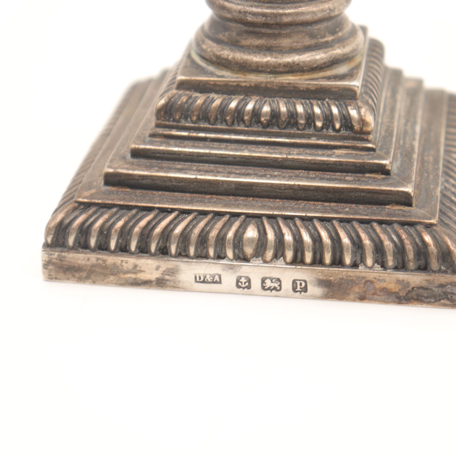 A George V sterling silver candlestick of Regency revival Corinthian column form, by Daniel & Arter, Birmingham, 1914. The square stepped base with gadrooned border rising to a fluted column and ornate Corinthian capital, supporting a square drip-pan with beaded rim and circular candle socket. Hallmarked to the side of the base with maker’s mark D&A, anchor for Birmingham, lion passant for sterling and date letter ‘p’ for 1914. Weighted (loaded) construction, total weight approx. 481 g. Condition: Moderate, even tarnish and surface wear commensurate with age and use. Minor edge knocks and small dints to base and column but no obvious splits or repairs noted. Candle socket with light wax residue. Presents well and would respond attractively to a light professional polish. (Approx. height 17–18 cm.)